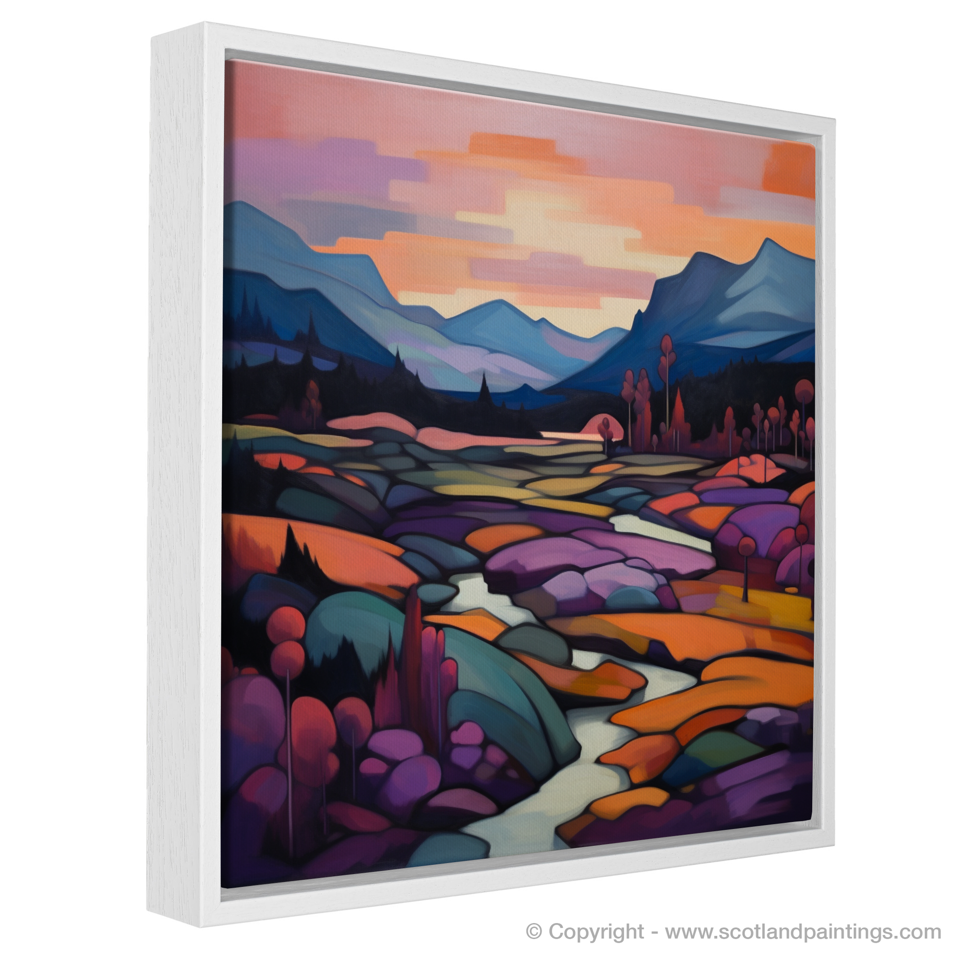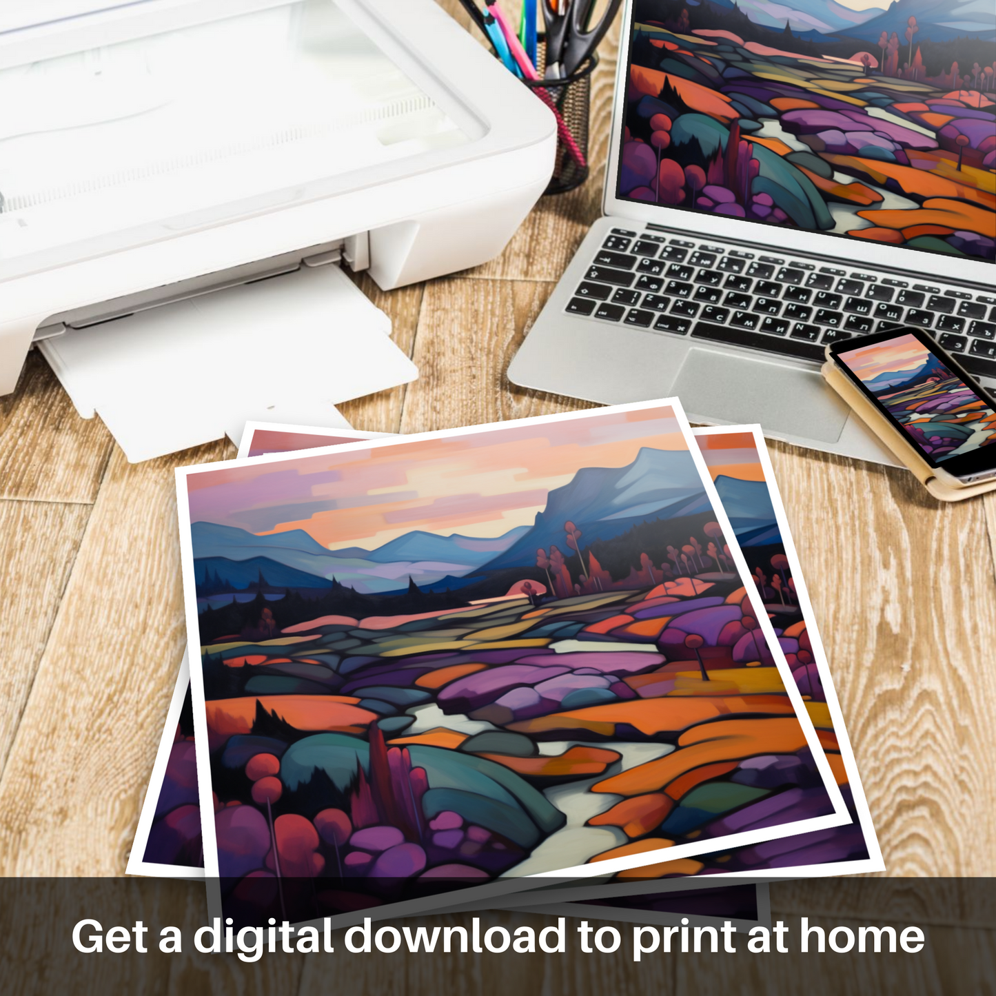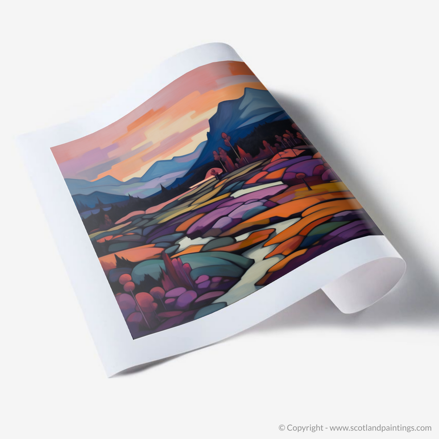 Dusk descends upon the wild and rugged landscape of Glencoe, immortalised here in this exquisite Cubist-inspired print that captures the essence of the twilight hour. Allow your senses to be enveloped by the vivid shades of sunset reflecting off the crowberry patches, rendered in an array of purples, oranges, pinks, and blues. This print transports viewers to an ethereal realm where the natural grandeur of Glencoe is distilled into geometric forms and bold colours.