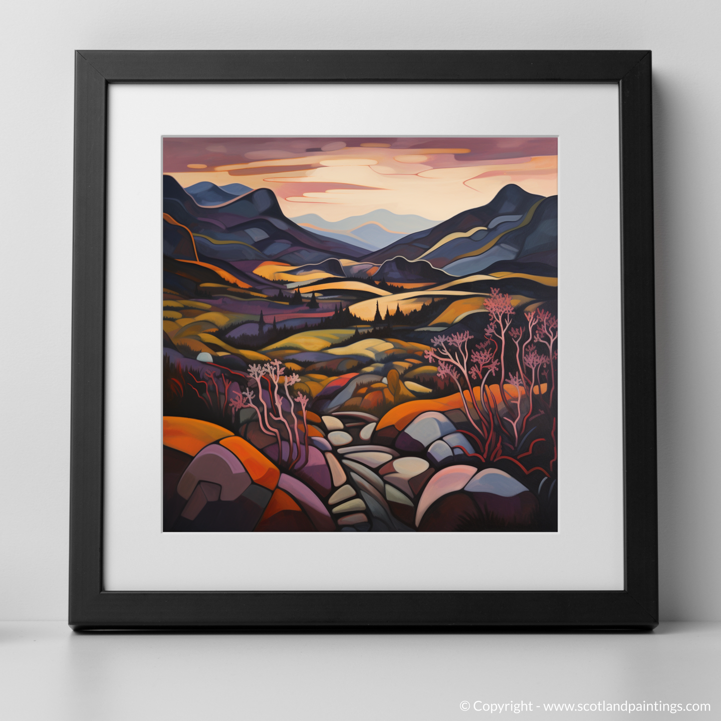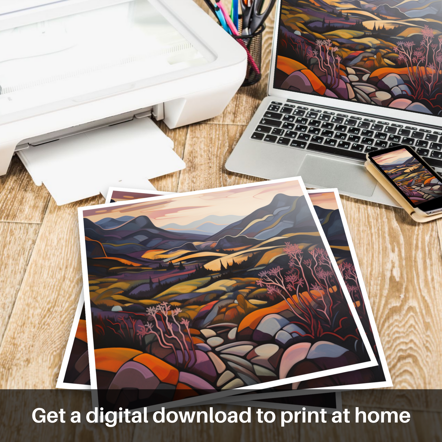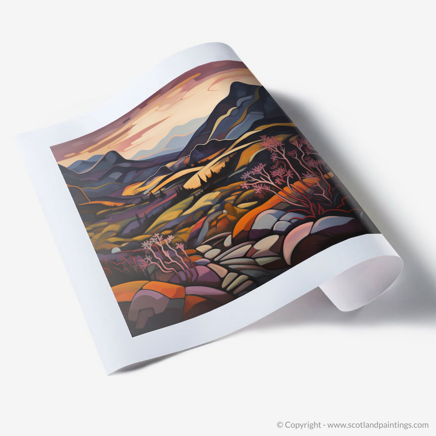 Immerse your senses in the vibrant interplay of colours and shapes with our captivating print. Highlighting the unique beauty of crowberry patches at dusk, this artwork reimagines Glencoe’s enchanting landscape through the prism of Cubism, offering a fresh and dynamic perspective.