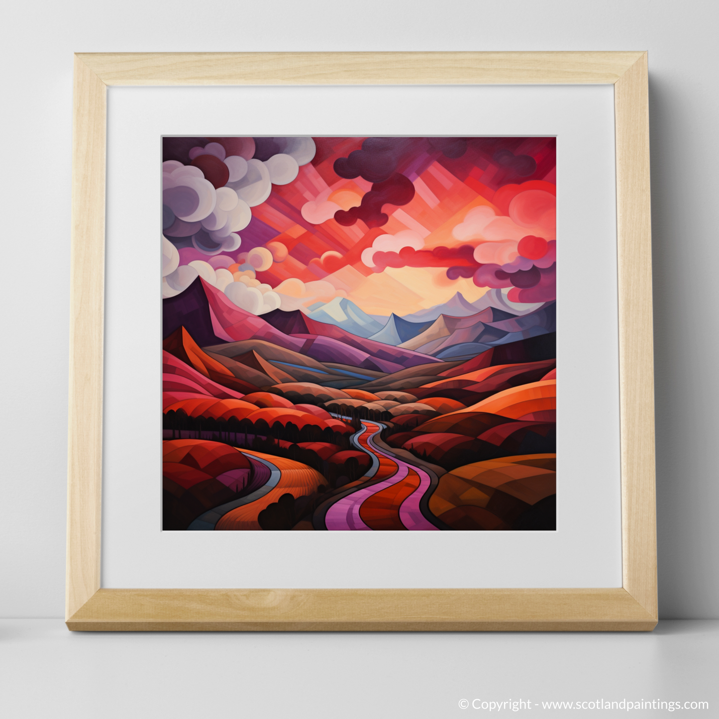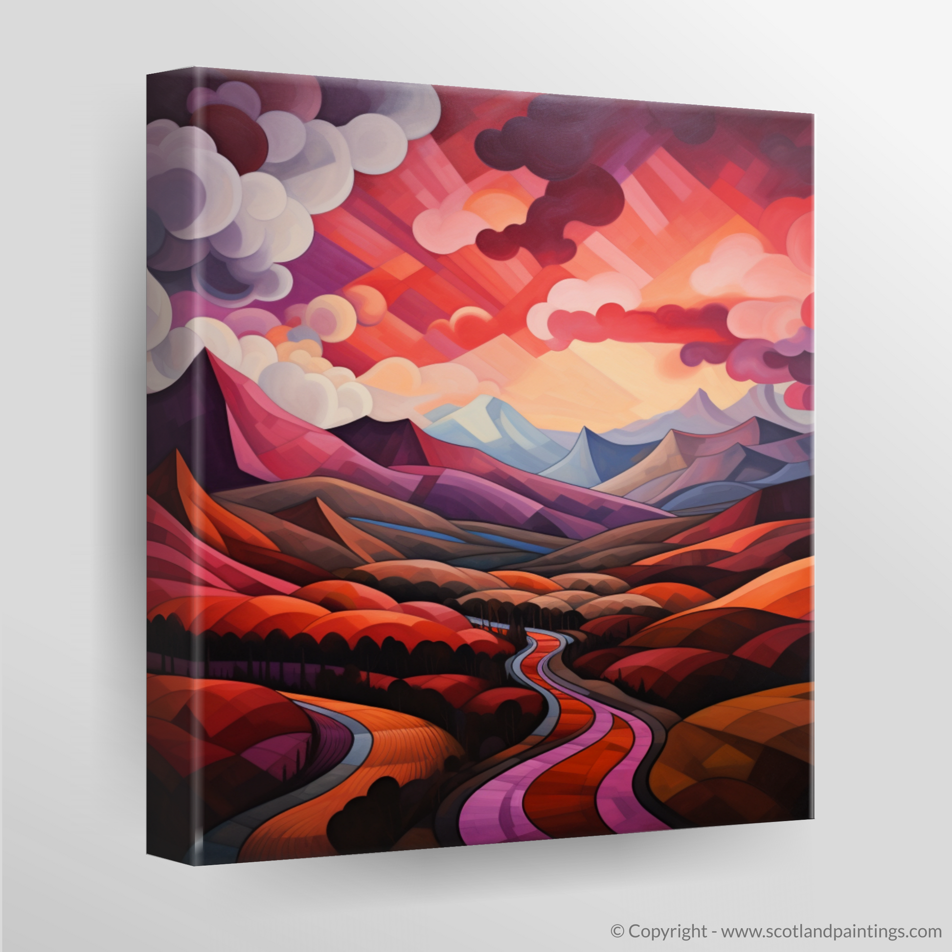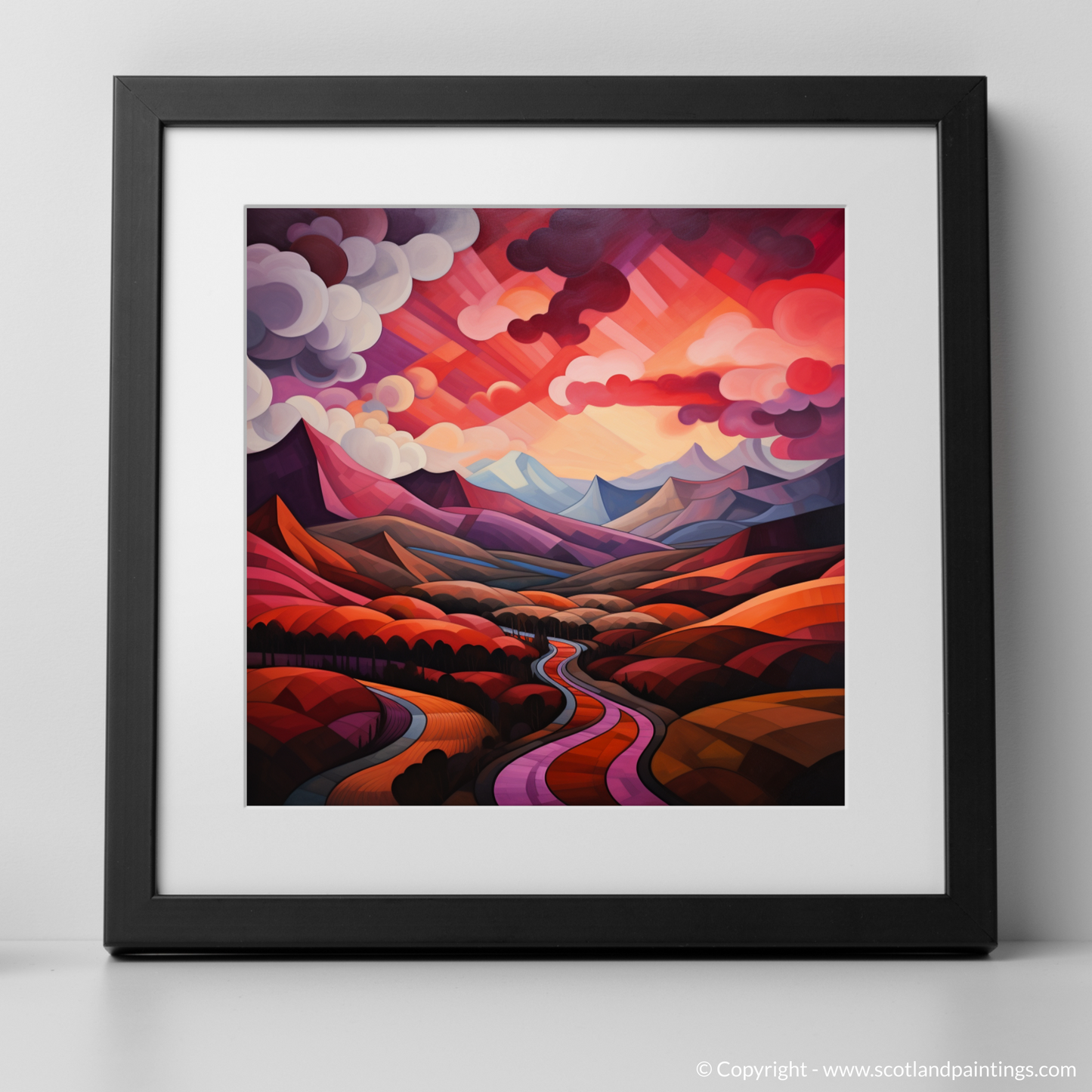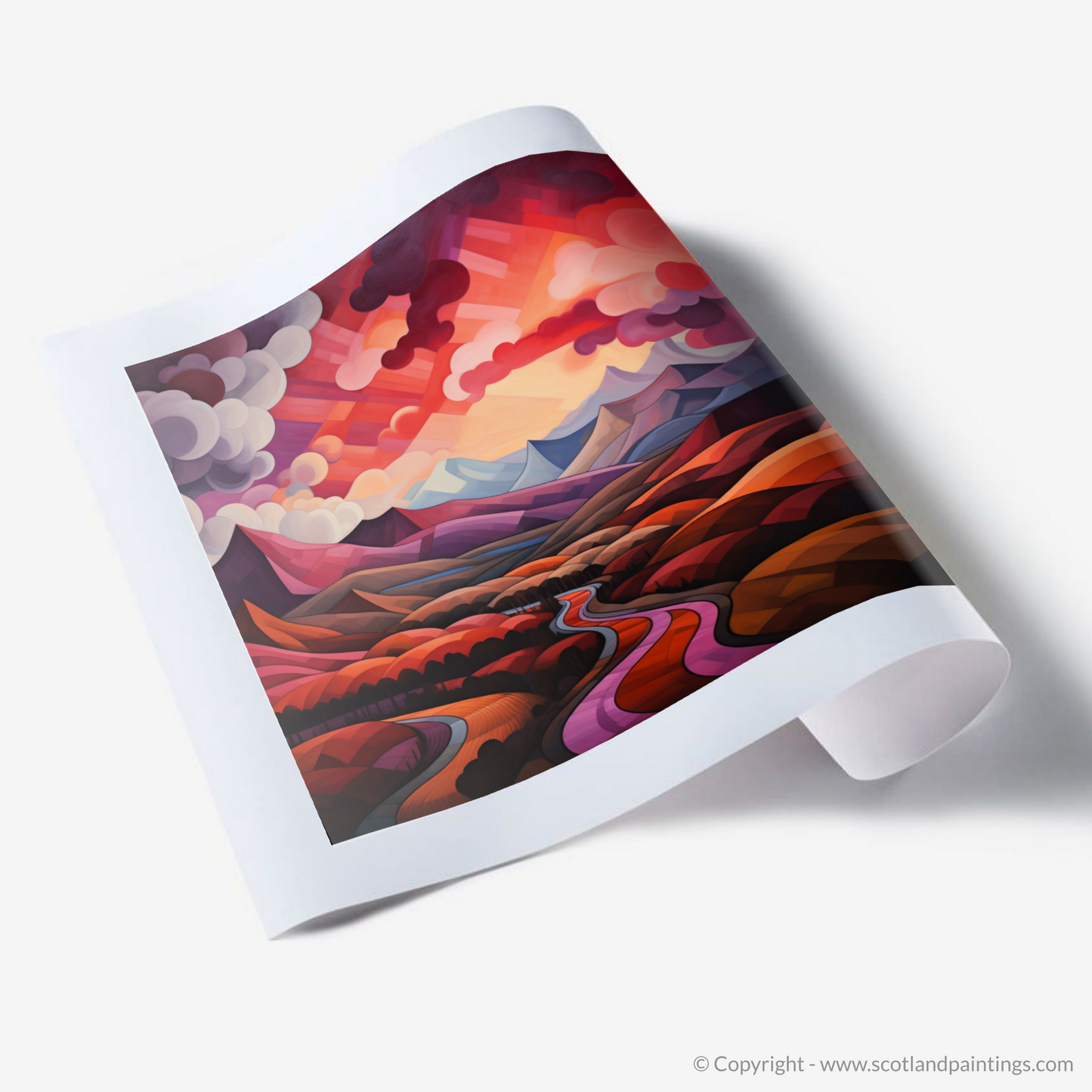 Immerse yourself in the geometric grandeur of Scotland's natural charm with this exquisite print, where the iconic crimson clouds over the valley in Glencoe are reimagined through the lens of cubism. The tapestry of angular forms and fragmented landscapes fuses to create a visual symphony, echoing the tumultuous beauty of the Highlands.