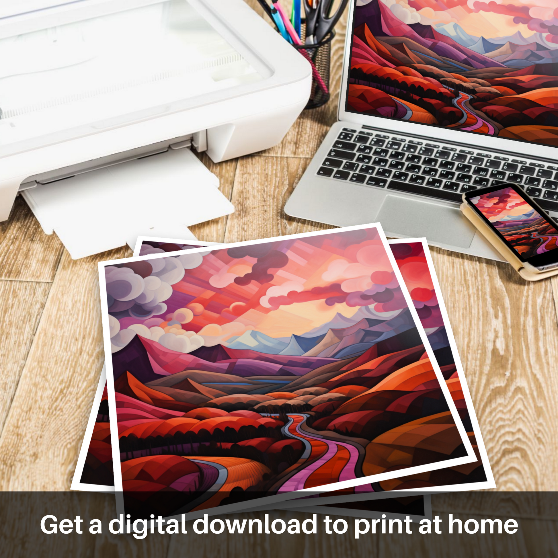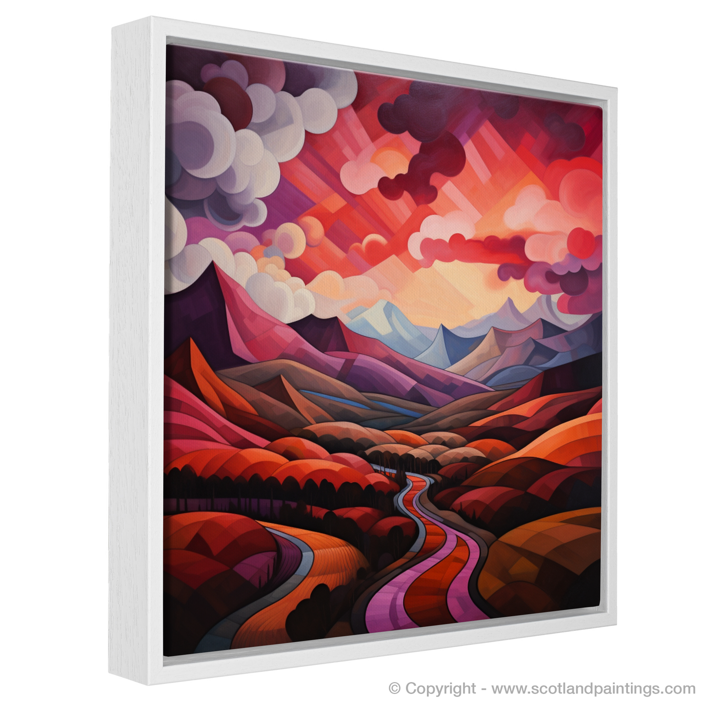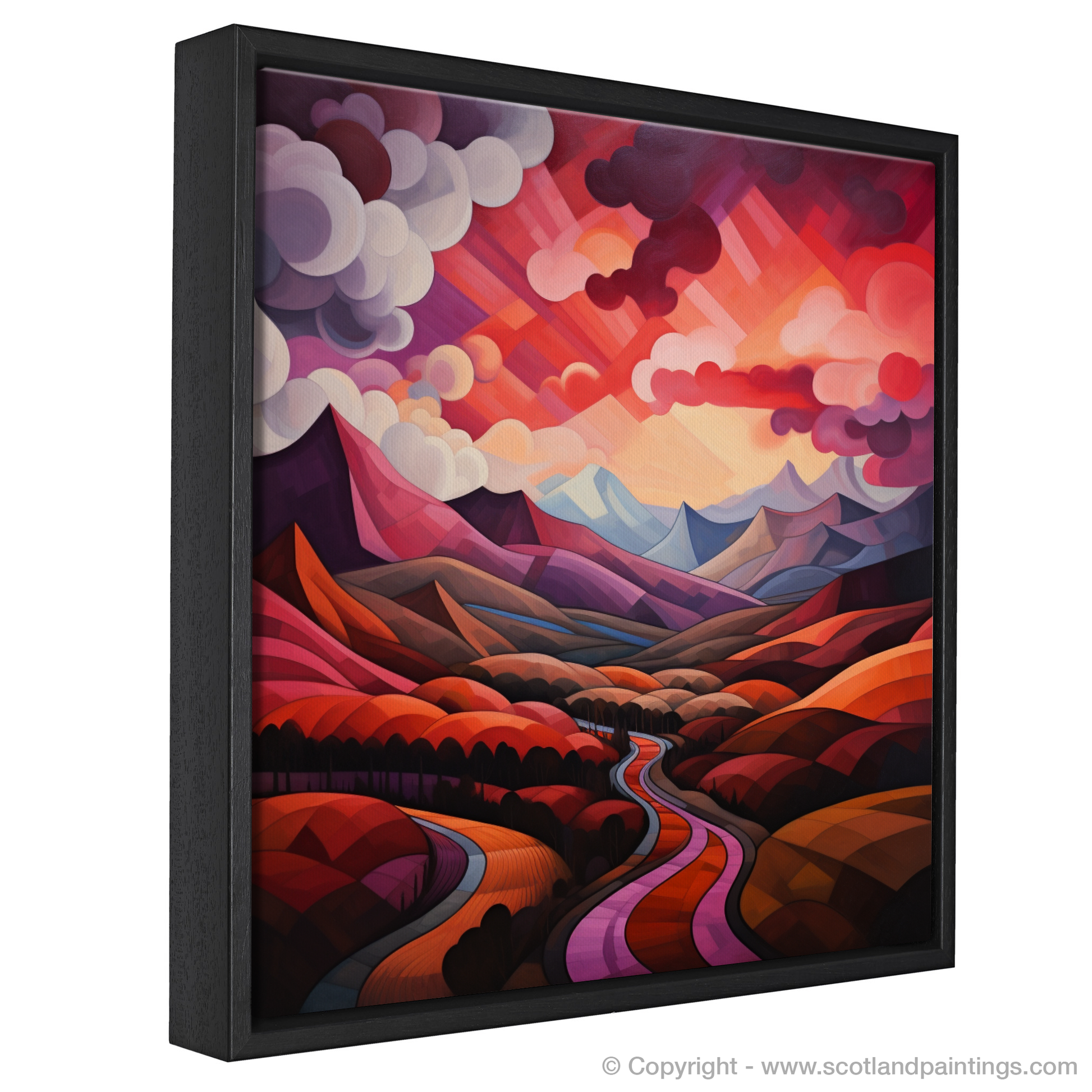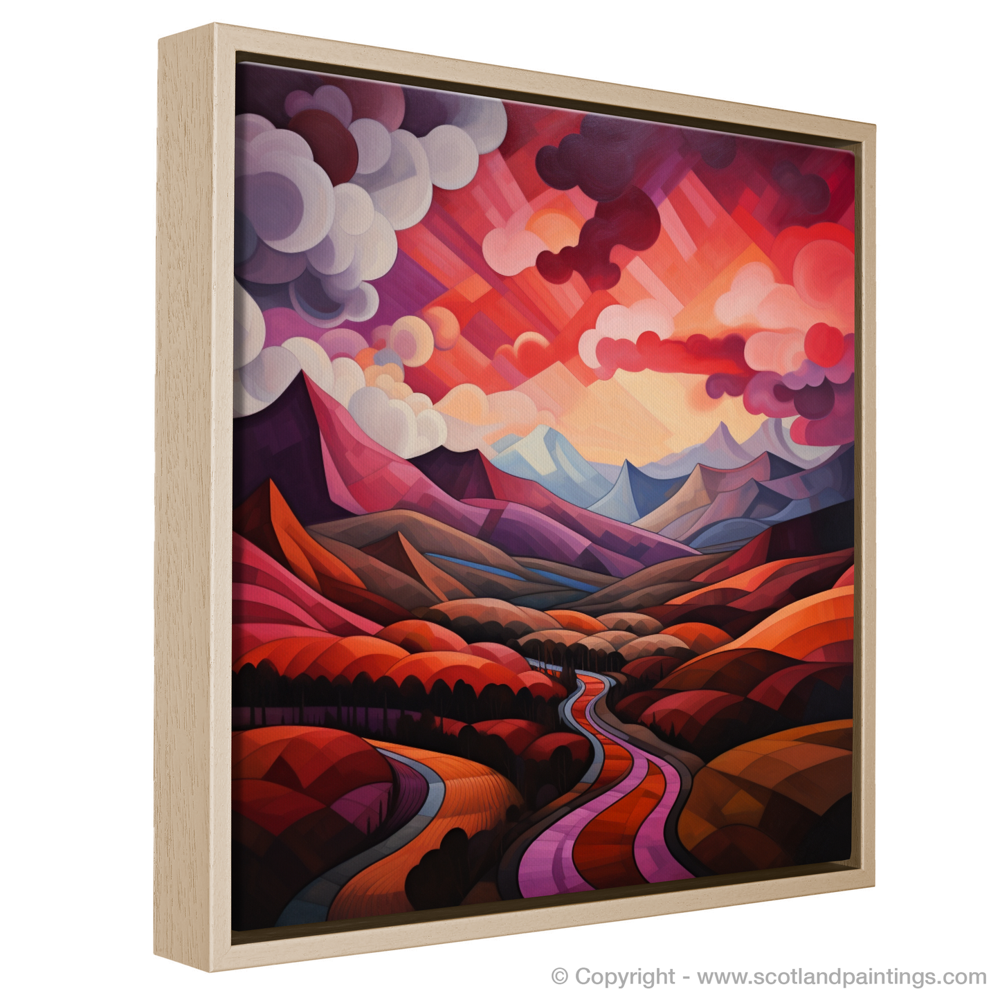 Immerse yourself in the geometric grandeur of Scotland's natural charm with this exquisite print, where the iconic crimson clouds over the valley in Glencoe are reimagined through the lens of cubism. The tapestry of angular forms and fragmented landscapes fuses to create a visual symphony, echoing the tumultuous beauty of the Highlands.