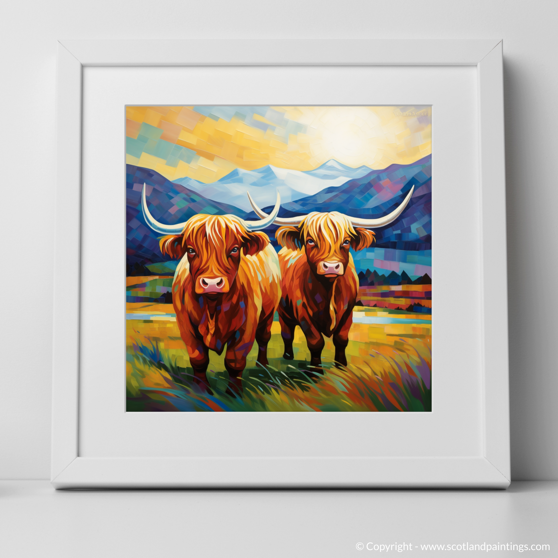 Immerse yourself in the untamed charm of the Scottish Highlands with this captivating print, a Cubist homage to the majestic Highland cows set against the picturesque backdrop of Glencoe. Bold, geometric planes of colour fragment the landscape into an abstract tapestry that blurs the lines between the natural world and the visionary perspective of the avant-garde.