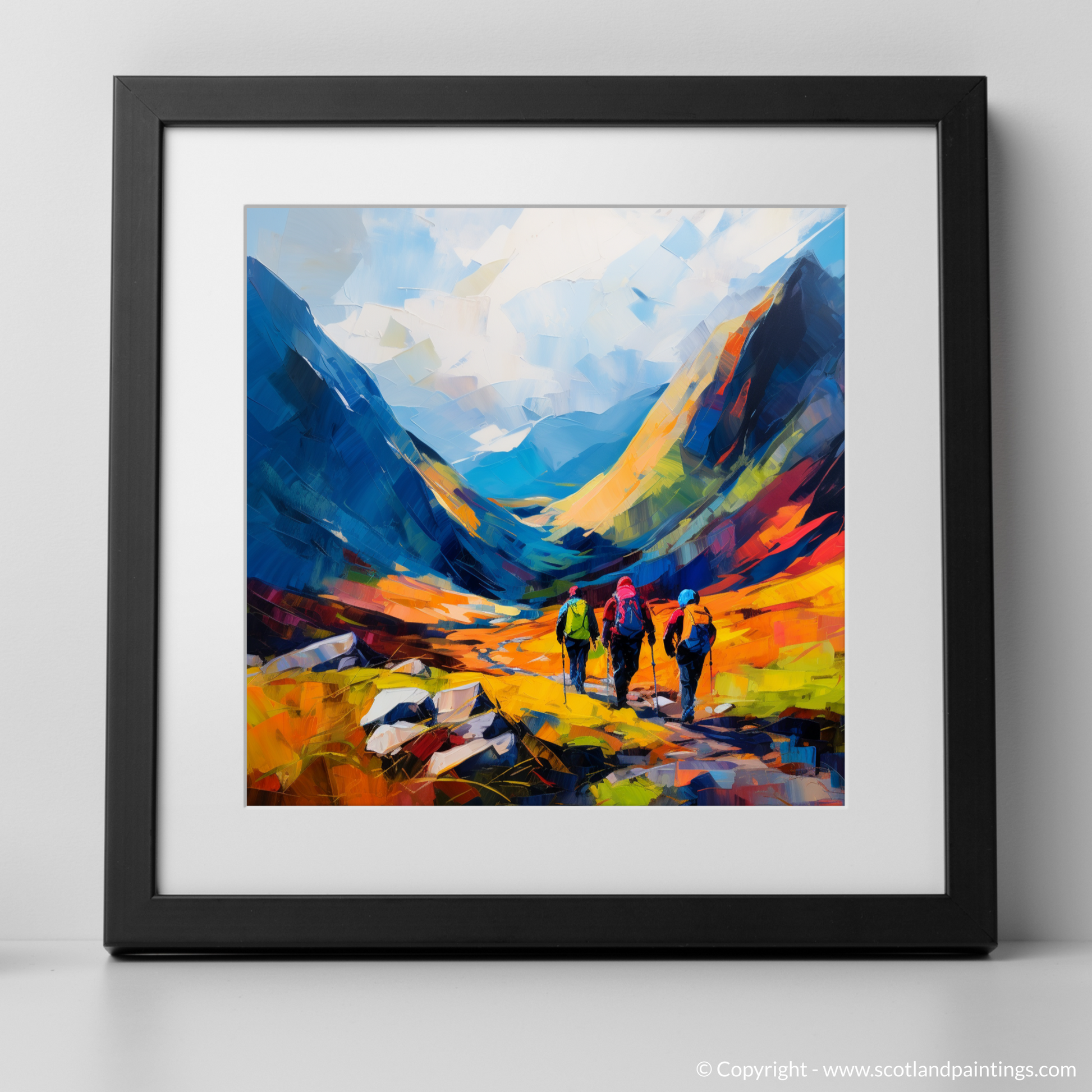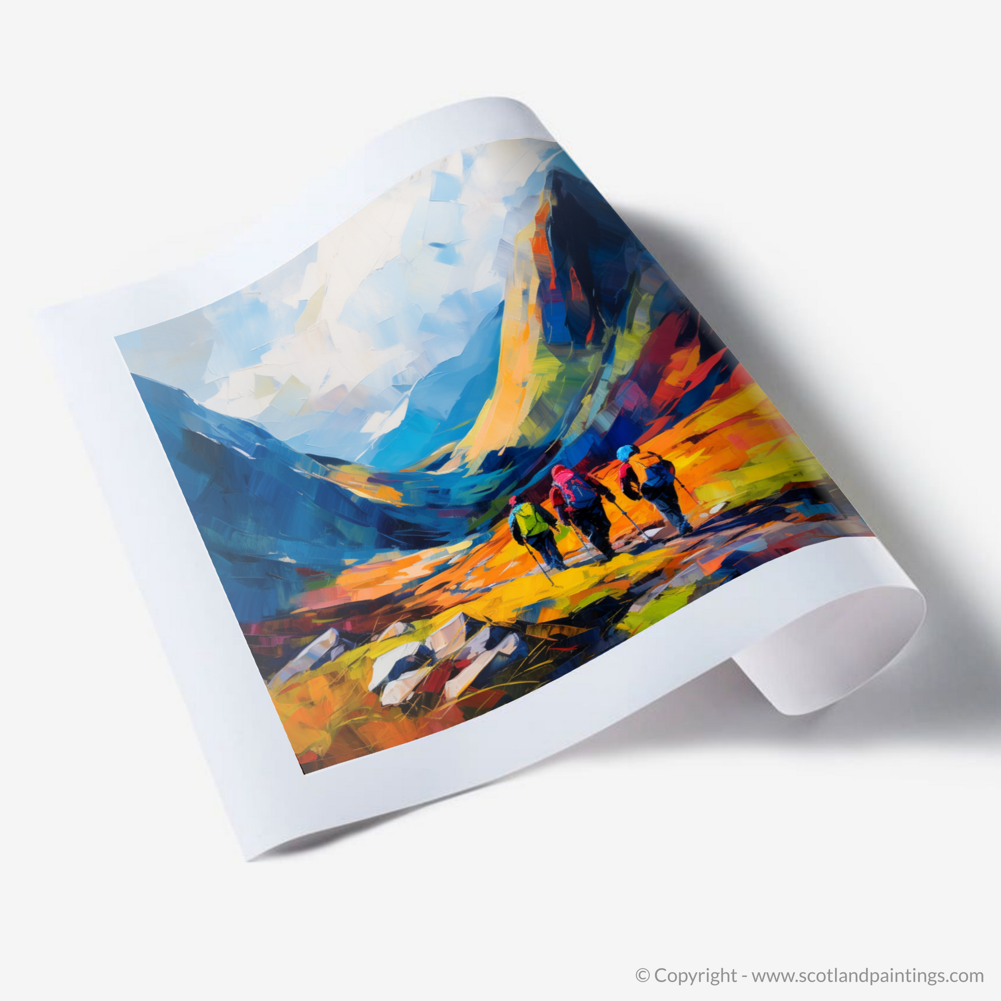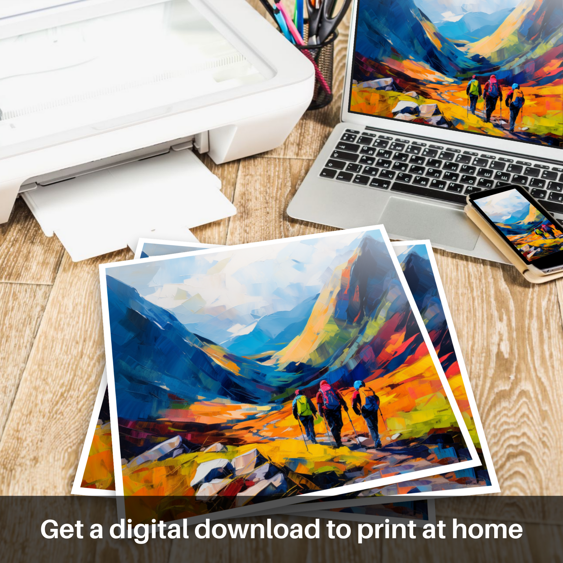 Step into a world where the rugged beauty of Glencoe's landscapes is reimagined through the bold and transformative strokes of cubism. This vibrant print captures the essence of adventure as a group of hikers embarks on their journey at the trail's head, a moment frozen in time and fragmented into the multitude of shapes and colours that define the cubist style.