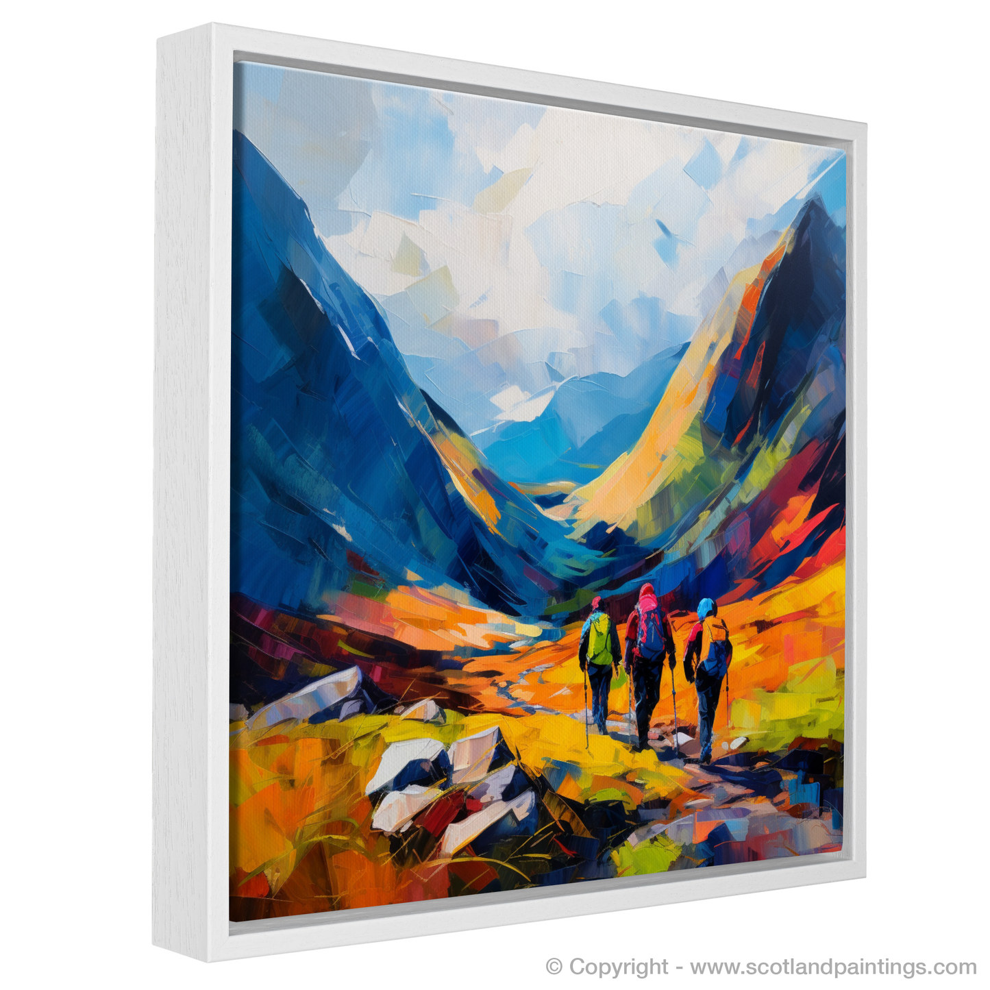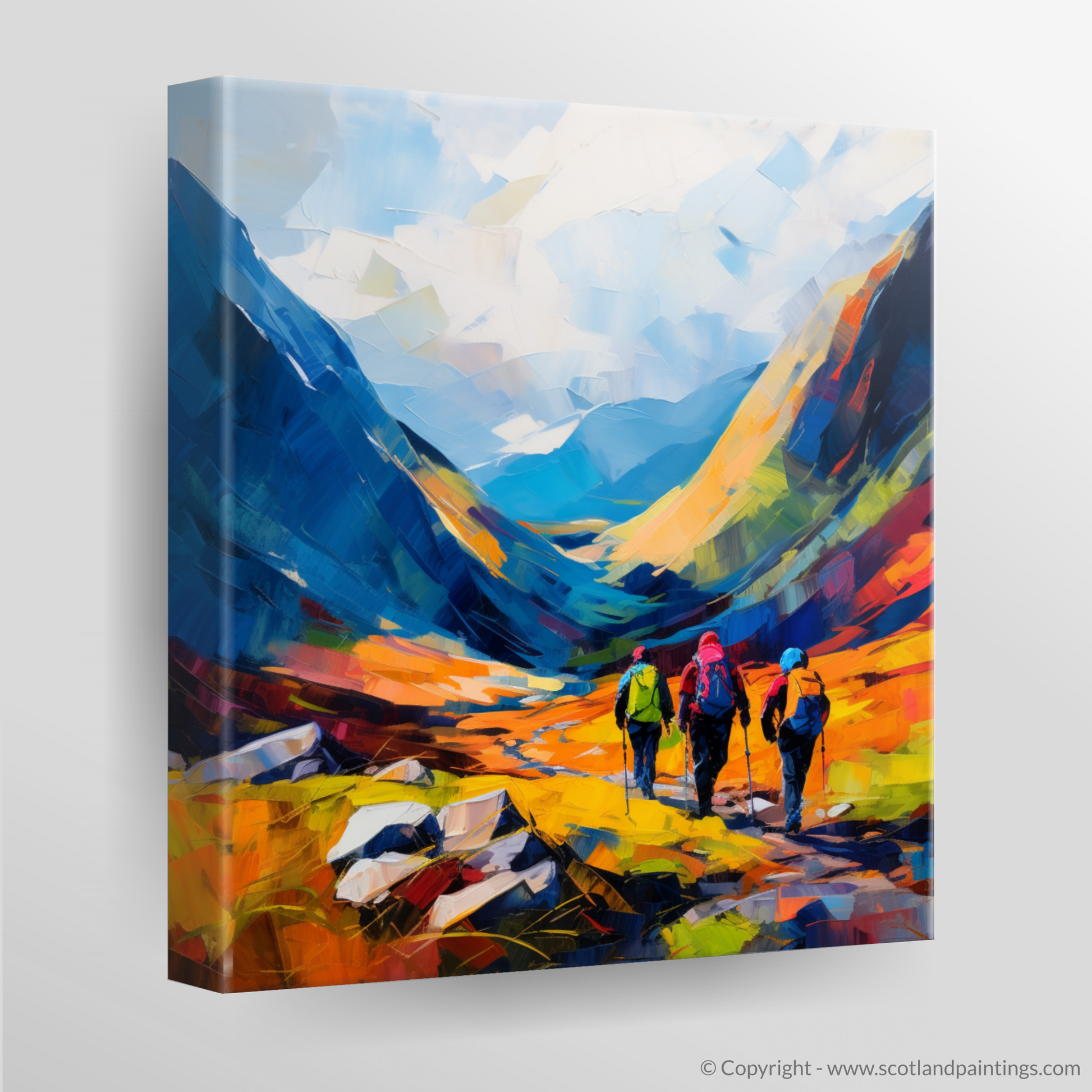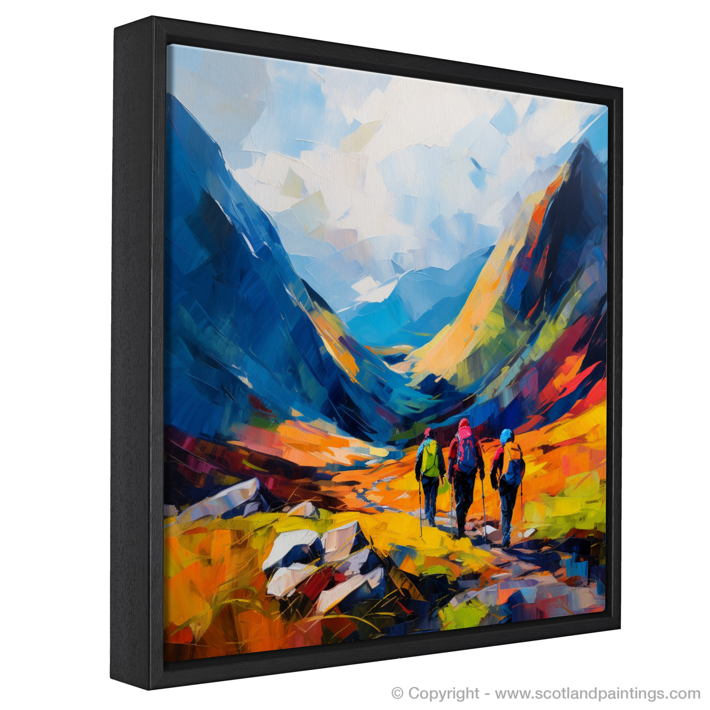 Step into a world where the rugged beauty of Glencoe's landscapes is reimagined through the bold and transformative strokes of cubism. This vibrant print captures the essence of adventure as a group of hikers embarks on their journey at the trail's head, a moment frozen in time and fragmented into the multitude of shapes and colours that define the cubist style.