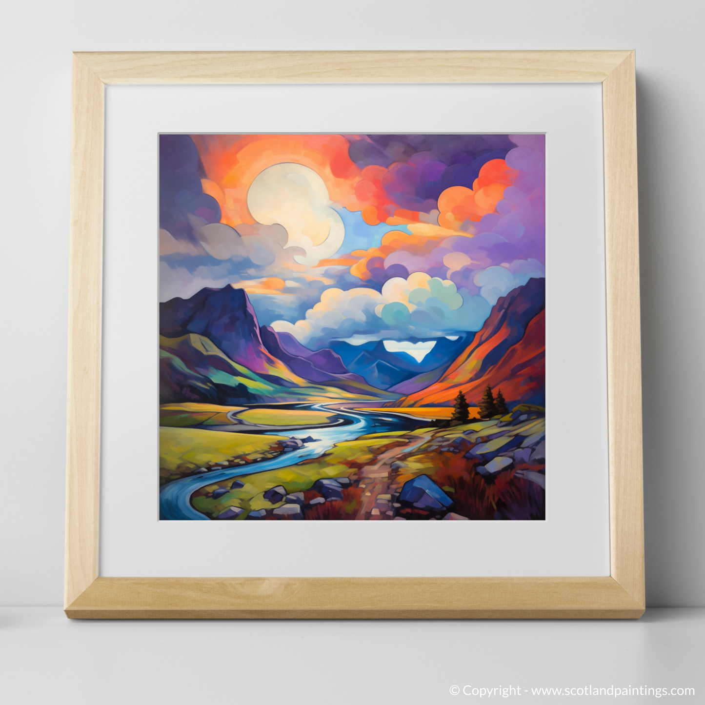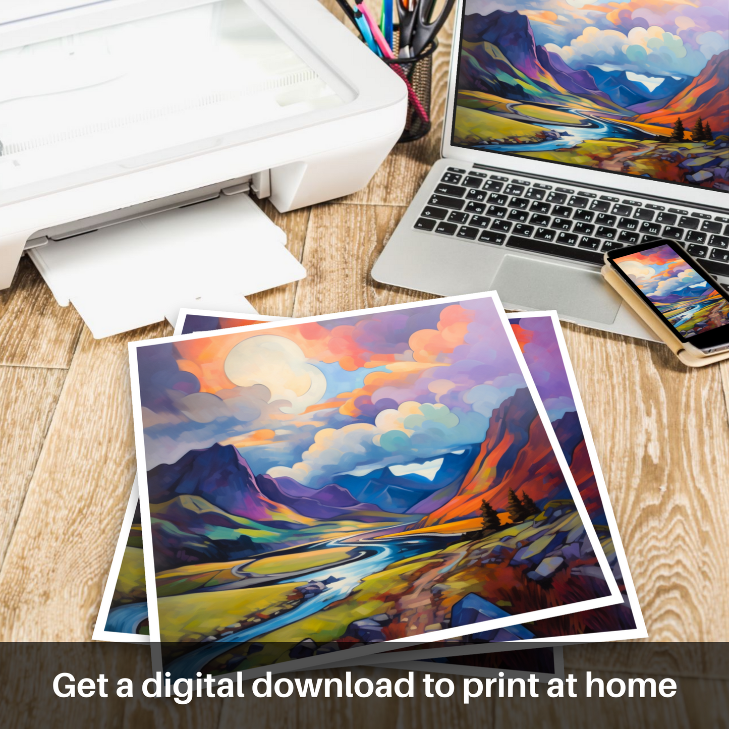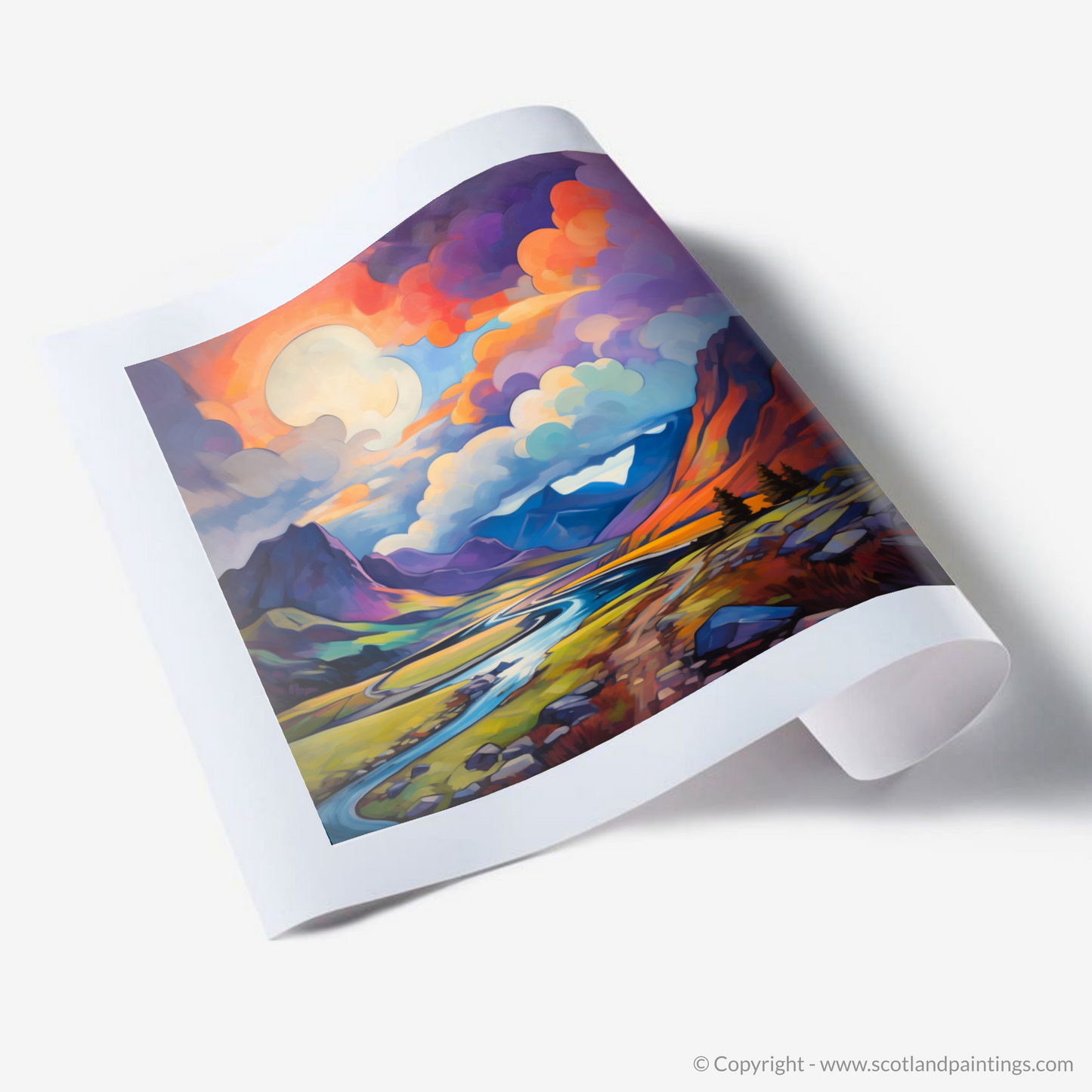 Immerse yourself in the swirling dance of colour and form with this evocative print that captures the essence of Glencoe's majestic skies. Bold brushstrokes carve out angular shapes that form an abstract symphony, where the traditional landscapes of Highland Scotland are reimagined through a vibrant, cubist lens.