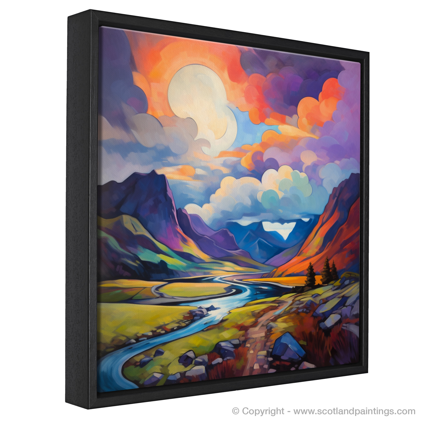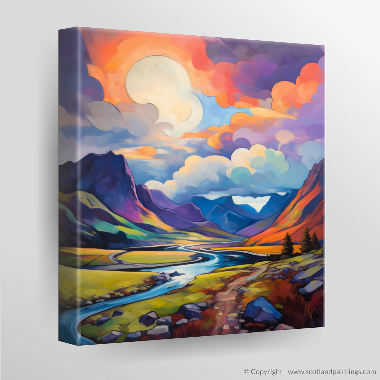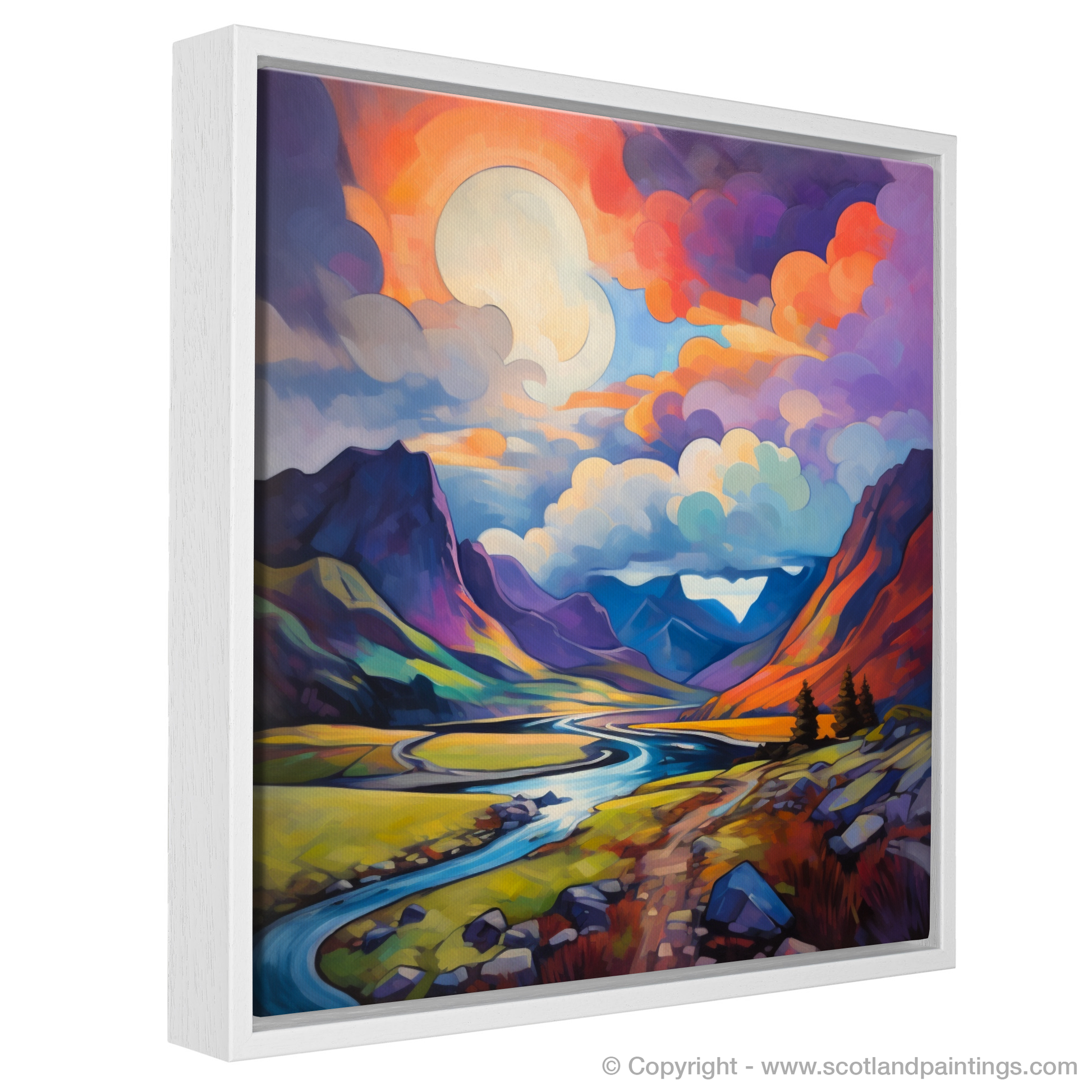 Immerse yourself in the swirling dance of colour and form with this evocative print that captures the essence of Glencoe's majestic skies. Bold brushstrokes carve out angular shapes that form an abstract symphony, where the traditional landscapes of Highland Scotland are reimagined through a vibrant, cubist lens.