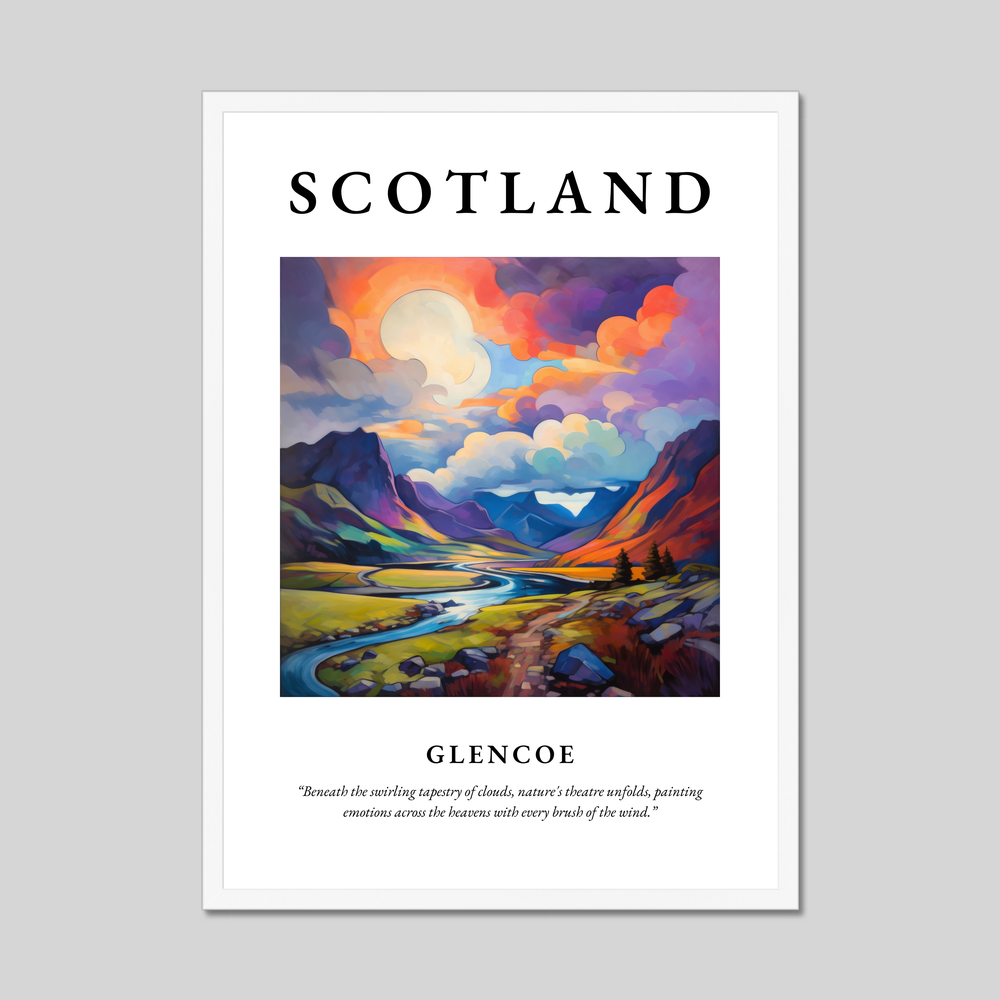 Immerse yourself in the allure of Glencoe, a valley renowned for its dramatic mountains and deep history. Known as one of Scotland's most spectacular and picturesque glens, Glencoe offers a tapestry of mist-laden peaks and rushing rivers that have inspired countless artists and visitors. The poster’s artwork reflects this breathtaking landscape, capturing the intense interplay of light and shadow that defines this mystical region. The vibrant colours evoke the raw emotion of the Highlands, making it a timeless addition to any collection.