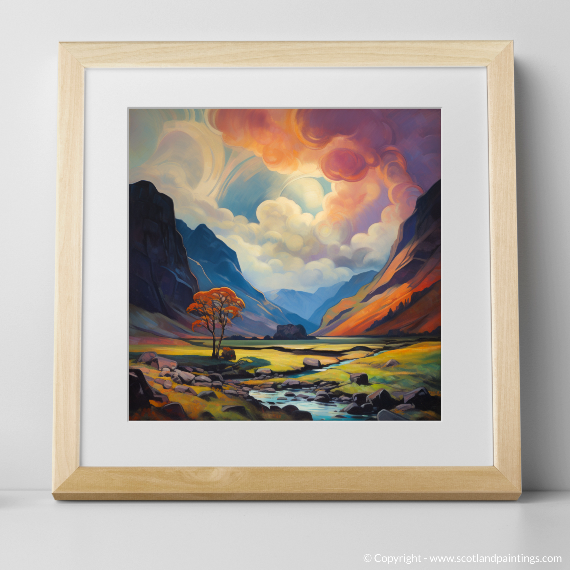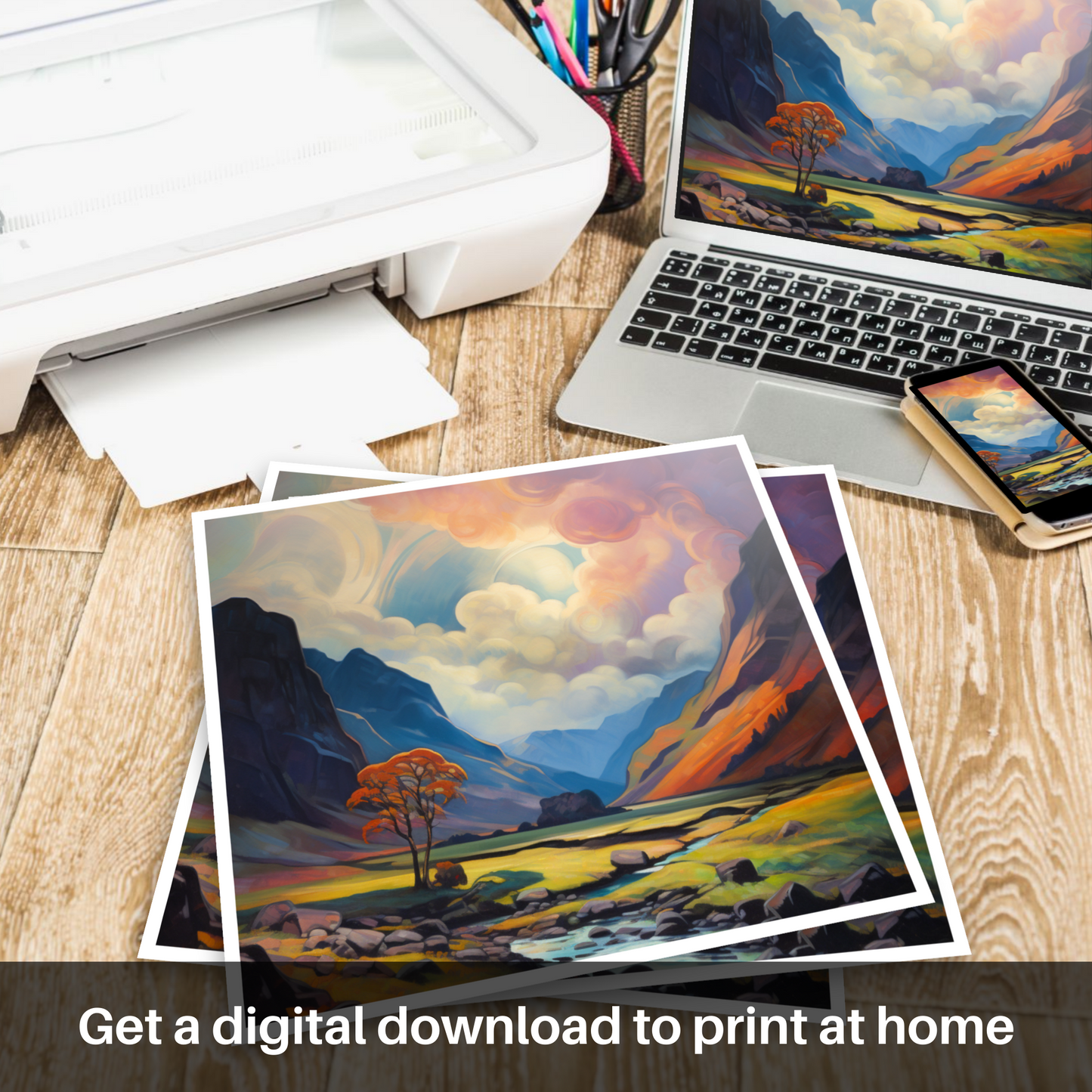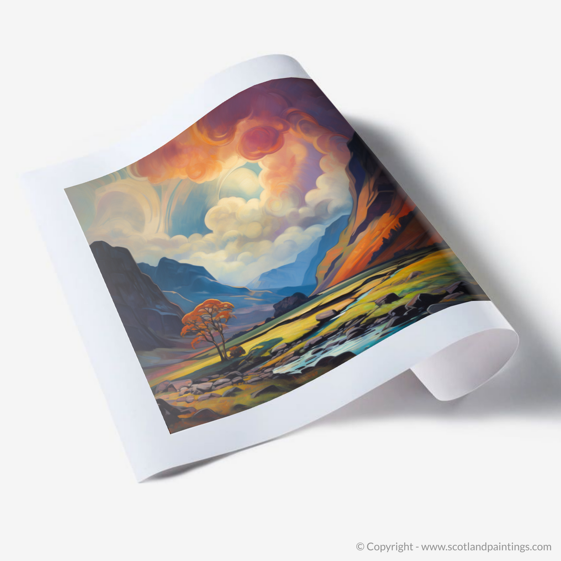 Encapsulating the essence of the wild Scottish Highlands, this captivating print draws its viewer into a harmonious symphony of nature. It interprets the dramatic and untamed beauty of Glencoe with a vibrant cubist twist, infusing the timeless landscape with a flush of modern vitality.