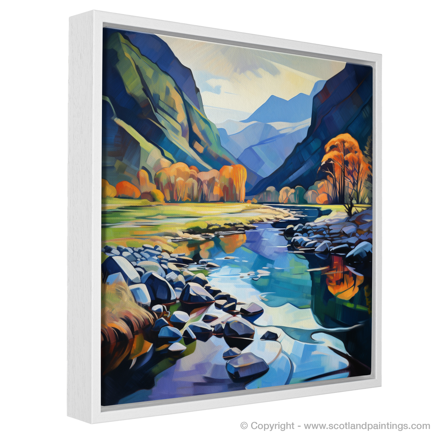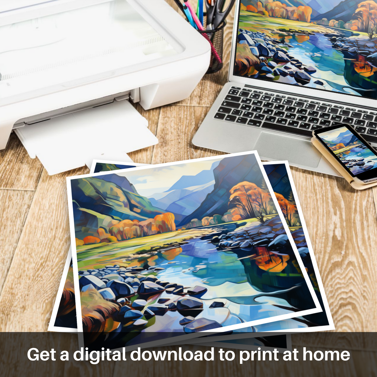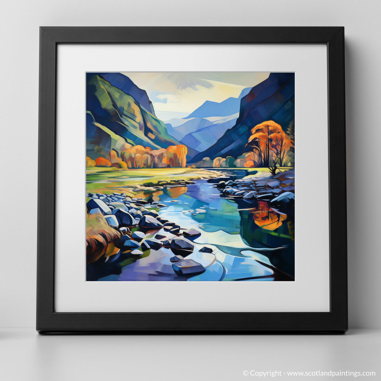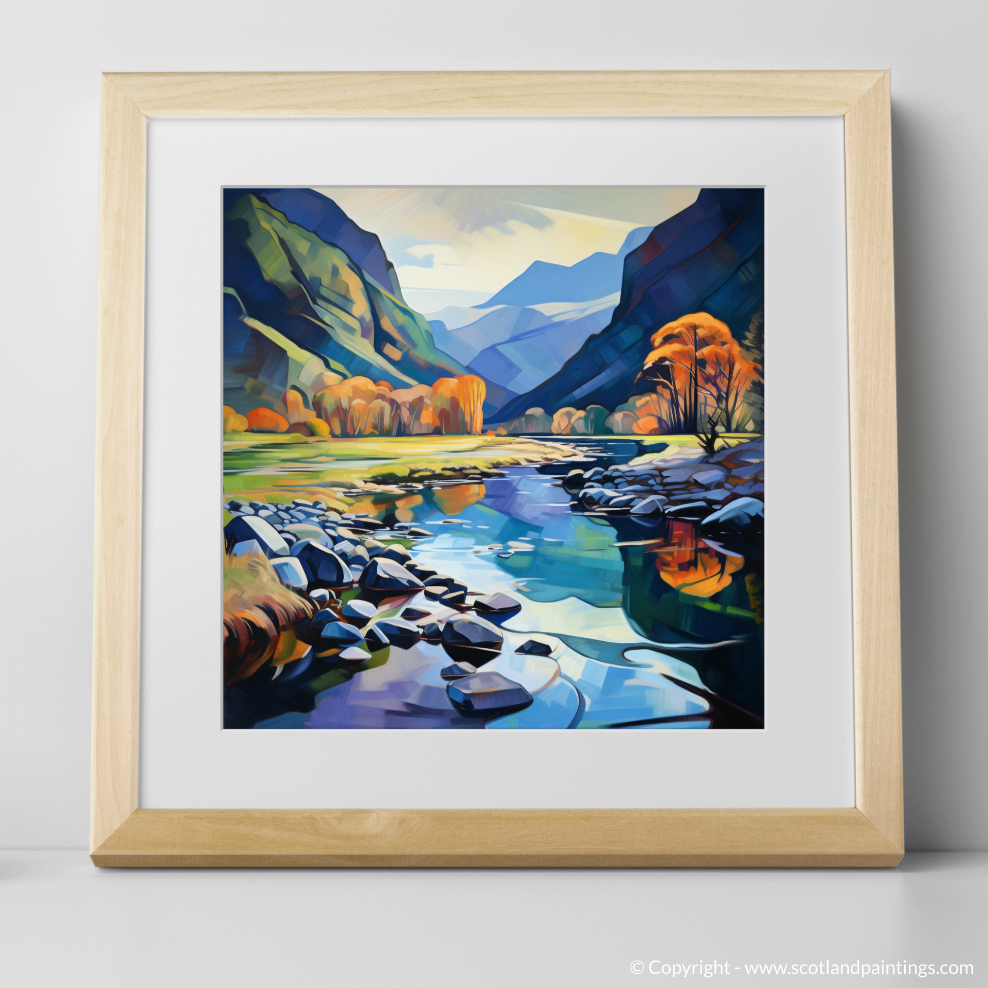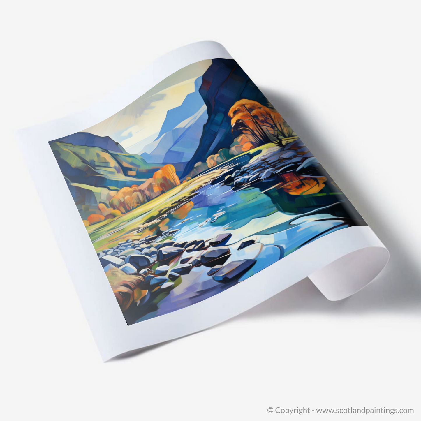 Experience the enchanting Scottish Highlands with this evocative print that captures the serene beauty of the River Coe's reflections. As your eyes traverse this captivating landscape, they are greeted by abstract forms and bold colours that are the hallmark of the Cubist style, cleverly employed to re-imagine Glencoe's natural splendour.
