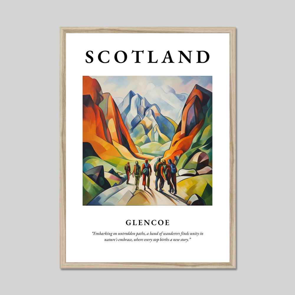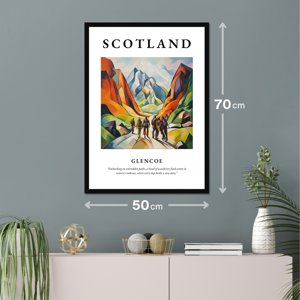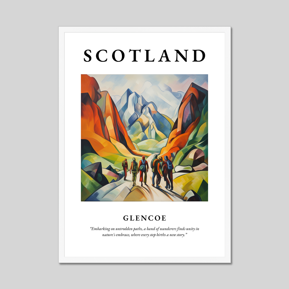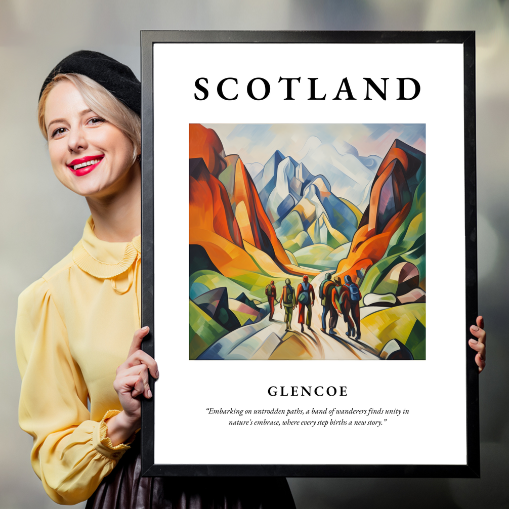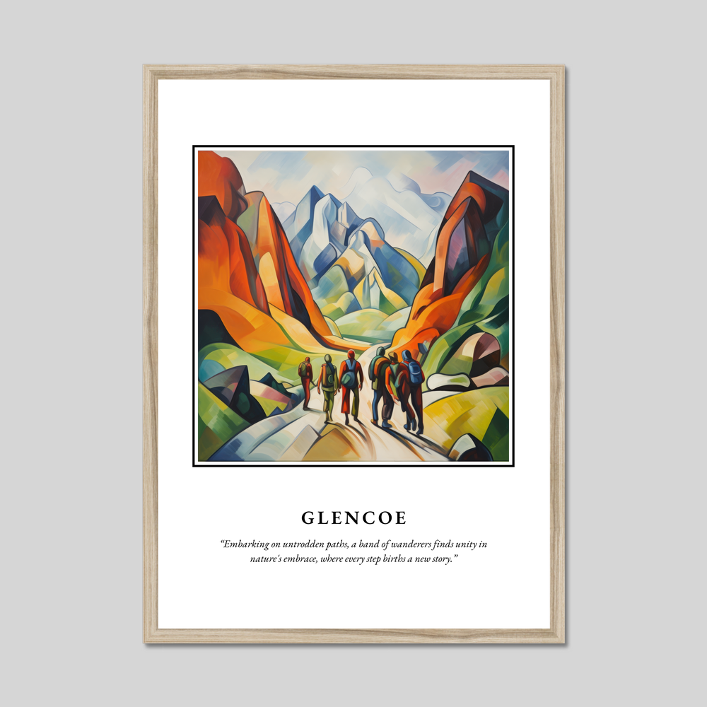 Beneath the painting, a poignant quote reads: "Embarking on untrodden paths, a band of wanderers finds unity in nature's embrace, where every step births a new story." It's a sentiment that resonates deeply with those who cherish the spirit of exploration—ideal for anyone with fond memories of past adventures in Glencoe or dreams of journeys yet to come. This stunning piece is also a feast for art lovers who appreciate the bold and expressive narrative of Cubism.