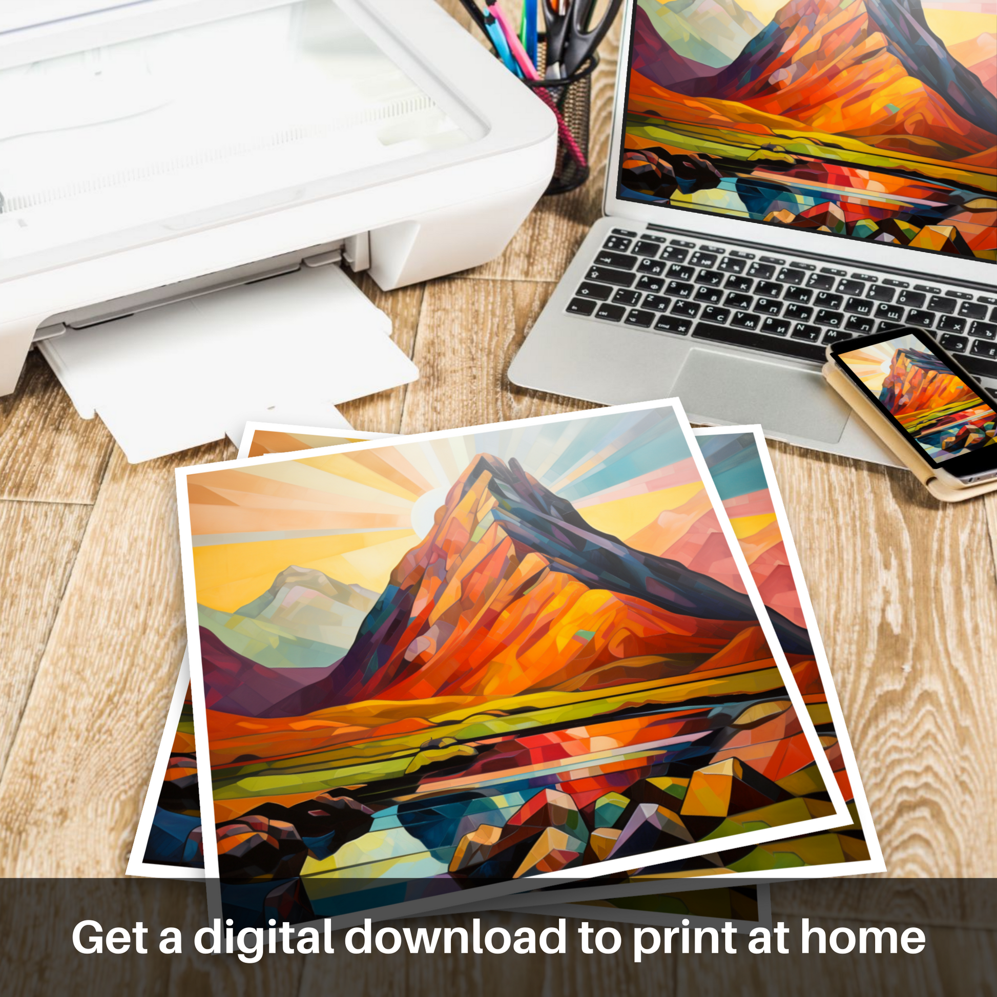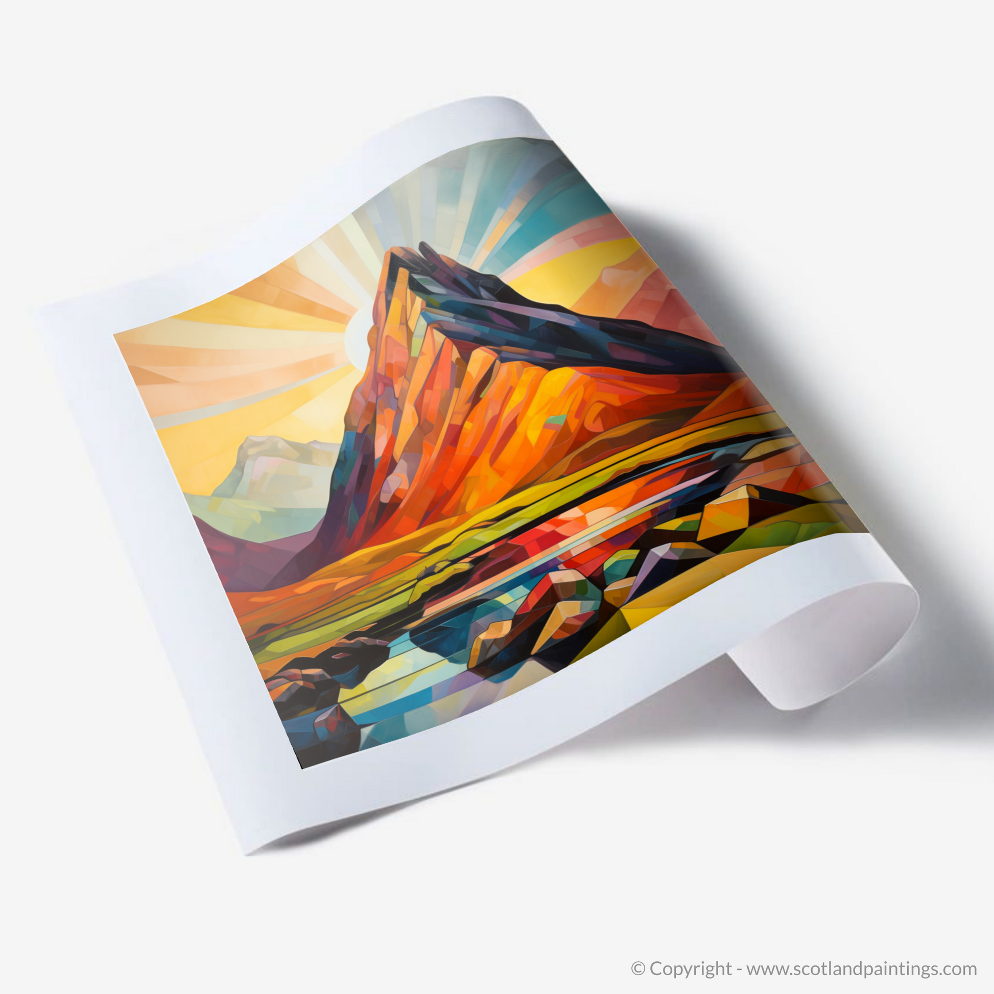 Awaken your senses to the striking play of light and geometry as you immerse yourself in this cubist homage to the majestic Buachaille Etive Mòr at sunrise. Geometry meets nature in this vibrant print, where the rising sun casts a kaleidoscopic array of colours across the formidable Scottish landscape of Glencoe.