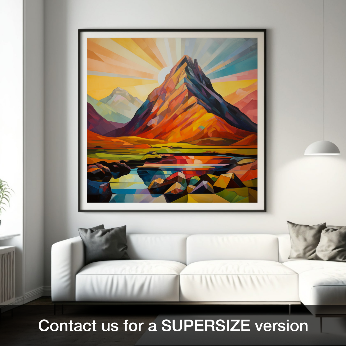This print is not just a depiction but an interpretation, inviting the eye to journey through a Glencoe sunrise reimagined. It is a piece that will not only provide a touch of modernist elegance to any space but also serve as a constant reminder of nature's eternal beauty, abstracted through the cubist lens into something novel and mesmeric. Transport yourself to the Scottish highlands with this captivating piece, a celebration of form, colour, and the enchanting allure of one of Scotland's most breathtaking vistas.