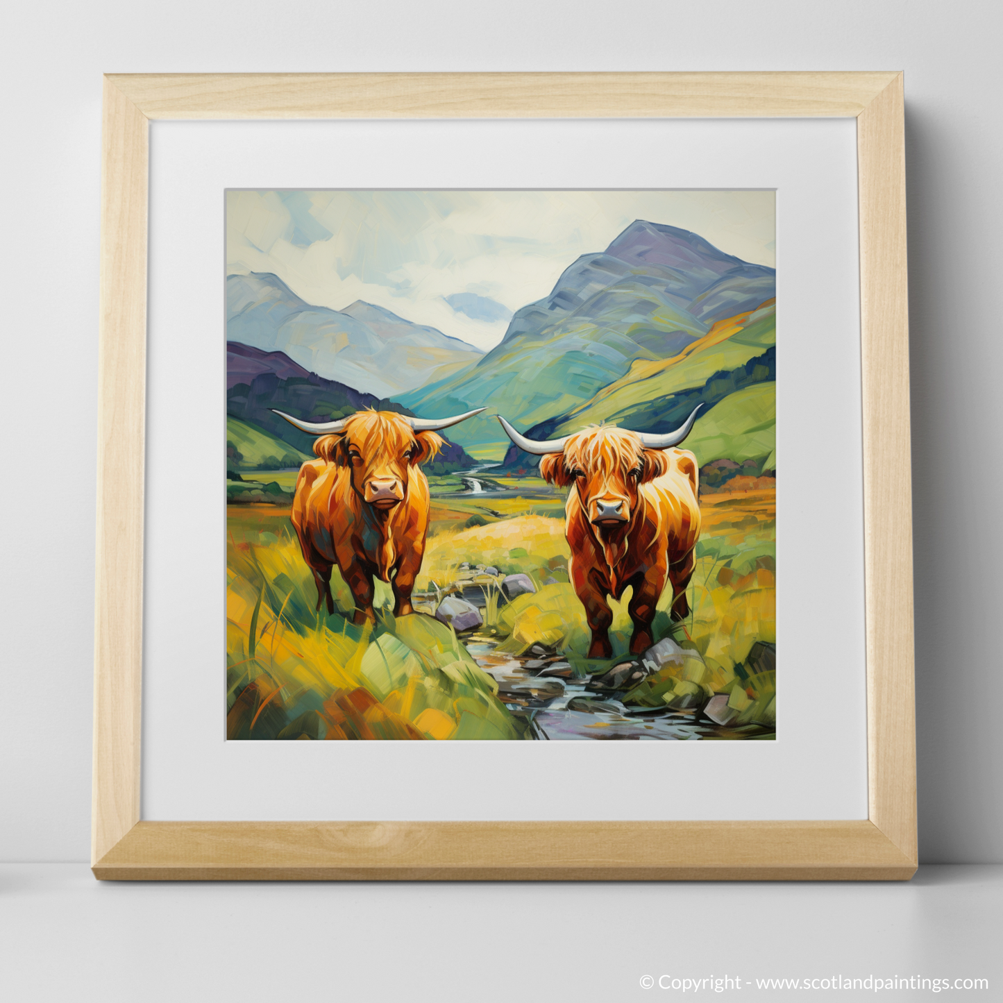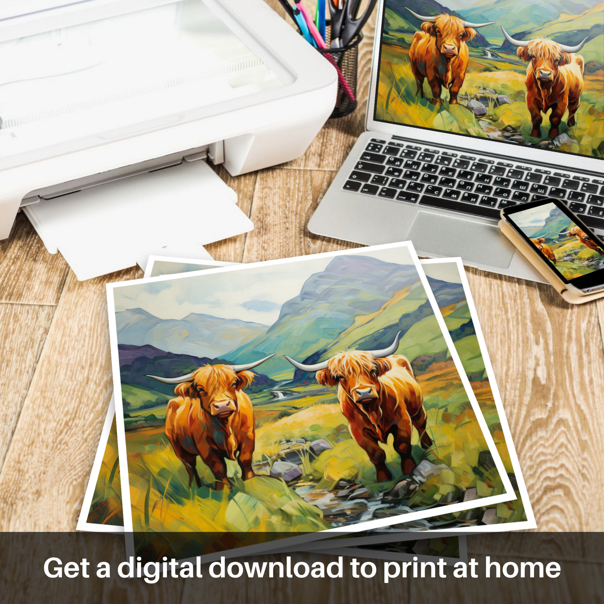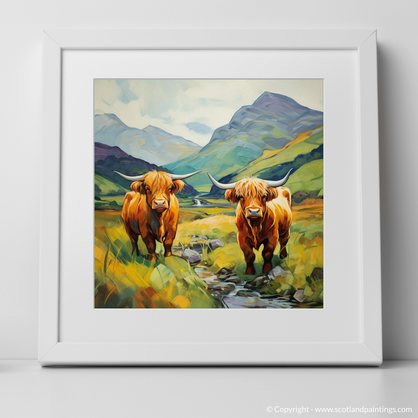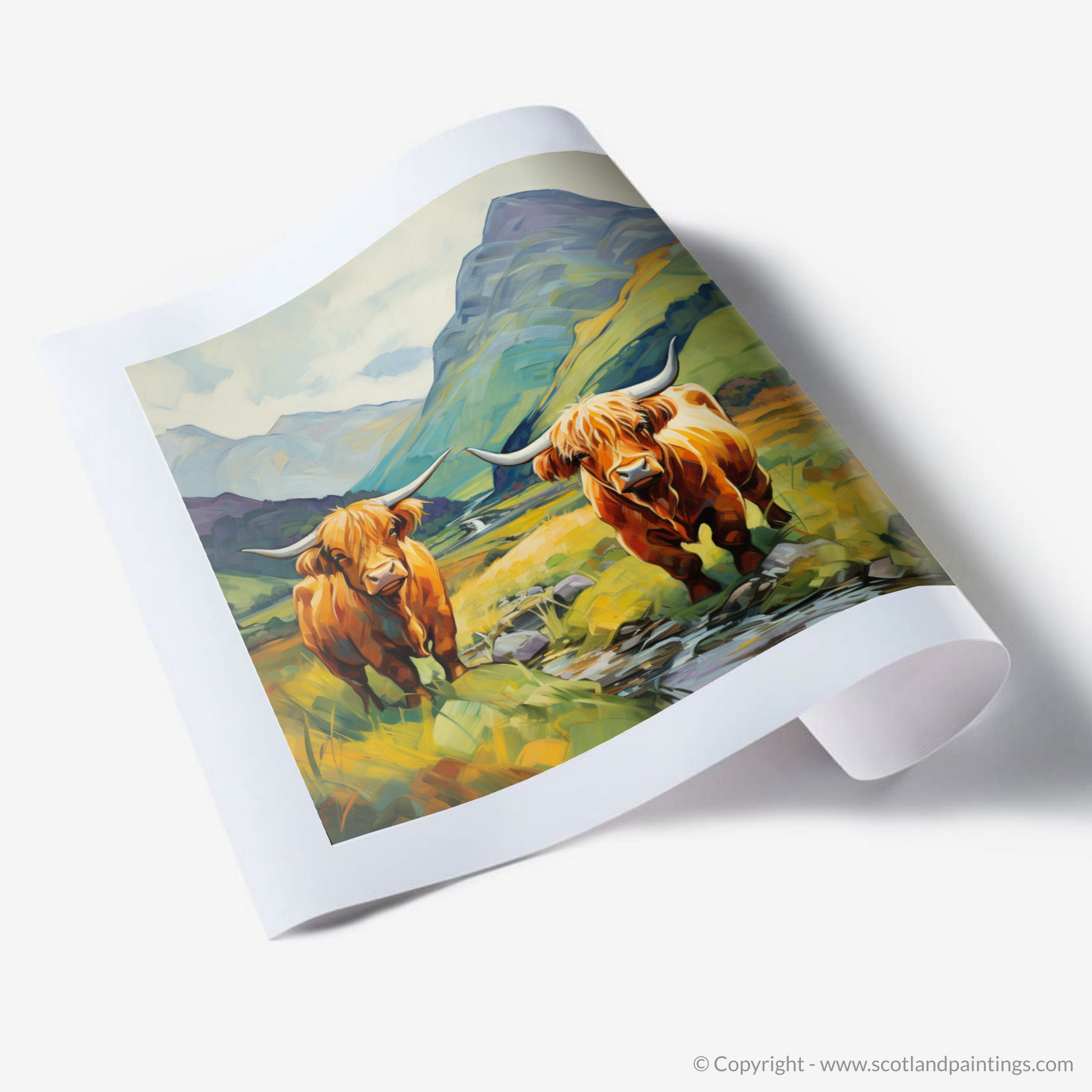 This print, an ode to Glencoe's natural splendour and its iconic residents, bridges the gap between avant-garde artistry and pastoral beauty. It presents a dynamic, yet serene composition that invites repeated viewing, ensuring that each glance unveils a new layer of detail within the harmoniously fragmented scenery. This piece is not merely a print; it is an invitation to explore the essence of the Highlands from a refreshingly bold perspective.