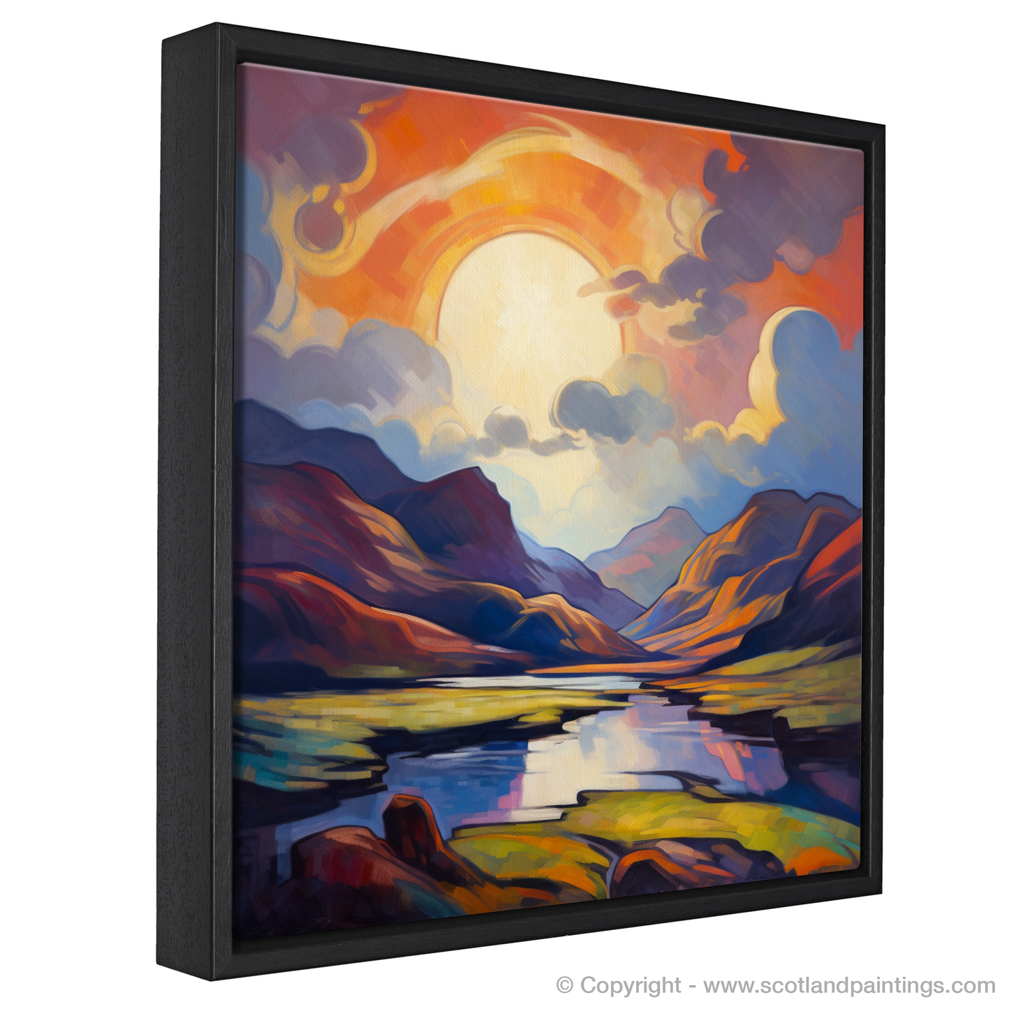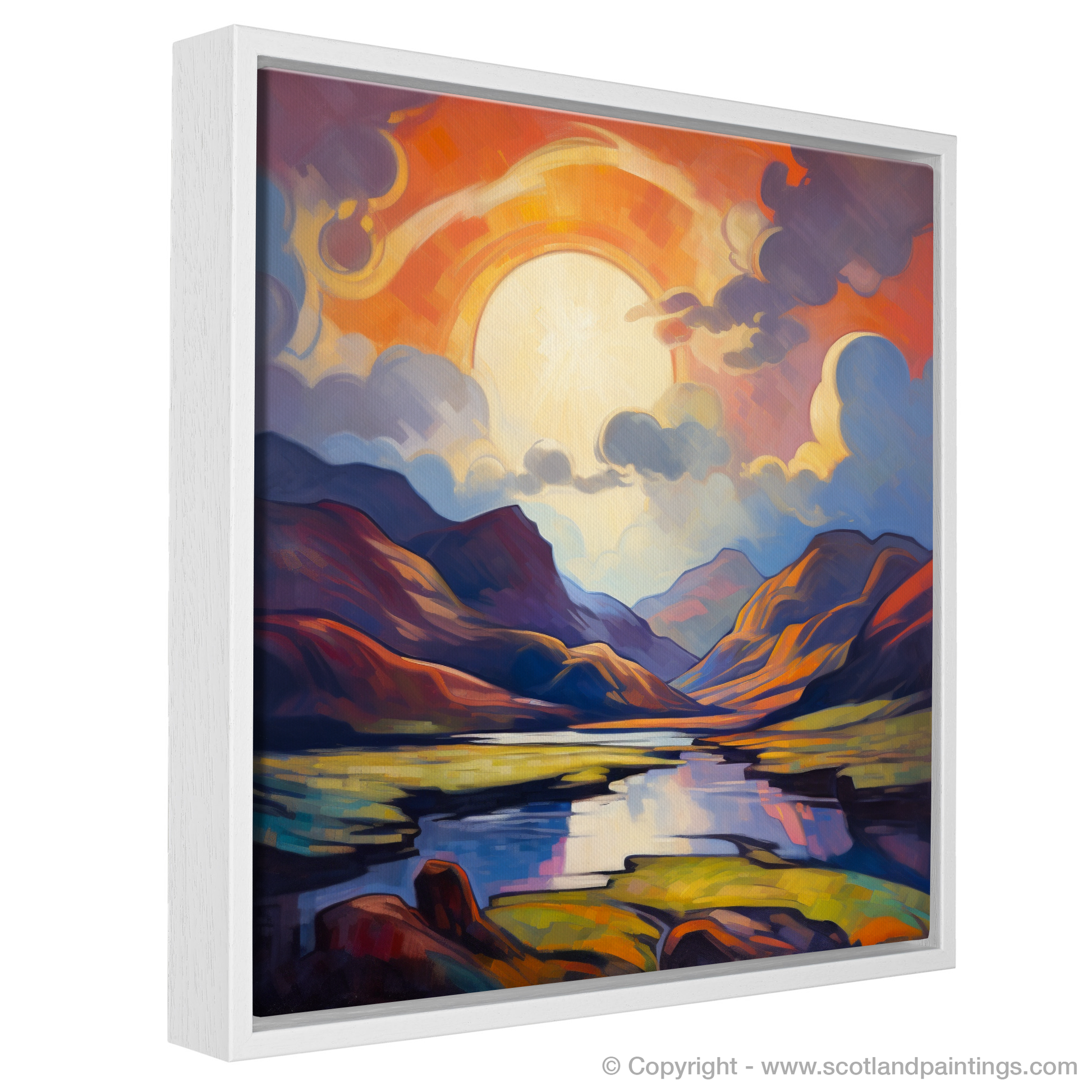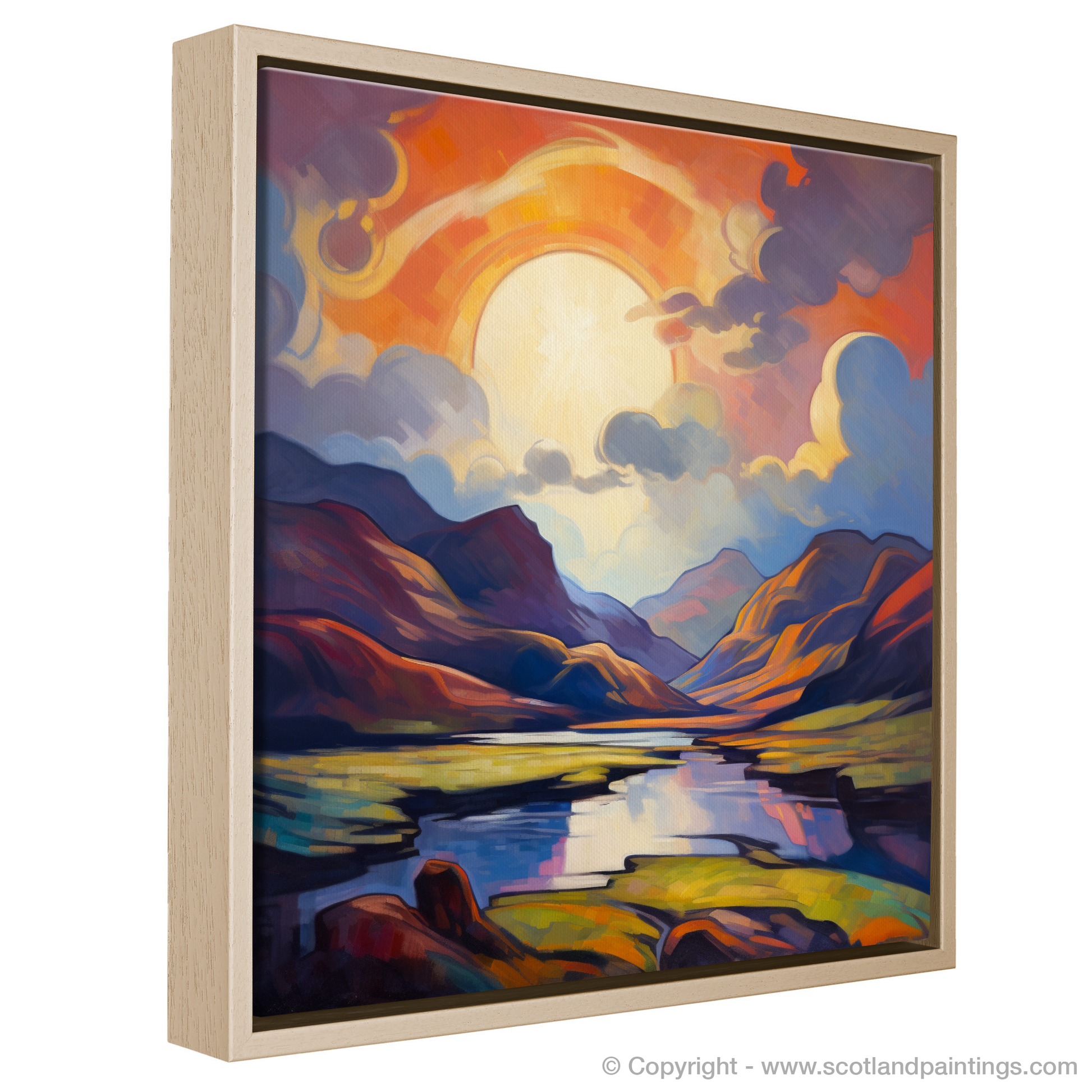 As the sun dips towards the horizon, a breathtaking scene of Glencoe unfolds in a mesmerizing display of geometric abstraction. This exquisite print captures the arresting beauty of moody clouds at sunset, rendered in the distinct, angular fashion of Cubism, which fractures the view into a tapestry of vivid shapes and colours. Each angle and plane of the clouds, mountains, and water is meticulously outlined, offering an almost tangible texture to the piece.