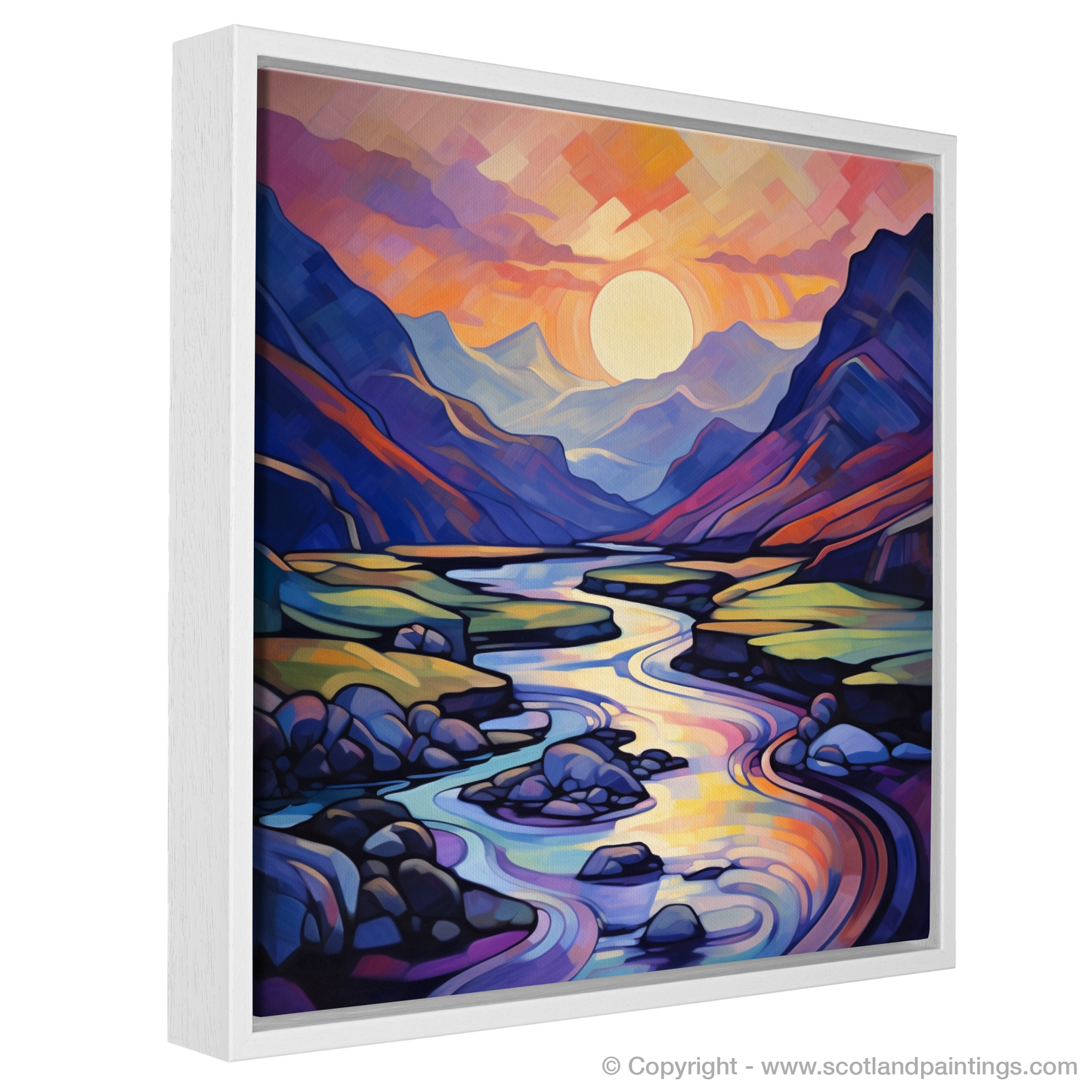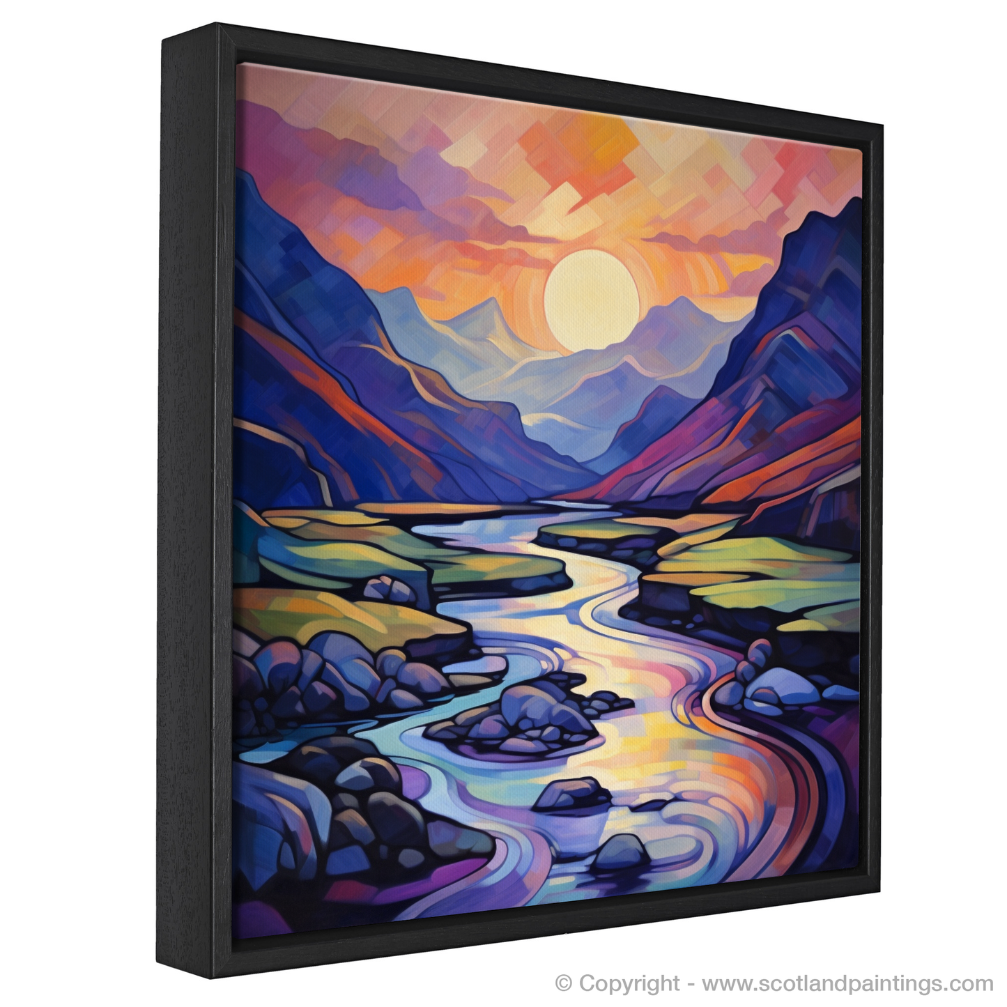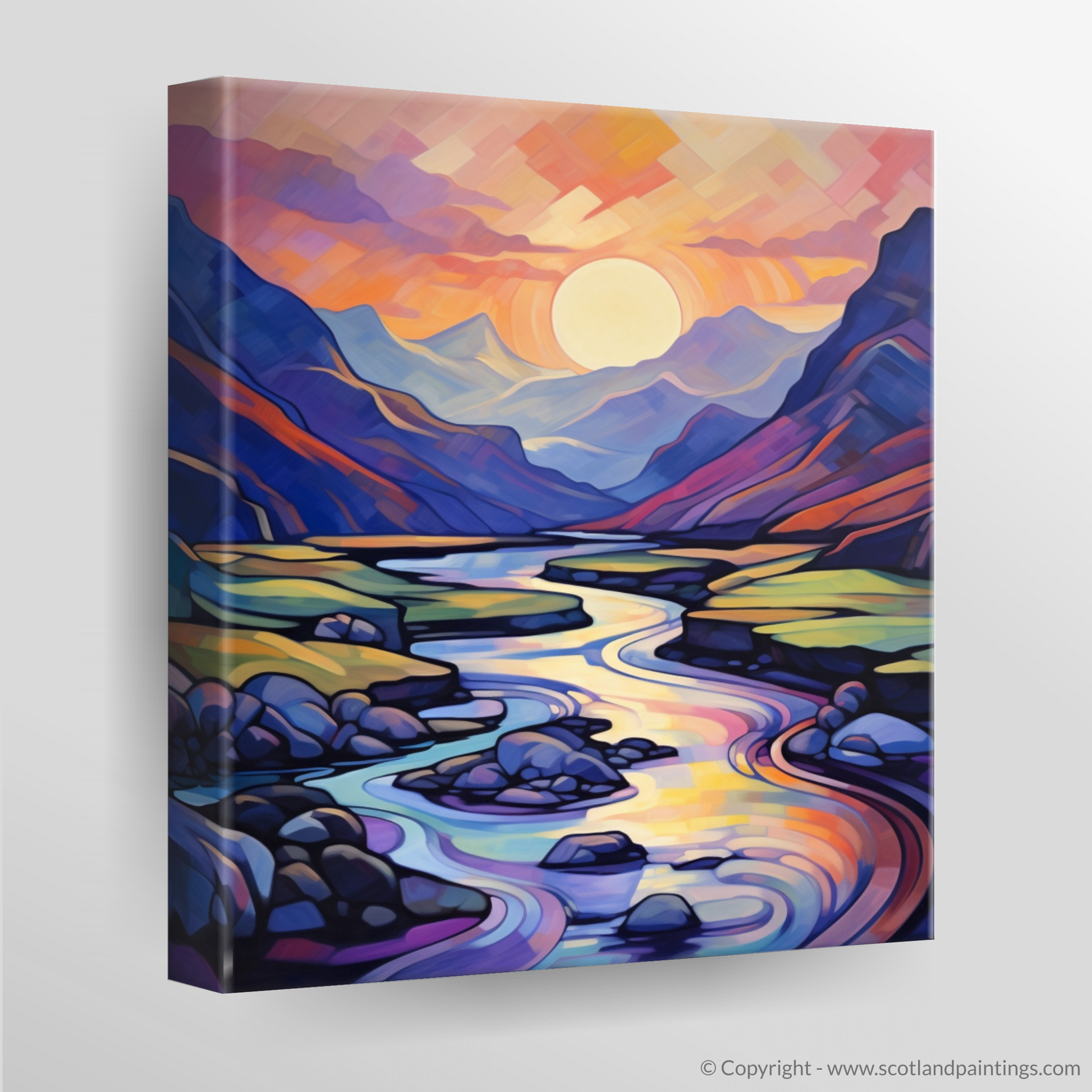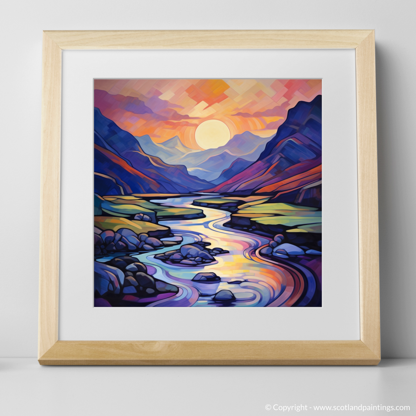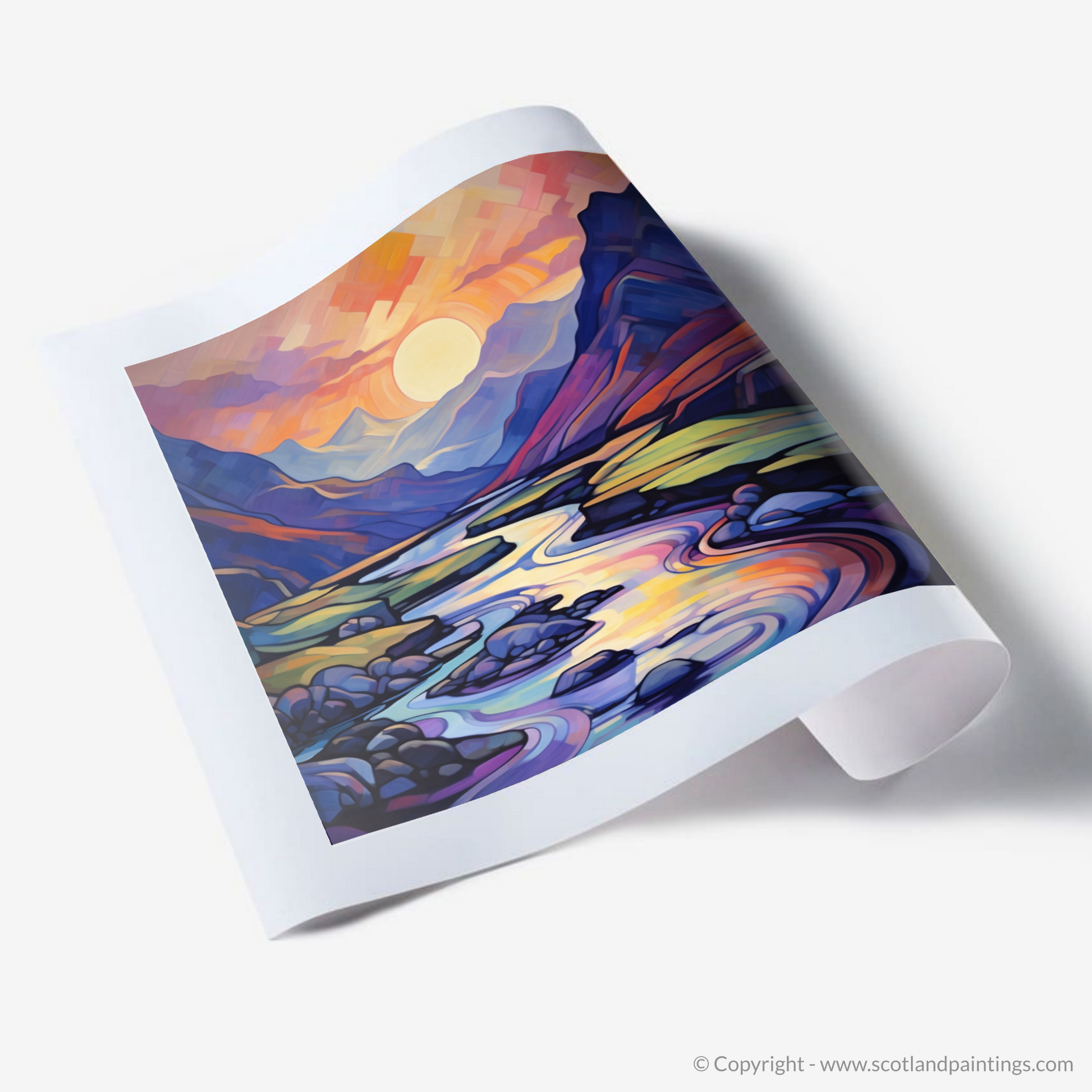 Immerse yourself in the sweeping vistas of Glencoe with this evocative print, a masterpiece inspired by the serene Dusk over River Coe. The dynamic cubist interpretation reimagines the tranquil landscape through a prism of geometric splendour, encapsulating the rugged charm of the Scottish Highlands in a mosaic of vibrant tones and angular perspectives.