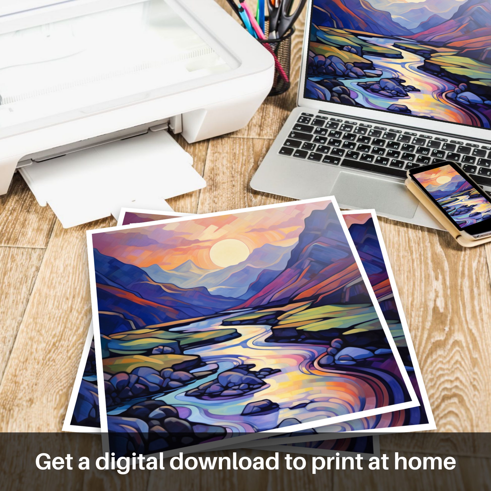 This print, part of our esteemed 'Glencoe' collection, is more than a piece of decor; it is a conversation starter, an invitation to ponder the artistry of nature through the lens of cubism. It can transform any space, allowing the majesty of the River Coe at dusk to live on in an arresting new form. Indulge in this captivating portrayal of one of Scotland's most iconic landscapes and let your imagination roam the highland valleys and crest the rolling hills, all from the comfort of your own abode.