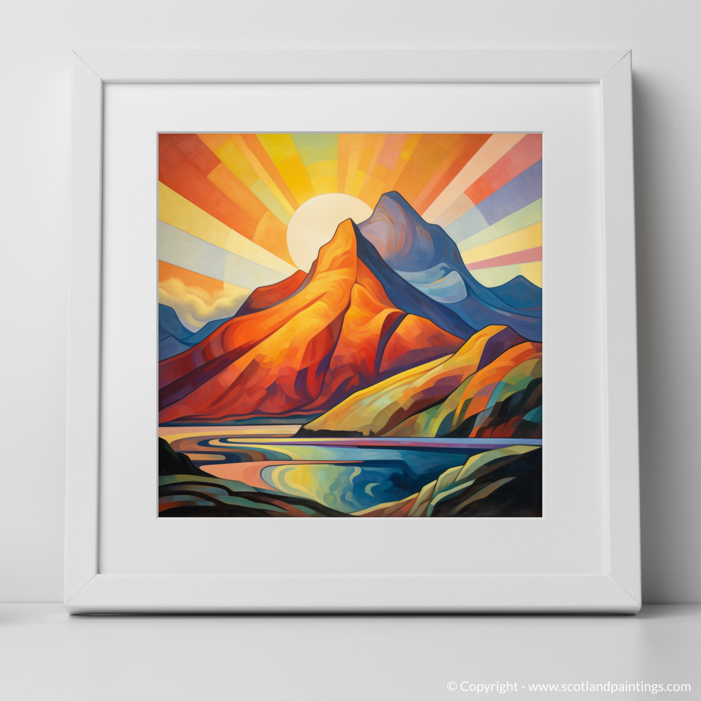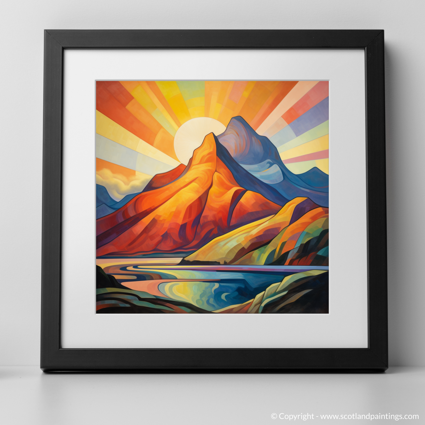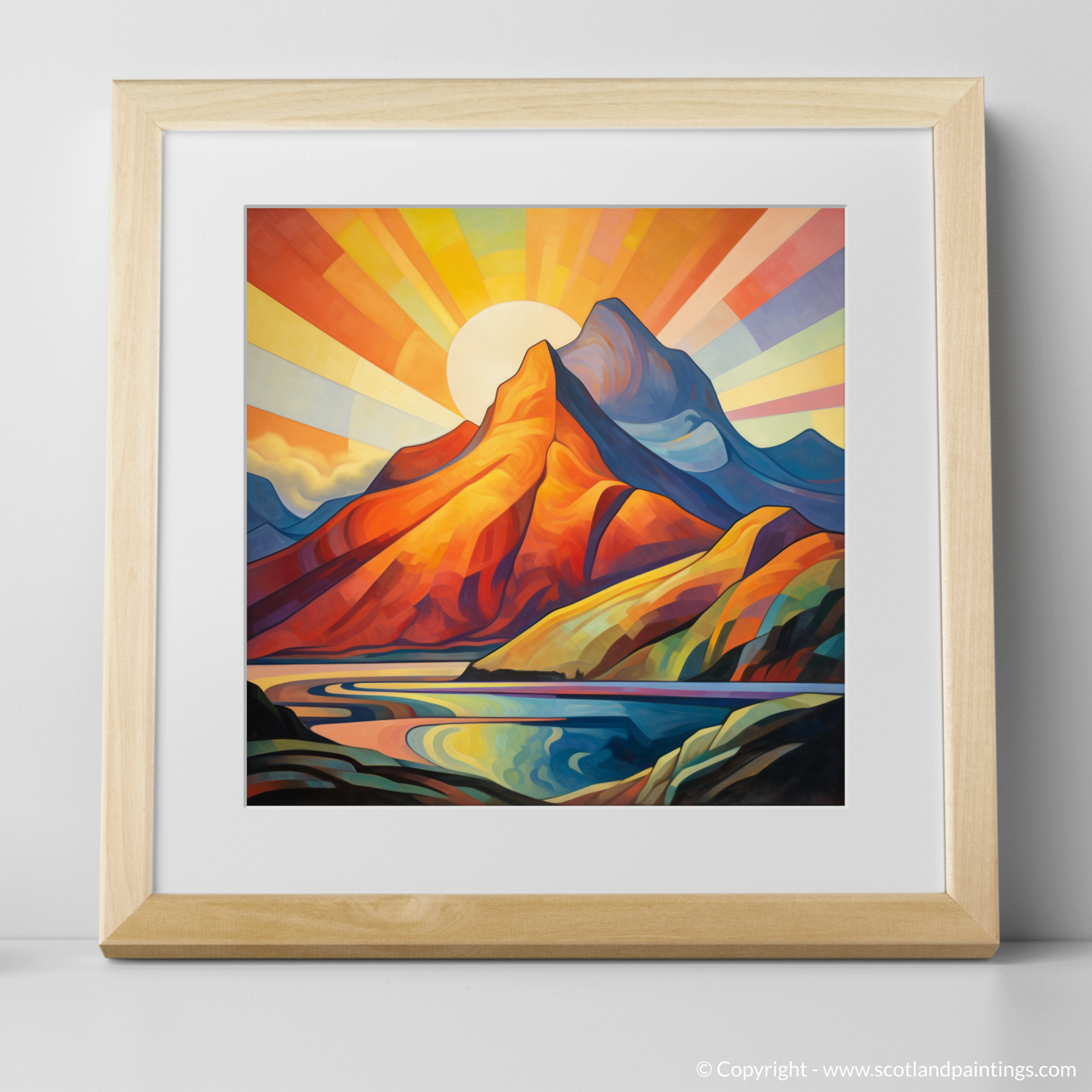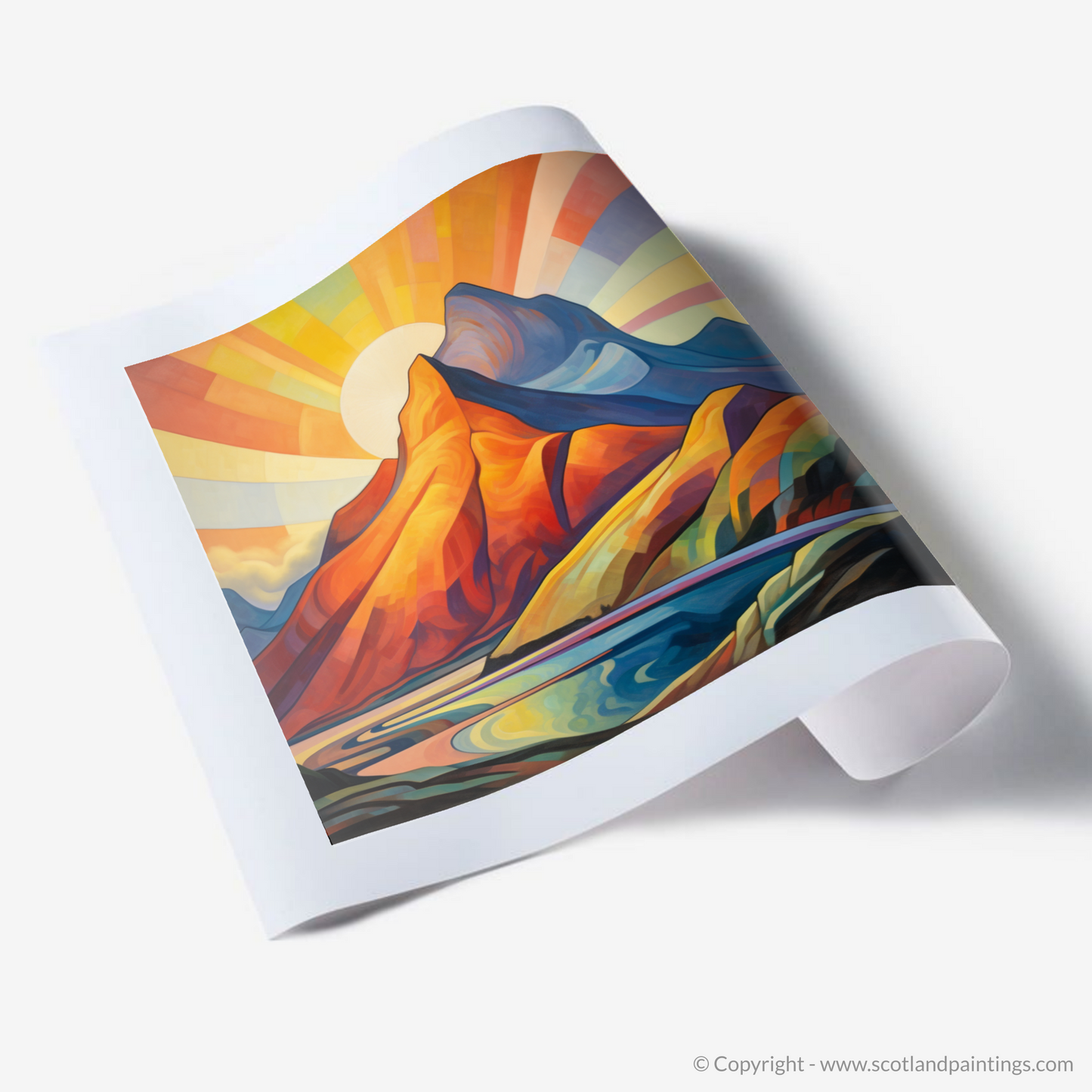 Immerse yourself in the vivid, geometric splendour of a cubist-inspired landscape, where the iconic Buachaille Etive Mòr of Glencoe stands proudly against a mesmerising sunrise. This evocative print captures the mountain's unmistakable silhouette, transformed into an array of bold, angular shapes that conjure the natural interplay of light and shadow, while a radiant sunburst spills across the sky in a spectacular gradient of warm hues.