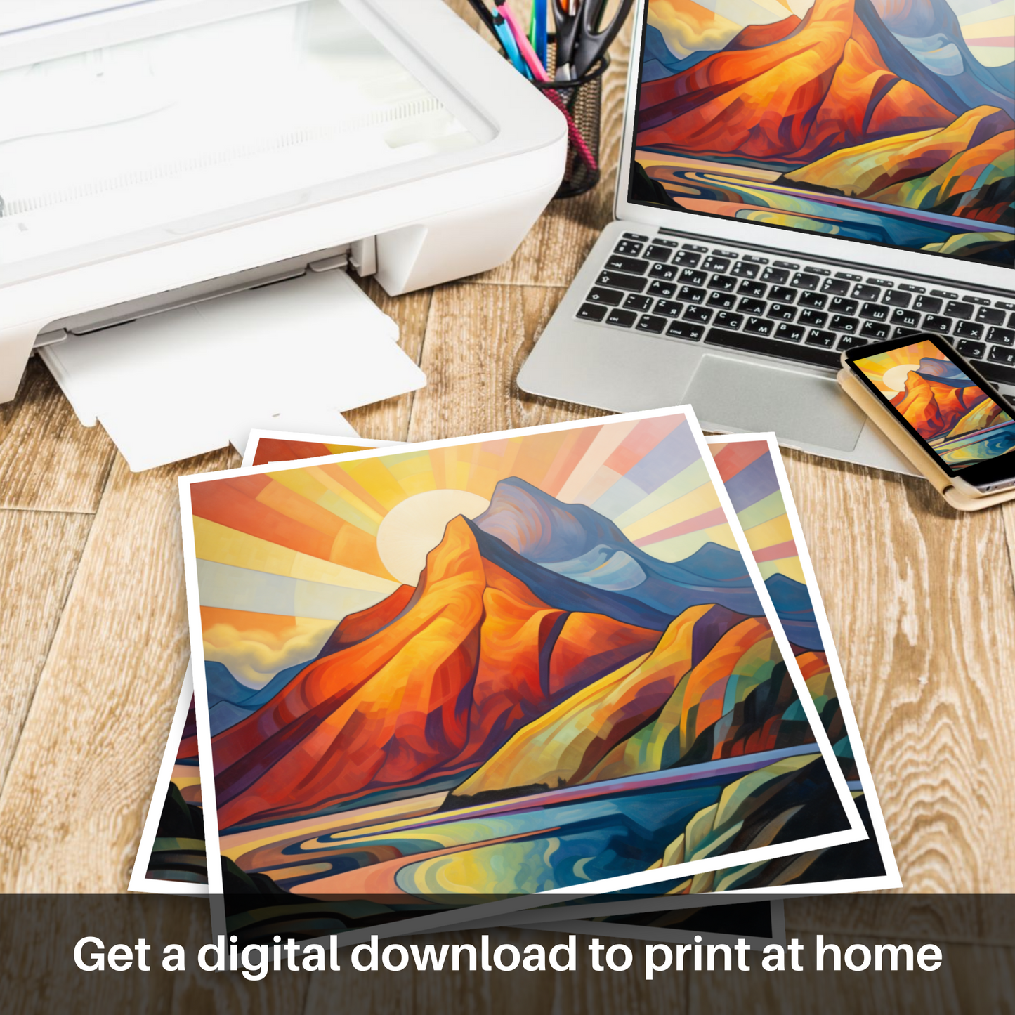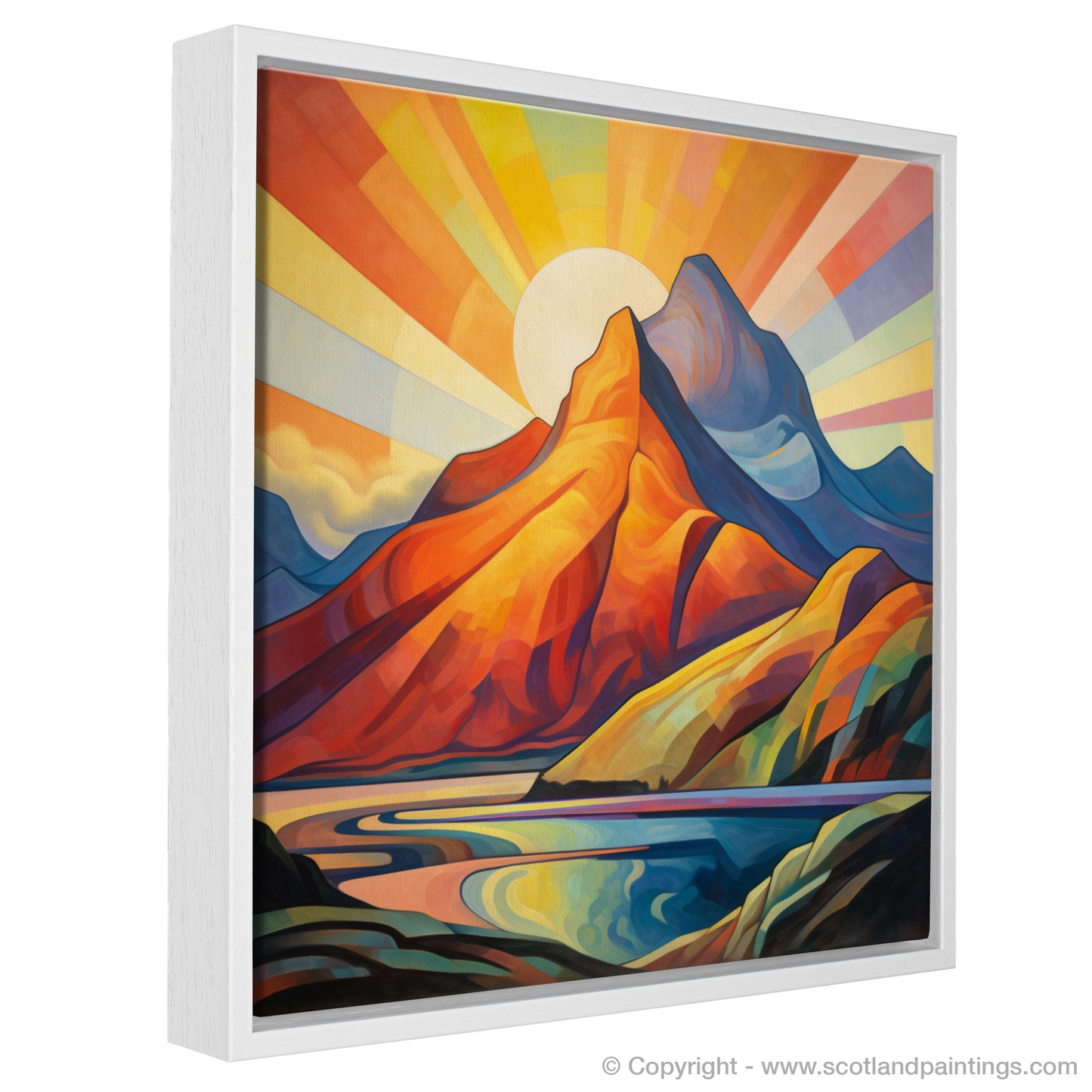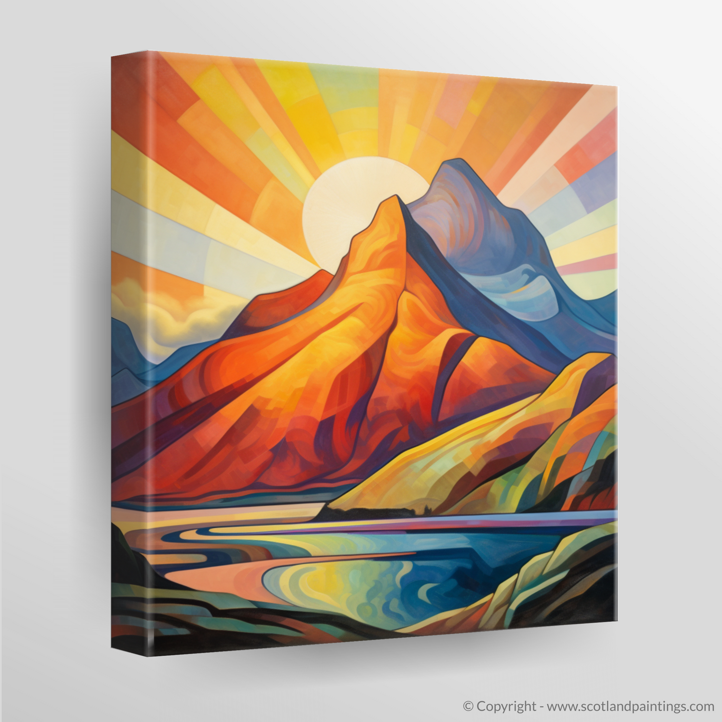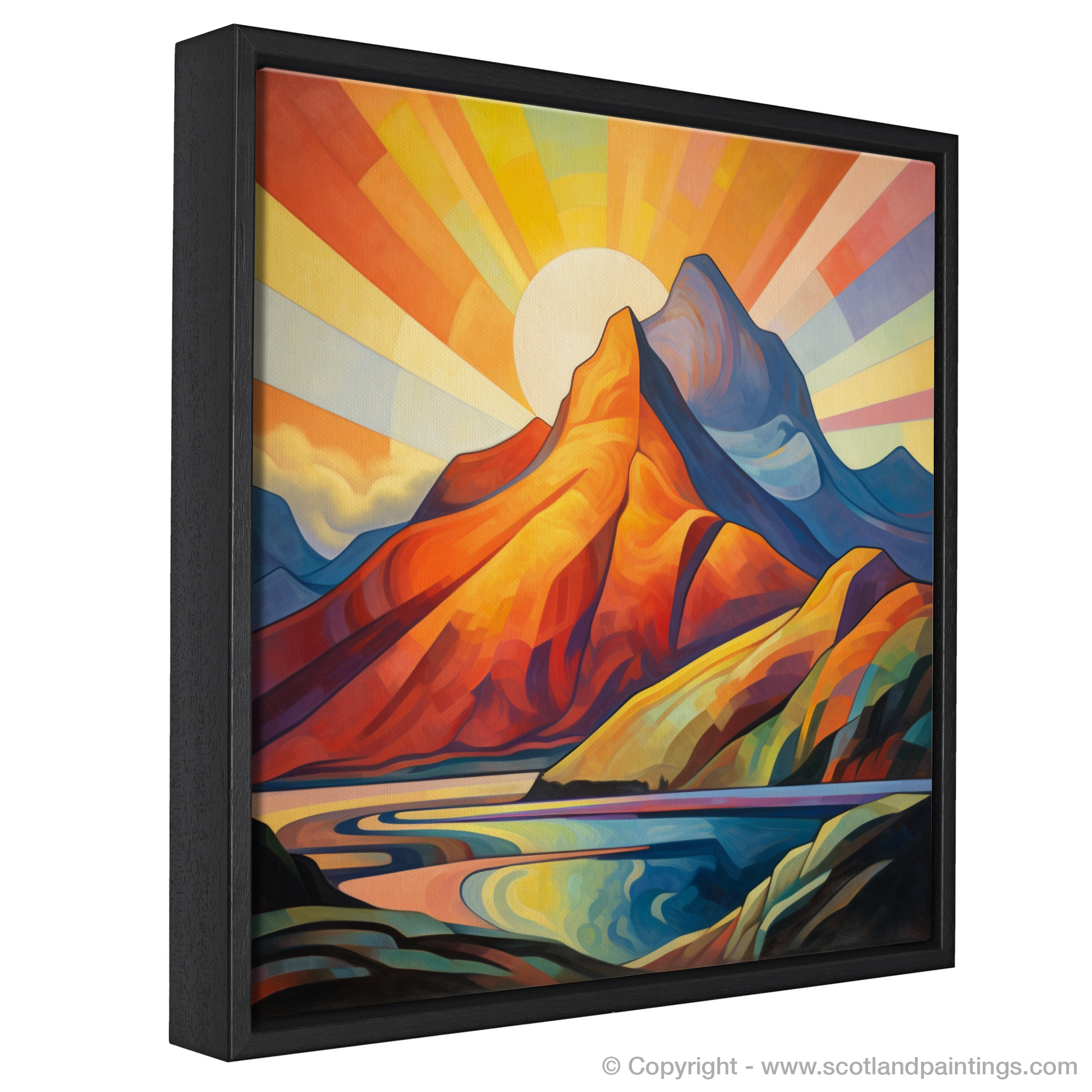 Immerse yourself in the vivid, geometric splendour of a cubist-inspired landscape, where the iconic Buachaille Etive Mòr of Glencoe stands proudly against a mesmerising sunrise. This evocative print captures the mountain's unmistakable silhouette, transformed into an array of bold, angular shapes that conjure the natural interplay of light and shadow, while a radiant sunburst spills across the sky in a spectacular gradient of warm hues.