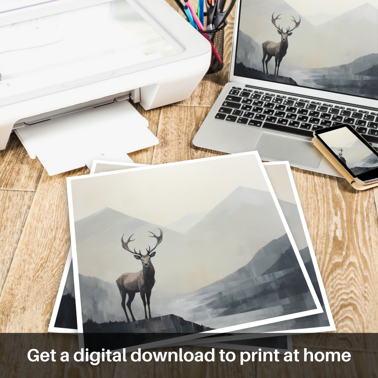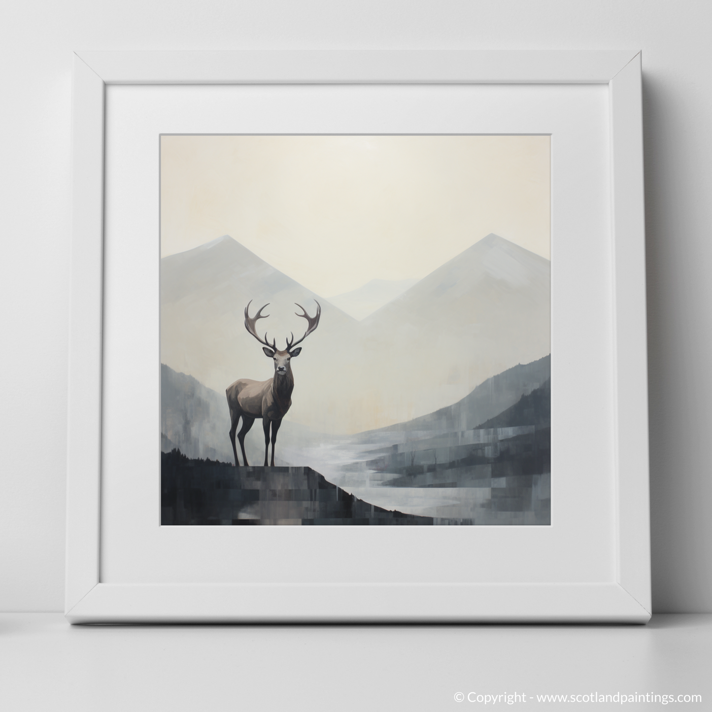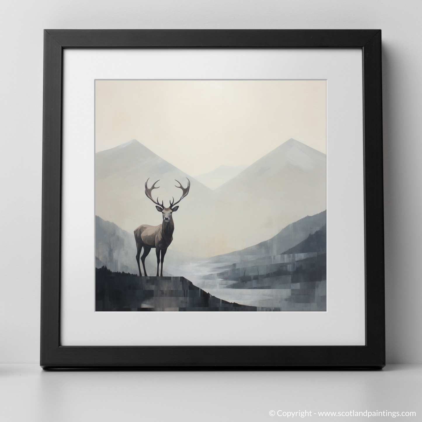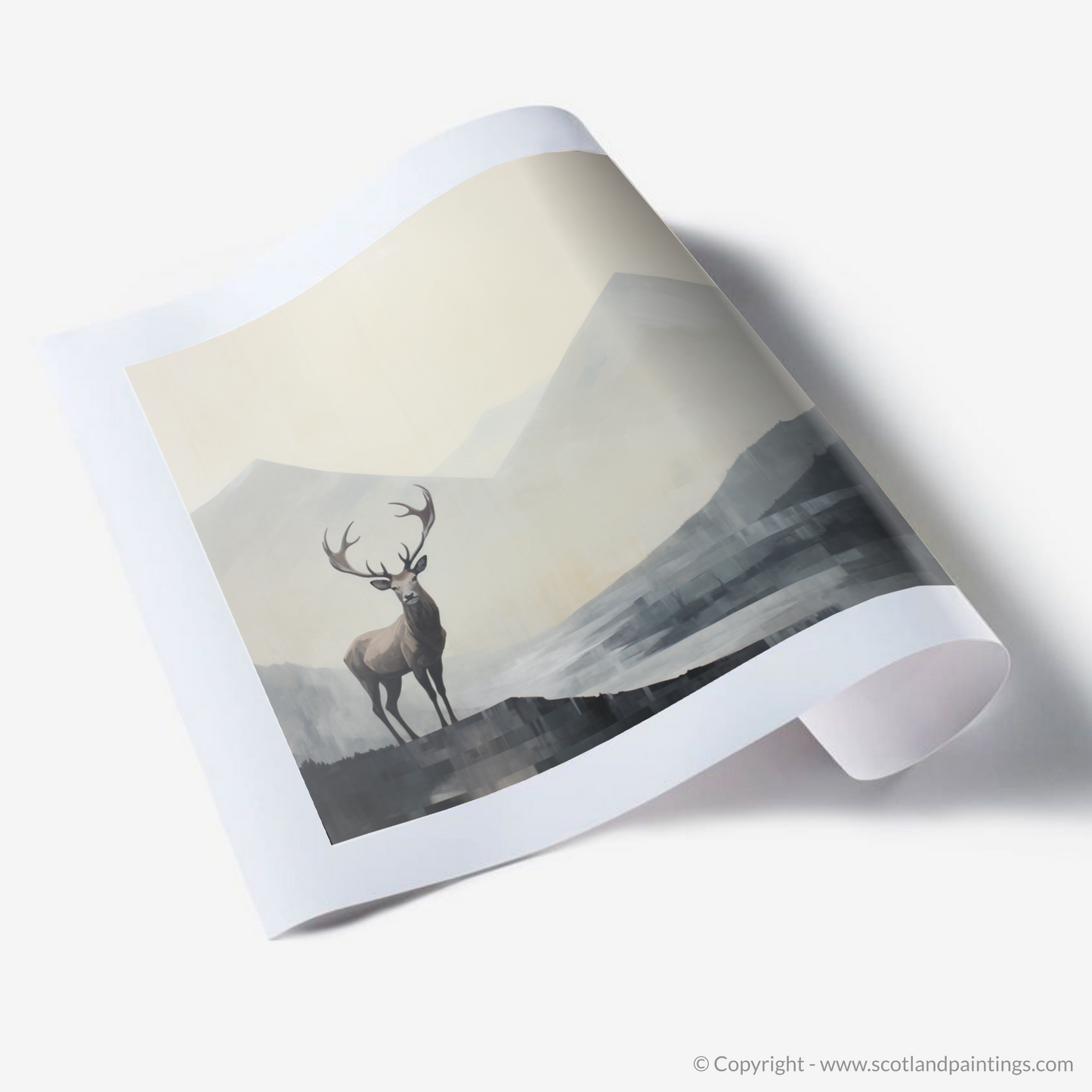 Emerge from the mists of Glencoe into a realm of serene beauty with this entrancing print, resplendently capturing the essence of minimalistic art. Enveloped in an atmosphere of tranquility, the poised silhouette of a majestic stag stands as a striking contrast against the ethereal backdrop of layered mountains. Soft, muted tones of beiges and greys compose an otherworldly landscape that fuses with the muted amber of dawn or the fading glow of dusk, washing the scene in a dreamlike quality.