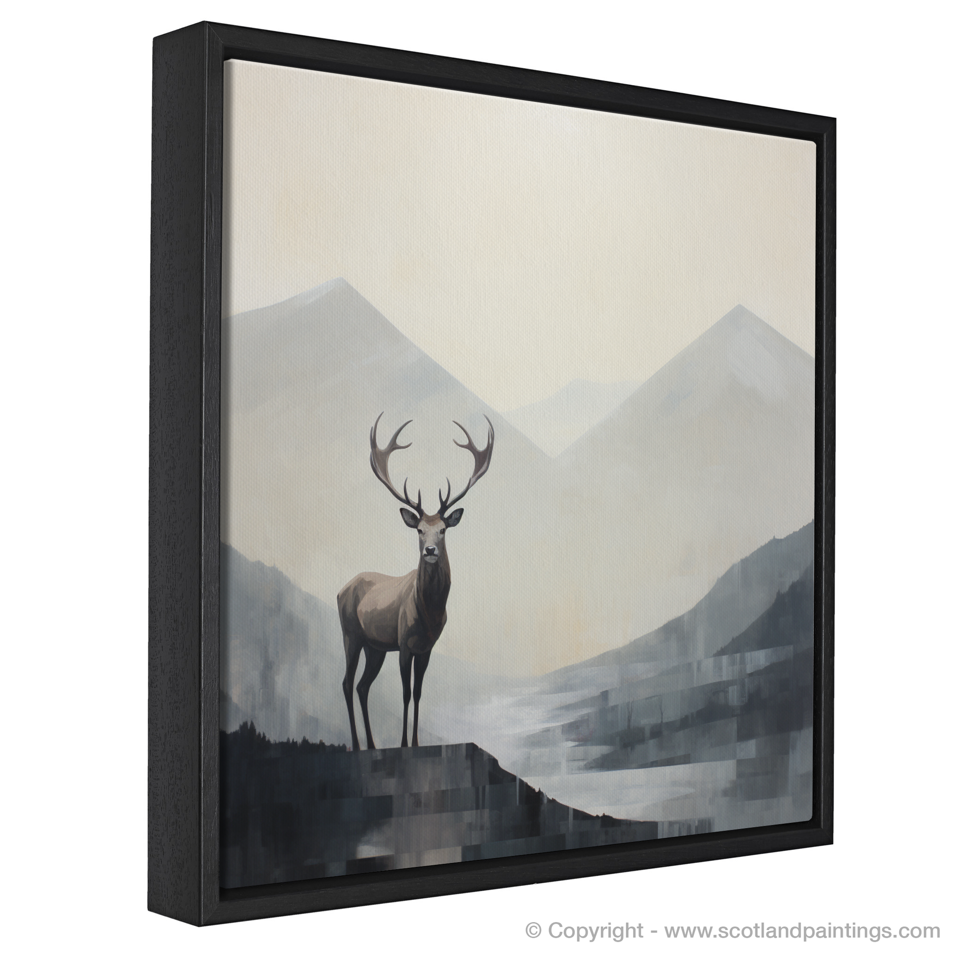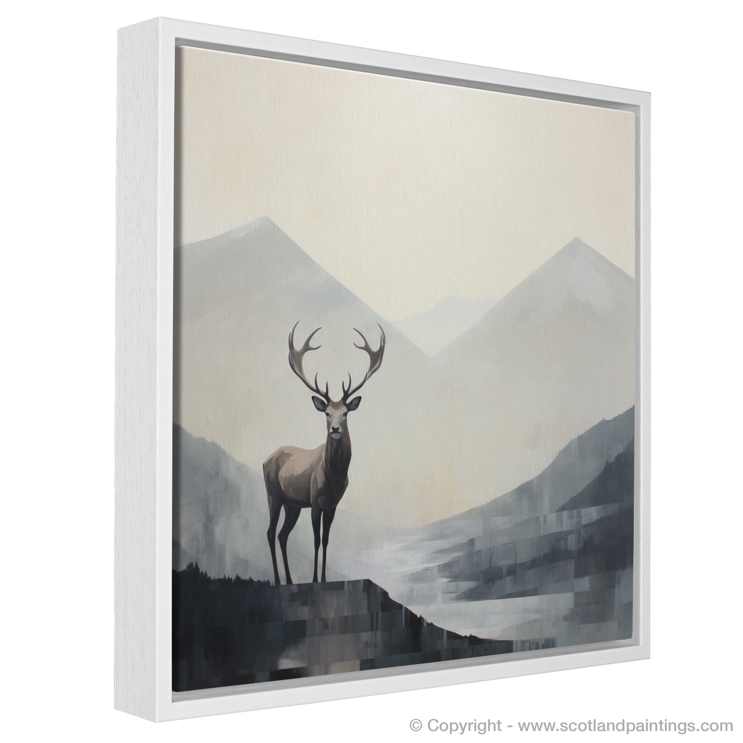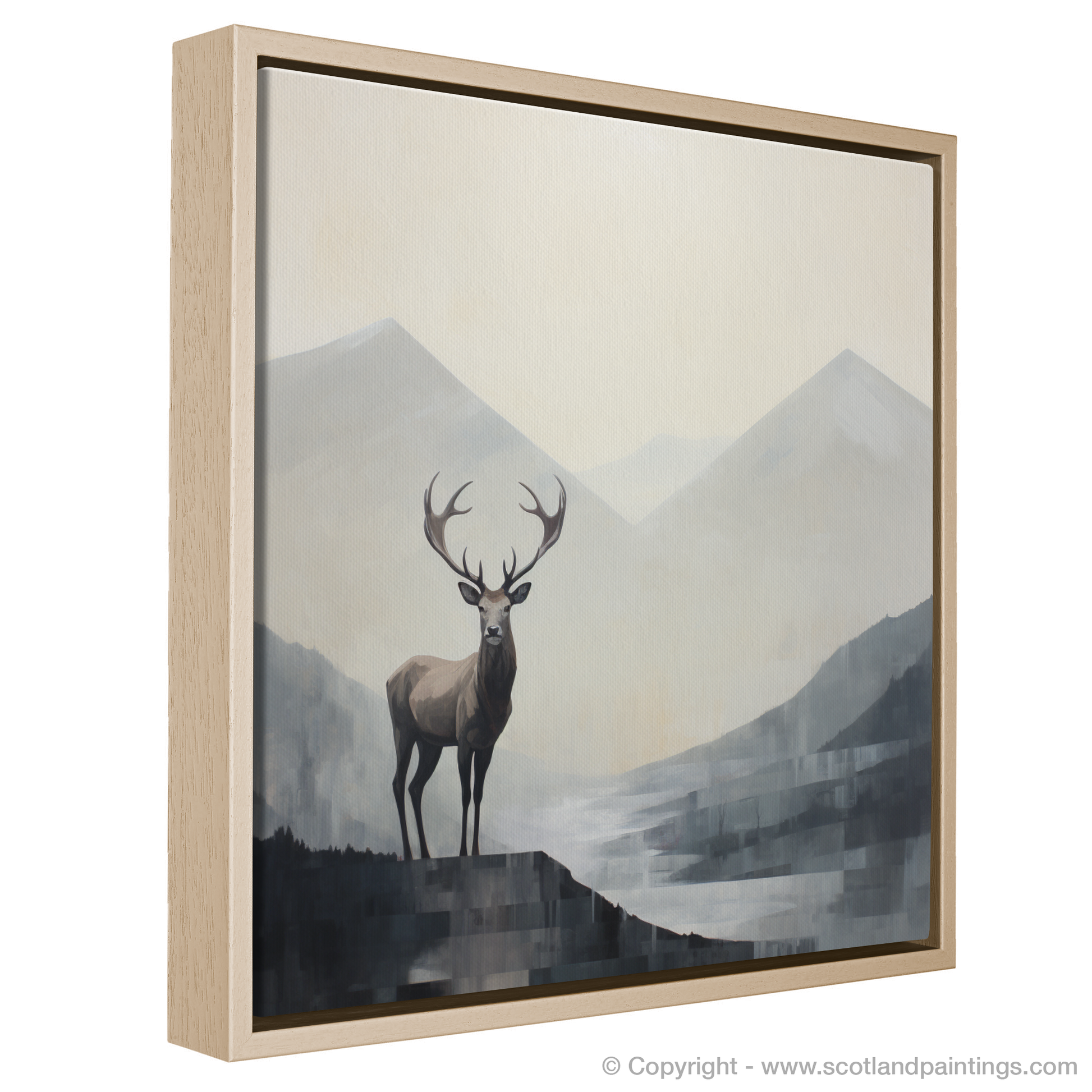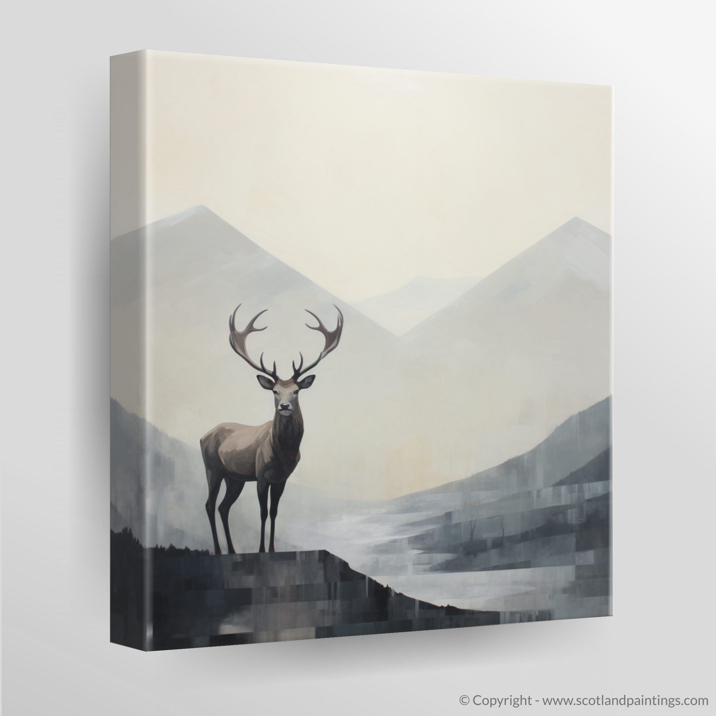 Emerge from the mists of Glencoe into a realm of serene beauty with this entrancing print, resplendently capturing the essence of minimalistic art. Enveloped in an atmosphere of tranquility, the poised silhouette of a majestic stag stands as a striking contrast against the ethereal backdrop of layered mountains. Soft, muted tones of beiges and greys compose an otherworldly landscape that fuses with the muted amber of dawn or the fading glow of dusk, washing the scene in a dreamlike quality.