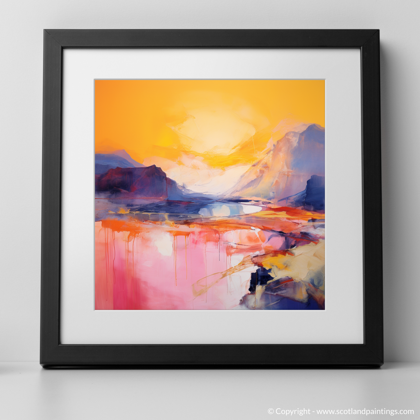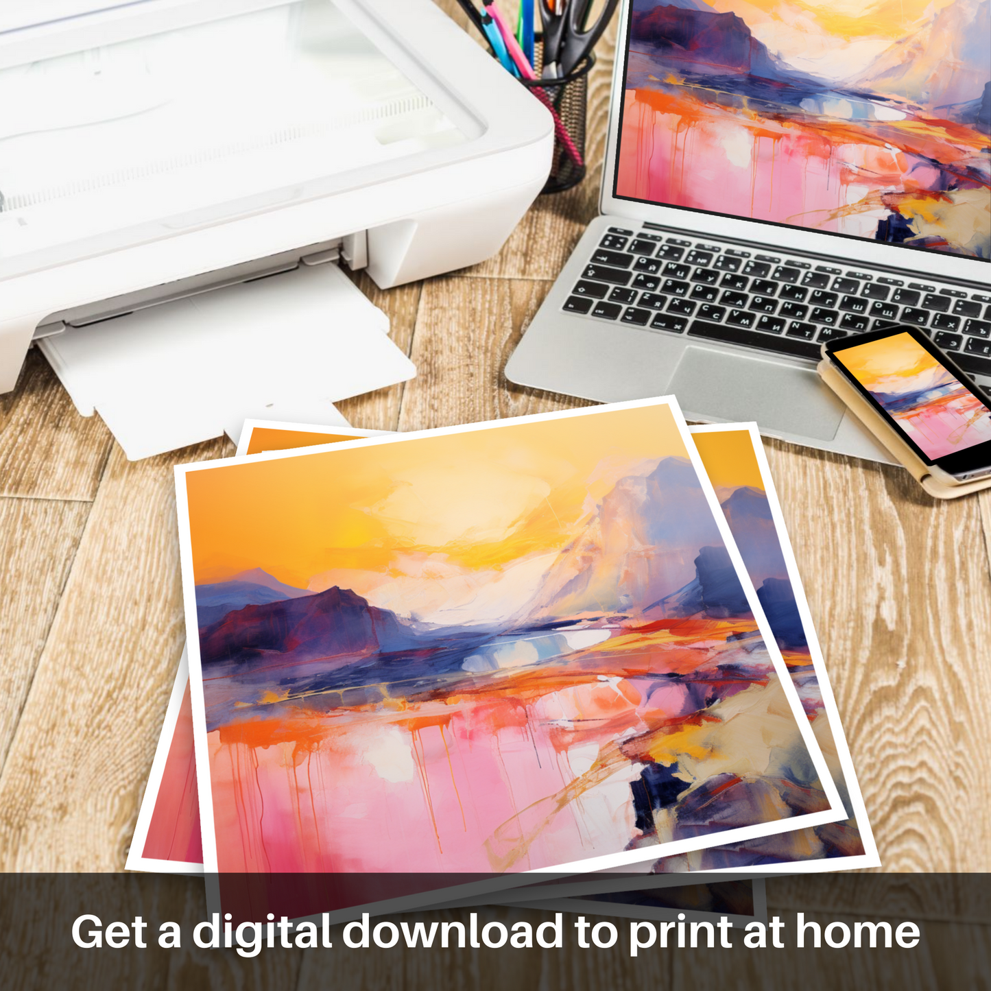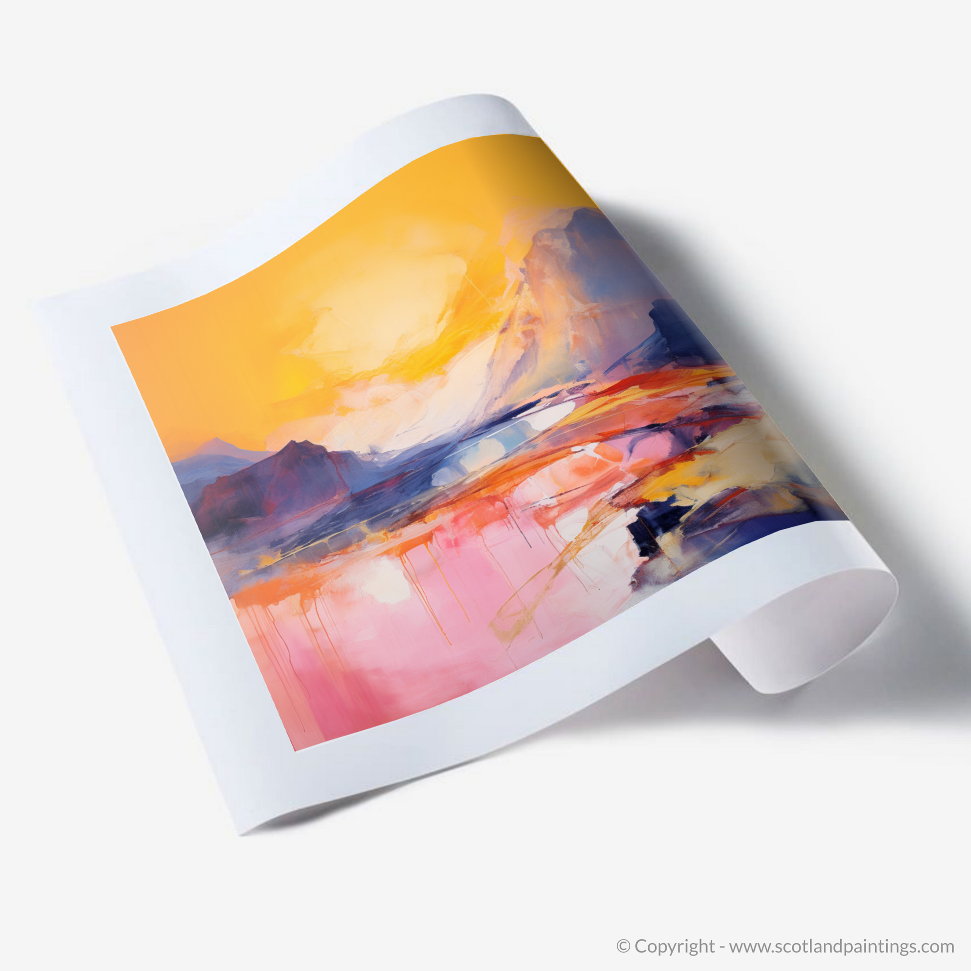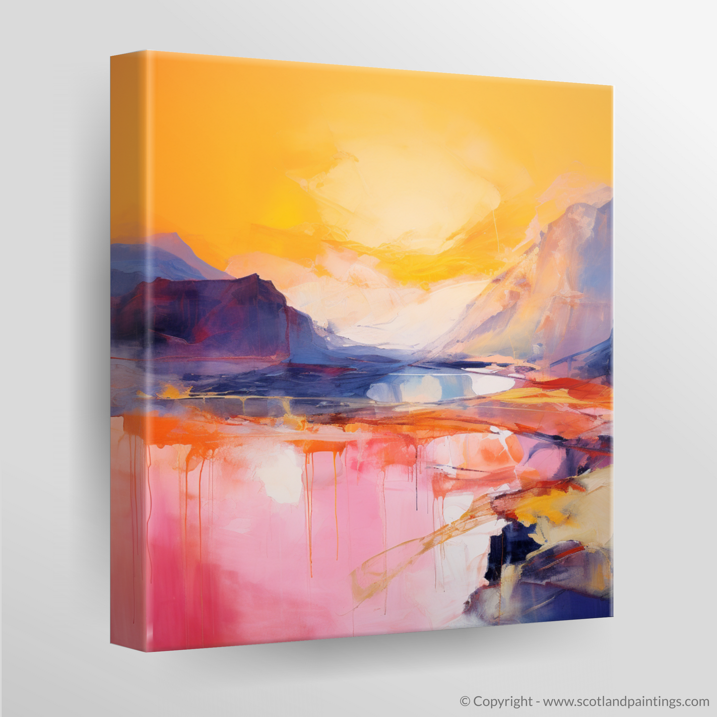 Awash with the vibrant hues of a setting sun, this evocative piece captures the raw beauty of Glencoe's rugged landscape through an abstract lens. The artwork is a dynamic blend of warm oranges, pinks, and deep blues that dance across the canvas, conjuring images of the Scottish Highlands bathed in the ethereal light of twilight.