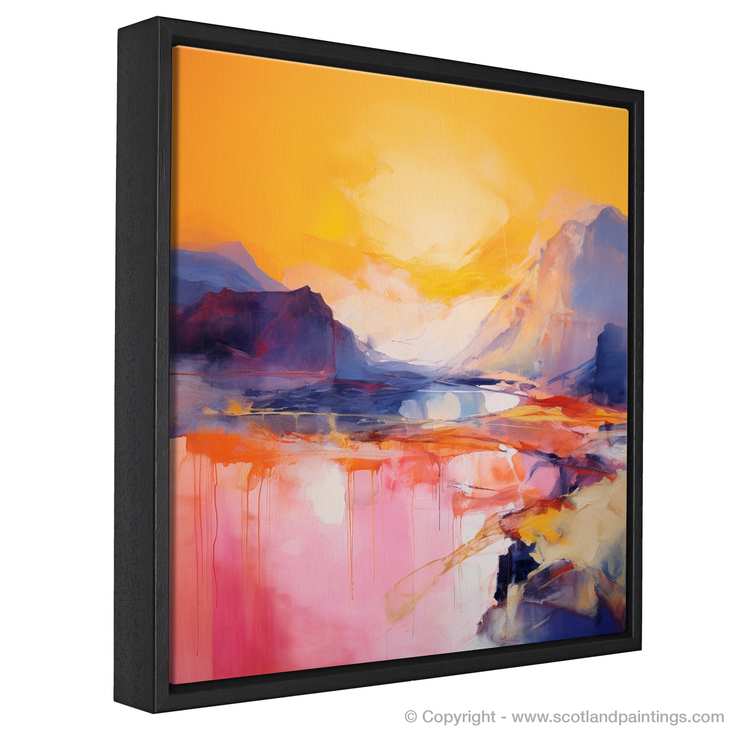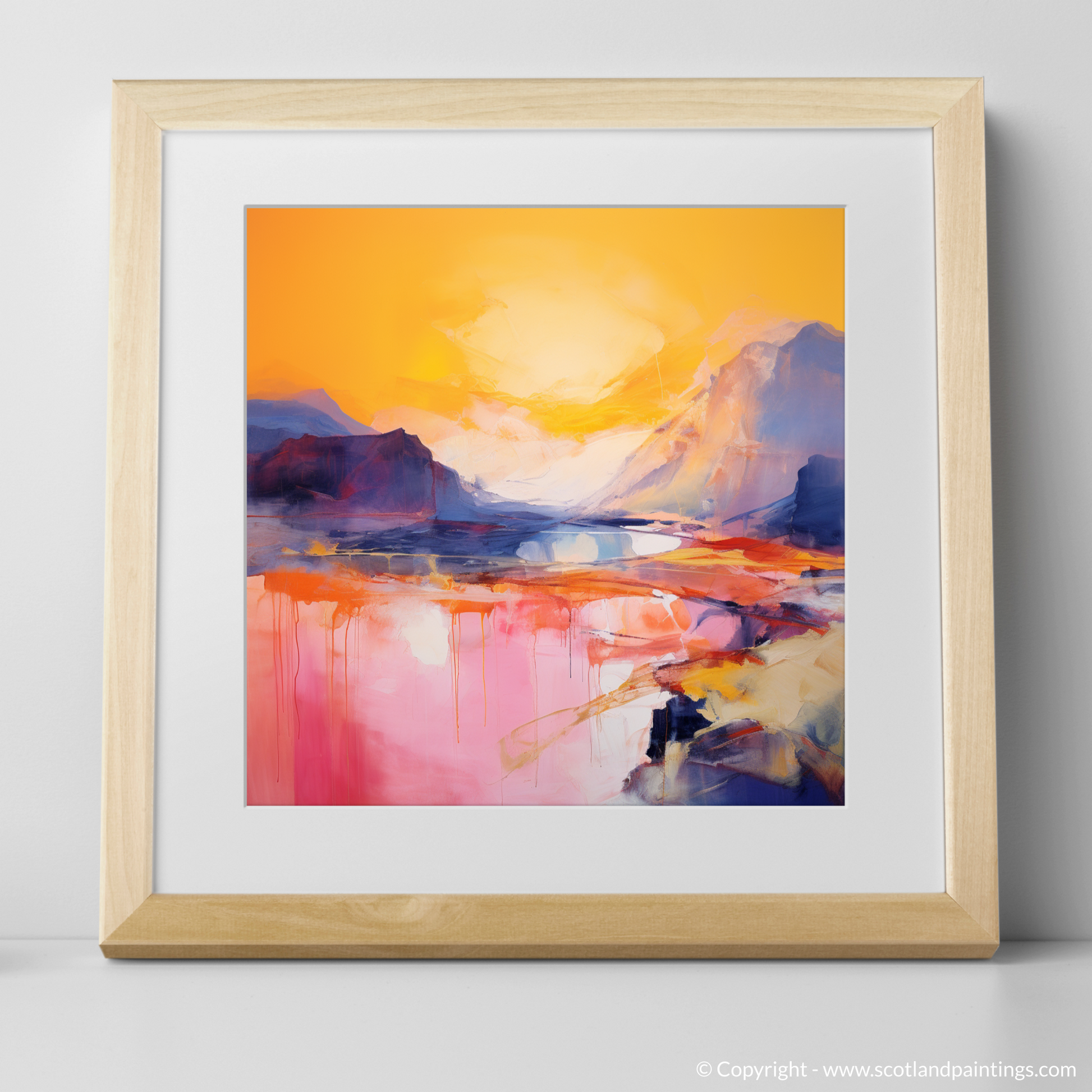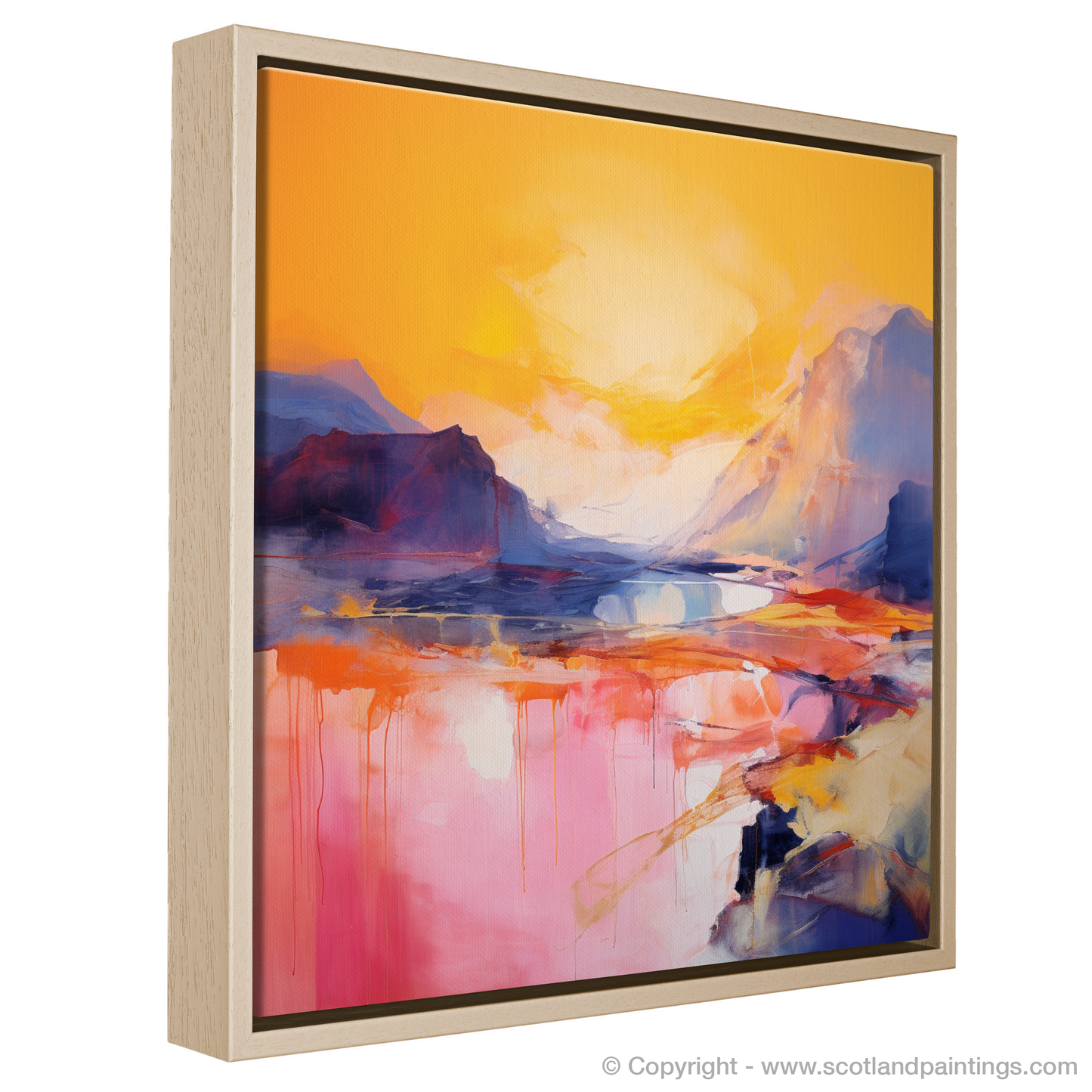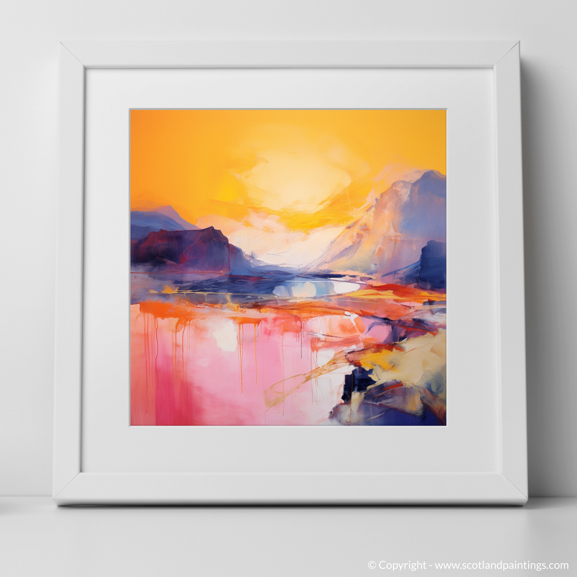 Awash with the vibrant hues of a setting sun, this evocative piece captures the raw beauty of Glencoe's rugged landscape through an abstract lens. The artwork is a dynamic blend of warm oranges, pinks, and deep blues that dance across the canvas, conjuring images of the Scottish Highlands bathed in the ethereal light of twilight.