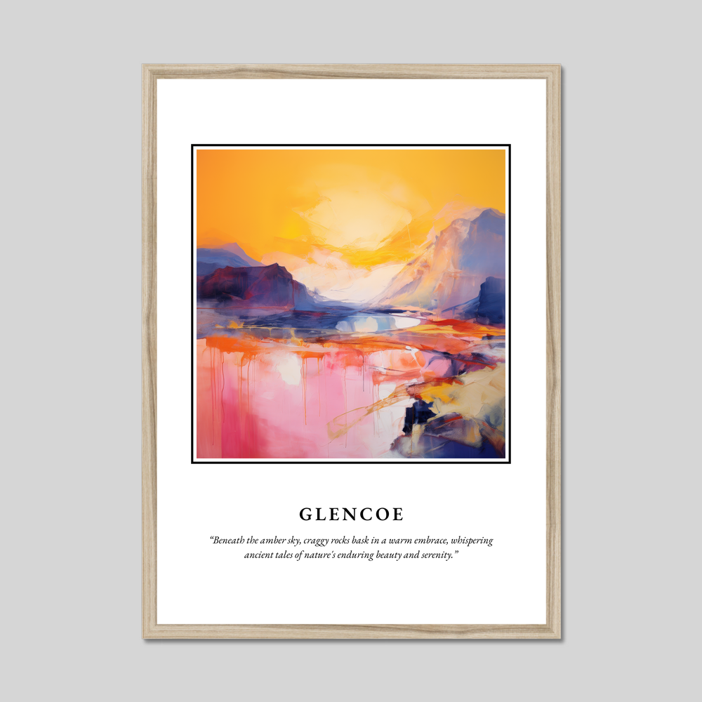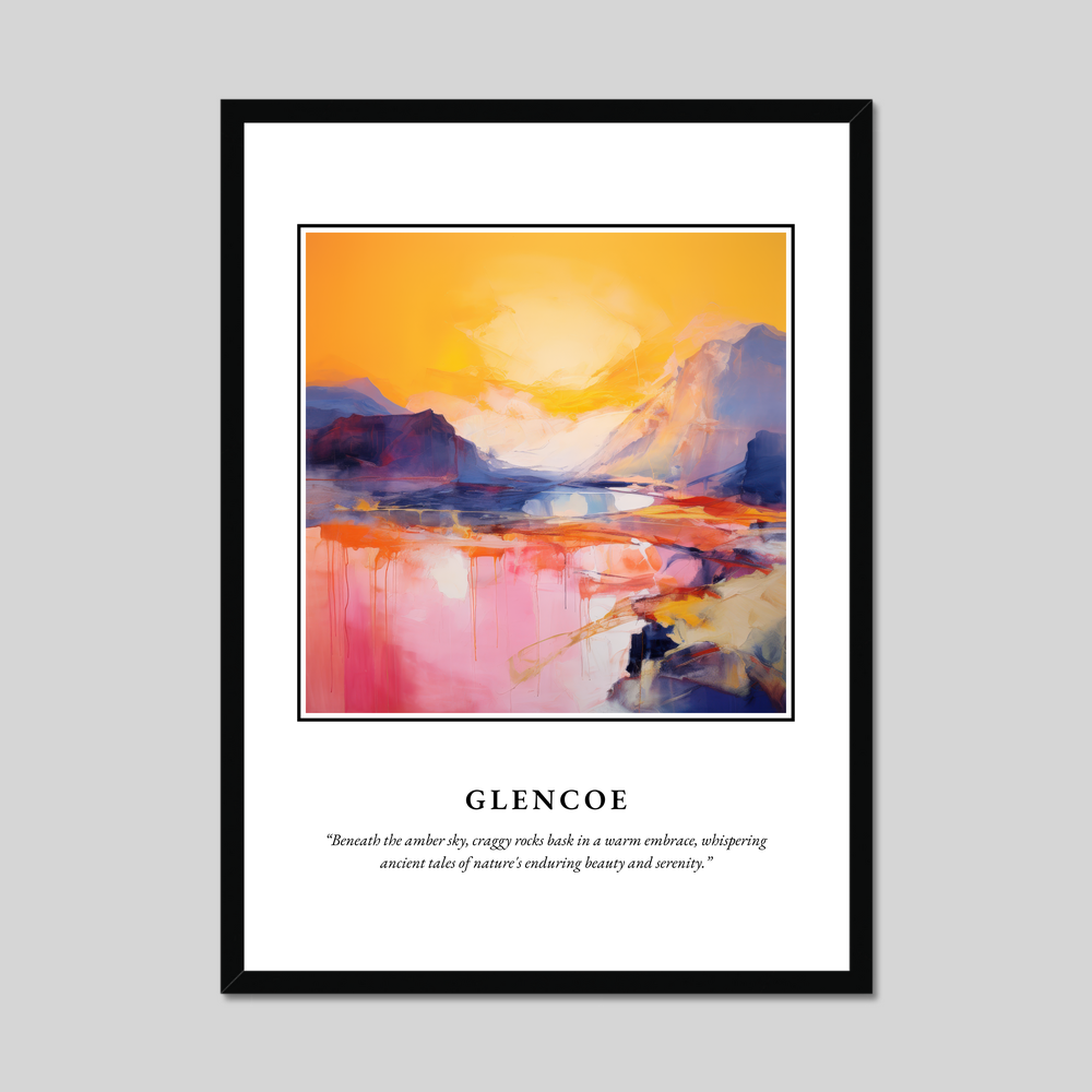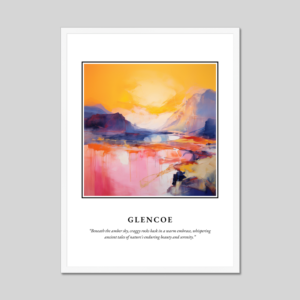 Below the grand title lies an abstract masterpiece, where vibrant splashes of colour and texture echo the dramatic landscape of Glencoe. The scene captures the ethereal dance of an amber sky as it casts its warm glow over craggy rocks and serene valleys. The painting’s fluid forms and sweeping lines invite viewers to explore a realm where imagination meets nature's timeless splendour.