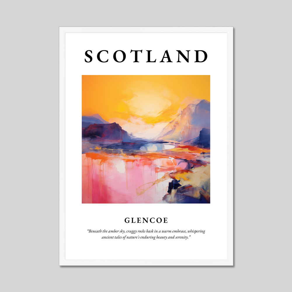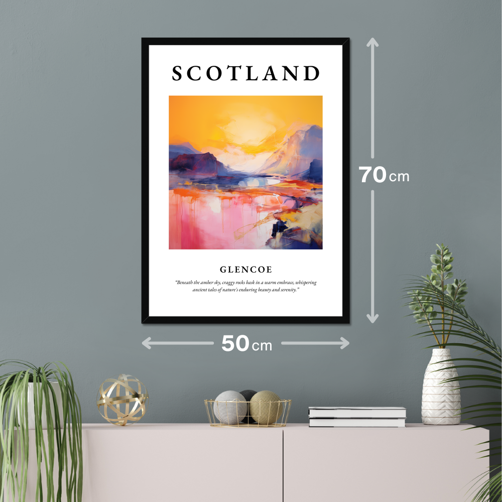 Experience the mystical allure of Scotland with our captivating framed poster print, measuring a generous 50cm x 70cm. This exquisite piece of art, available in your choice of black, white, or natural wood-effect frames, is destined to be the focal point of any room. The word “SCOTLAND” graces the top in striking bold lettering, setting the stage for a truly mesmerising journey through the rugged beauty of Glencoe.