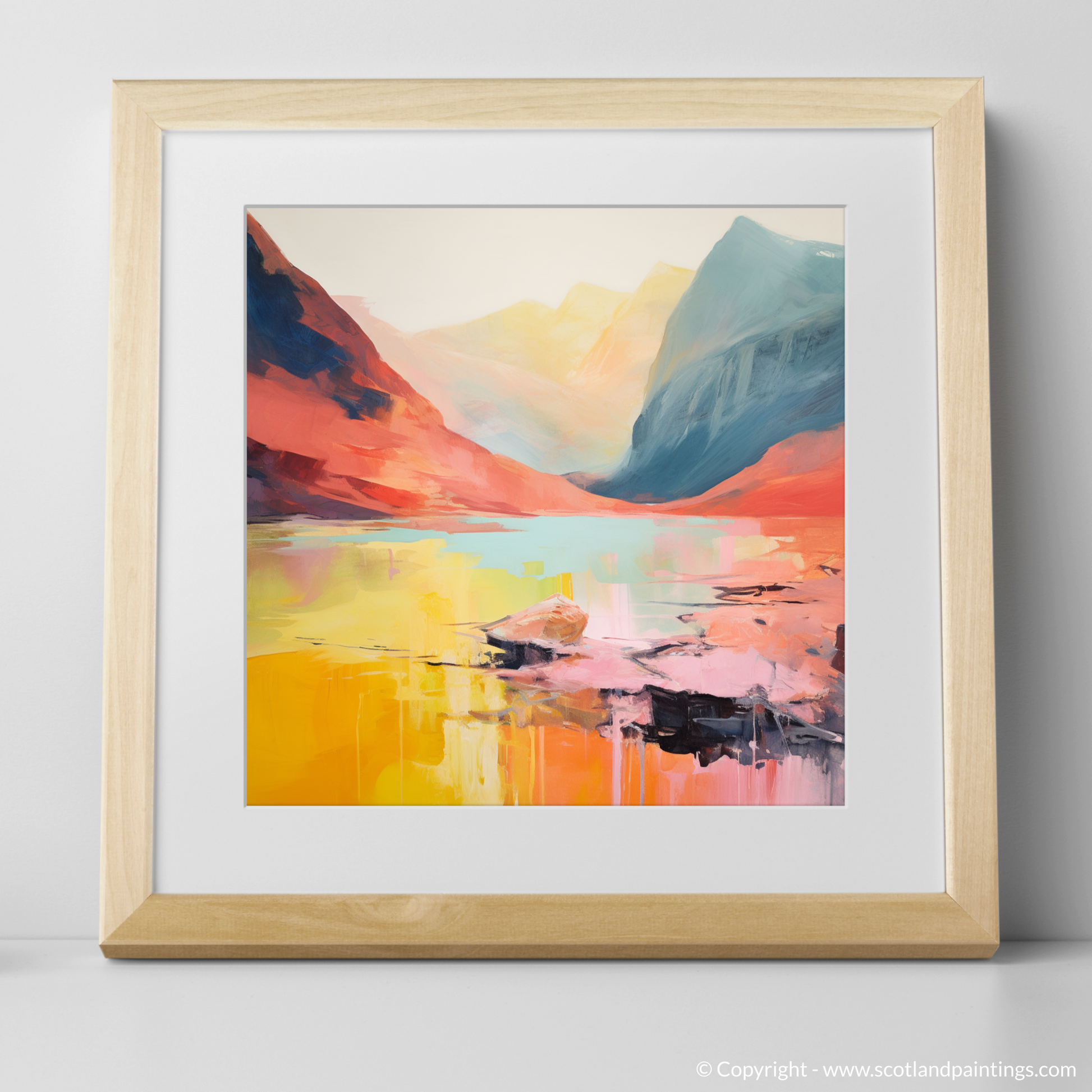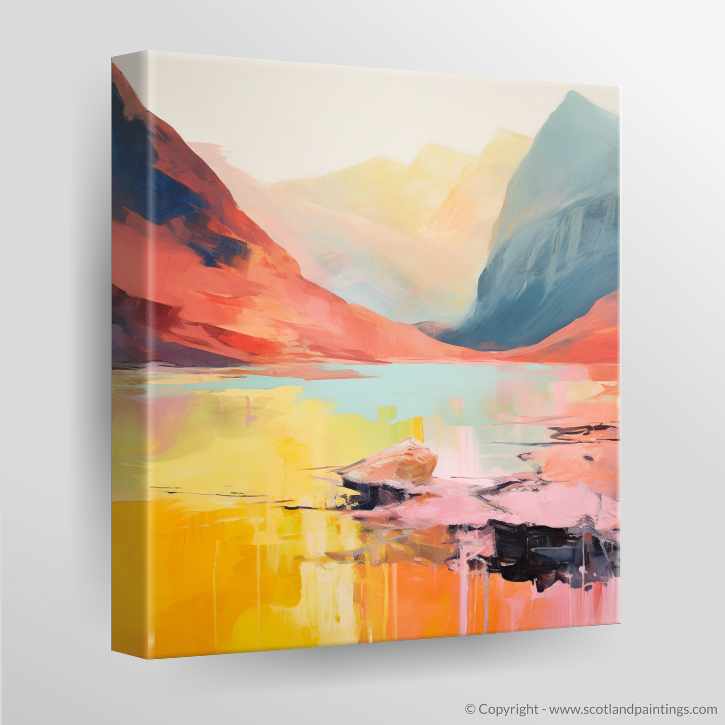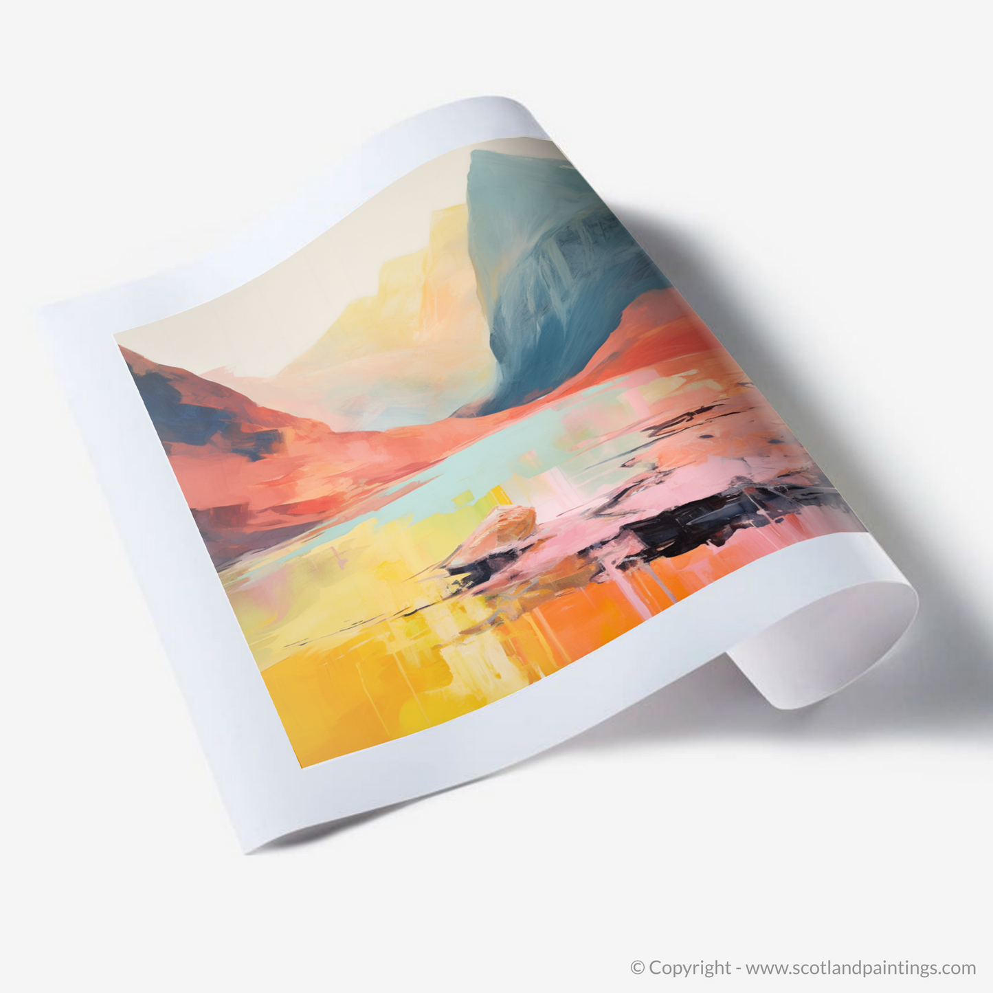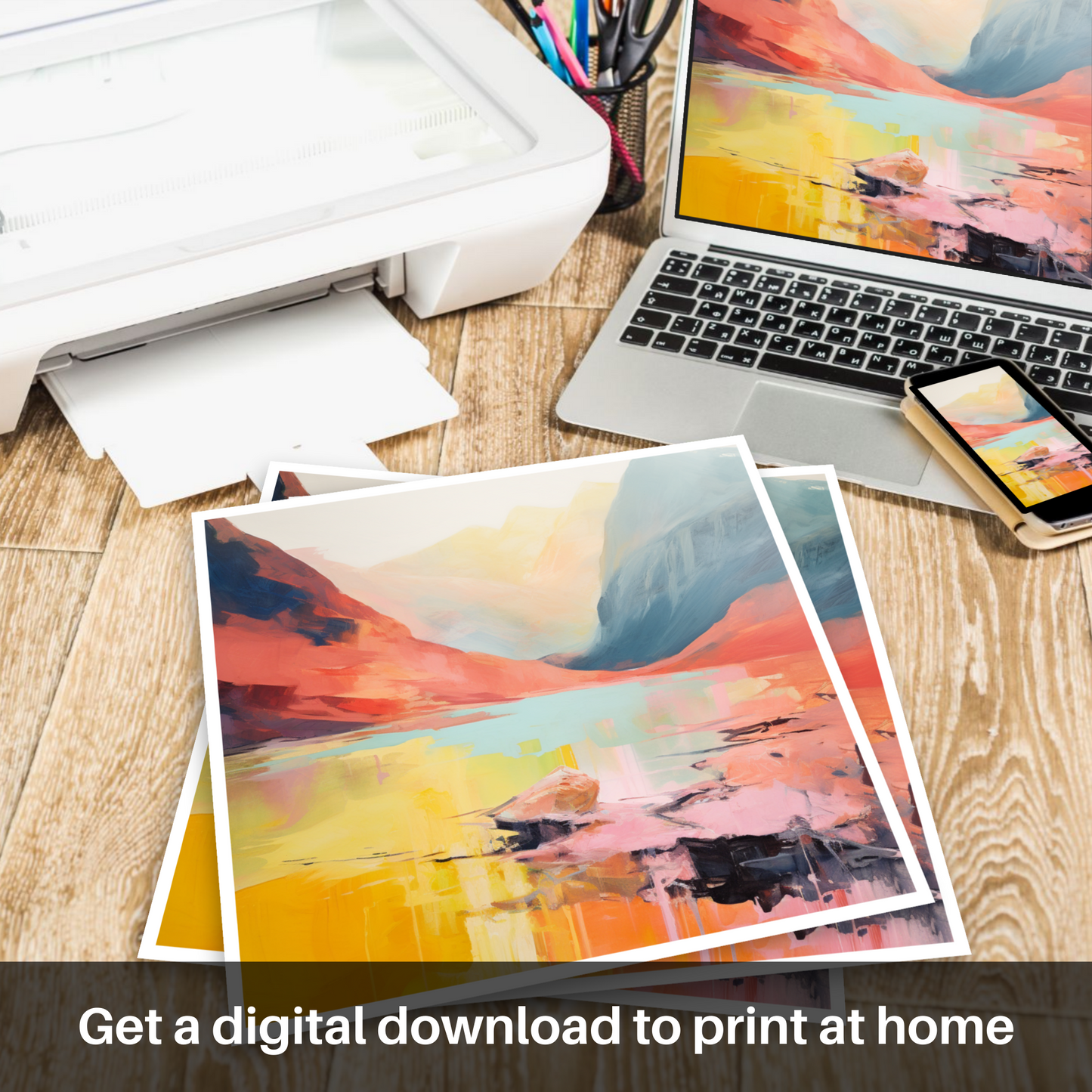 Immerse your senses in the radiant splendour of the Scottish highlands with this exquisite abstract rendition of Glencoe's rugged beauty. The arresting symphony of colours brings to life the craggy escarpments and velvety waters, capturing the essence of nature's enchantment with broad, emotive brushstrokes. Witness a palette where fiery crimsons and deep rusts dance with the delicate pales of dawn, creating a scene that hums with the warmth of a highland sunrise against solemn, towering peaks.