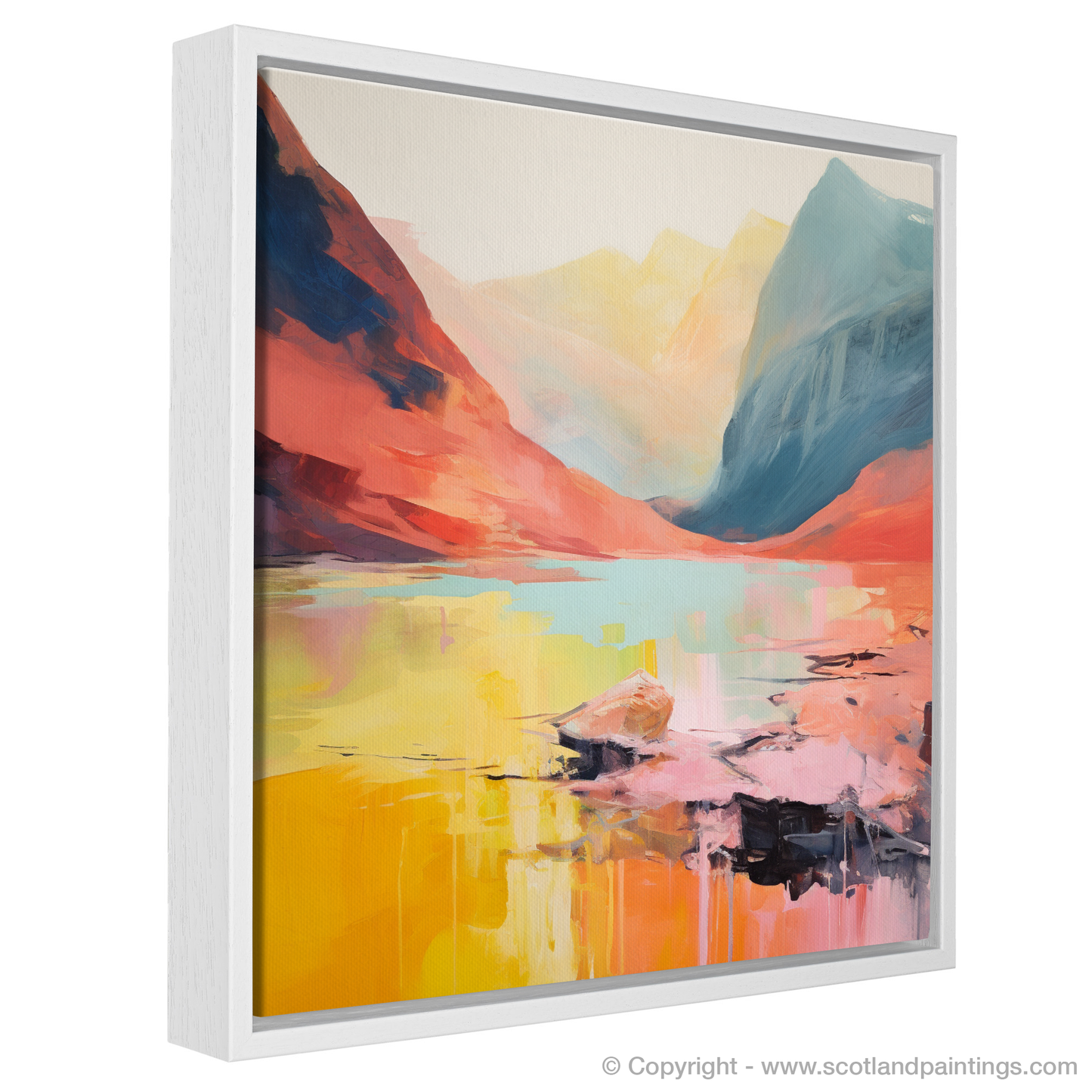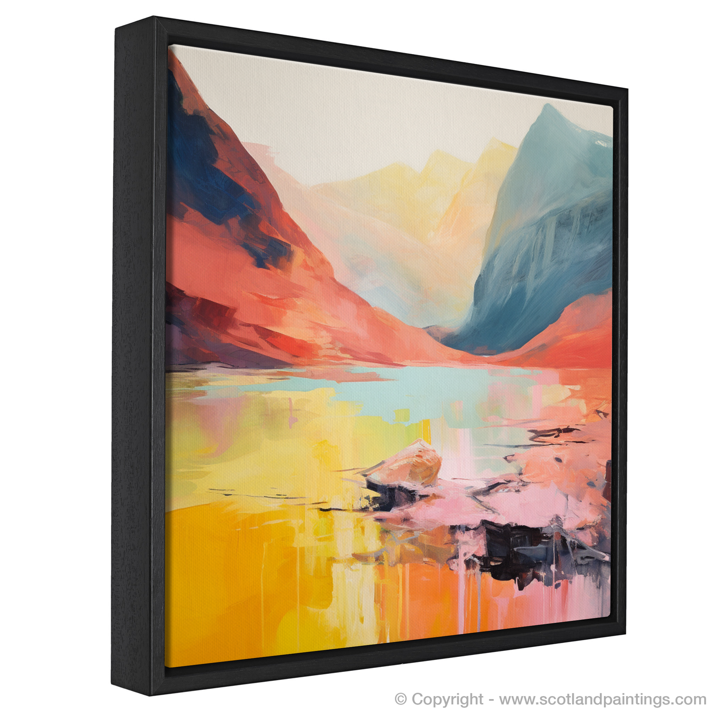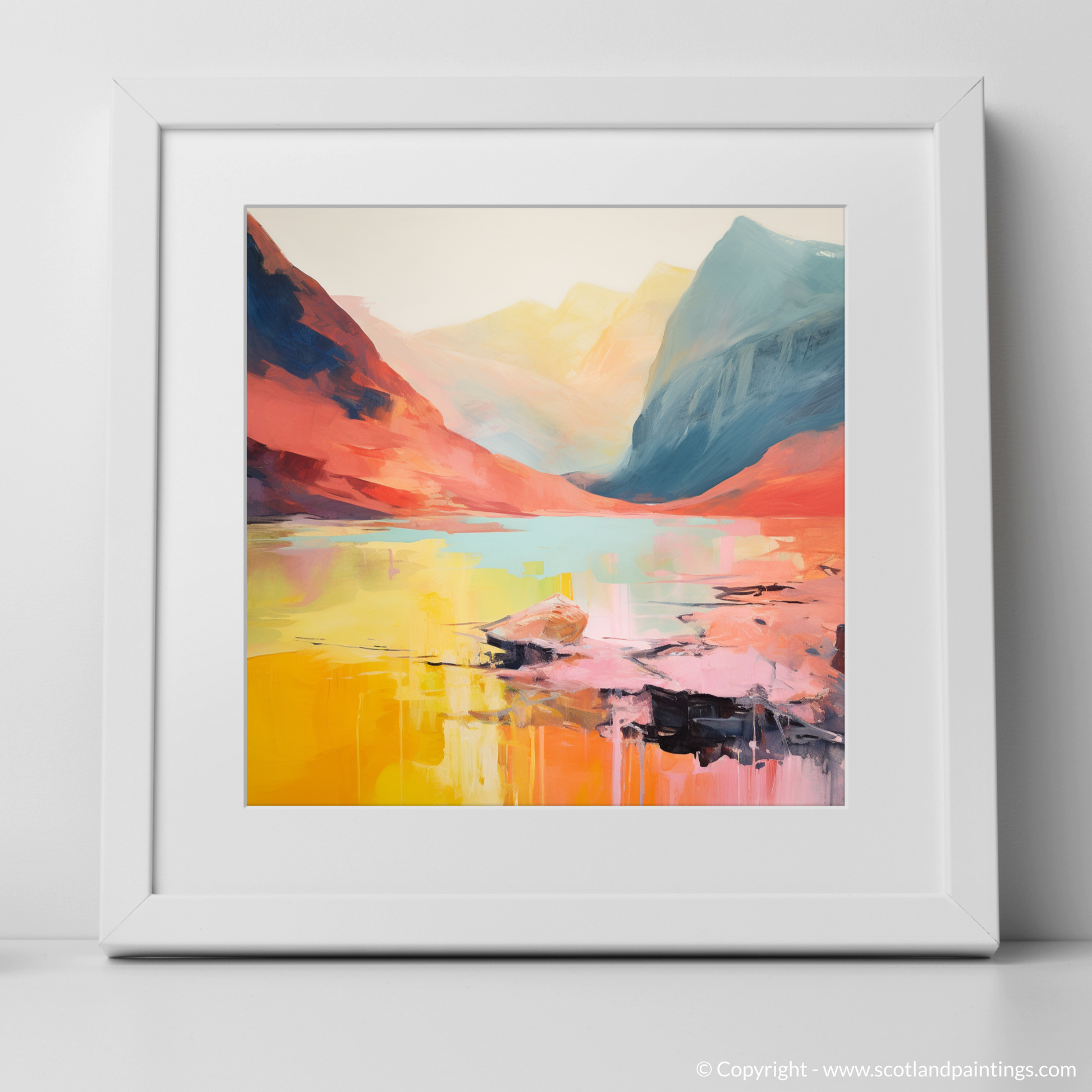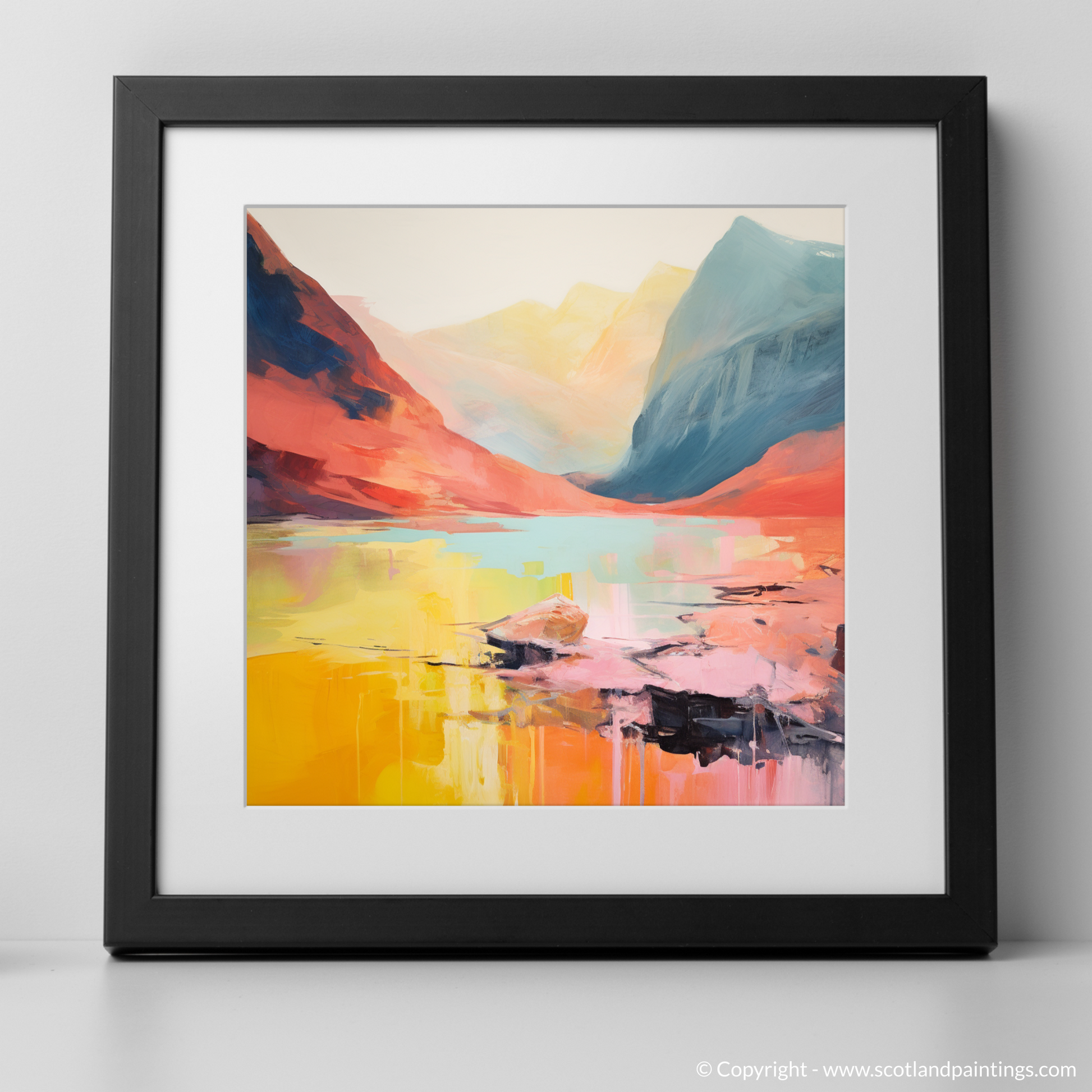 Immerse your senses in the radiant splendour of the Scottish highlands with this exquisite abstract rendition of Glencoe's rugged beauty. The arresting symphony of colours brings to life the craggy escarpments and velvety waters, capturing the essence of nature's enchantment with broad, emotive brushstrokes. Witness a palette where fiery crimsons and deep rusts dance with the delicate pales of dawn, creating a scene that hums with the warmth of a highland sunrise against solemn, towering peaks.