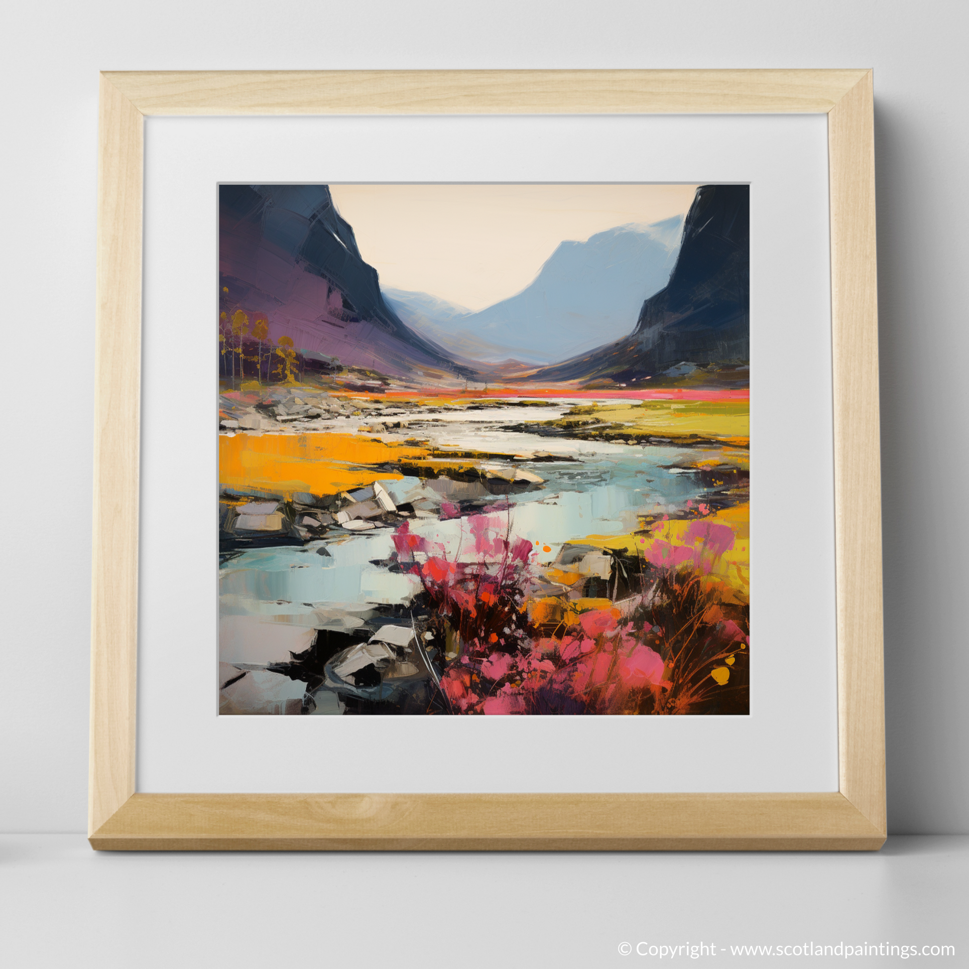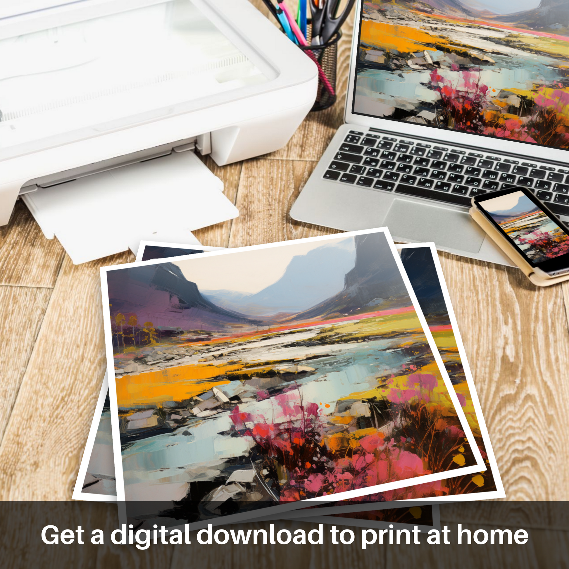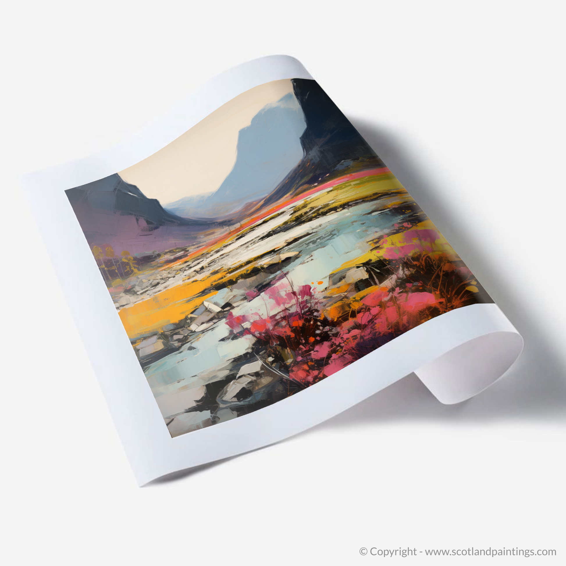 Immerse your senses in the rugged splendour of Glencoe with our vivid abstract print, echoing the untamed beauty of the heather blooms flanking the River Coe. This arresting piece captures the essence of a clear sky reflecting upon gentle waters, with strokes of pink and crimson heather juxtaposed against the tranquil blue of the river. Wisps of gold and tangerine hues whisper of the warmth of the setting sun as it caresses the land, while the soaring mountains in monochromatic shades of purple and charcoal stand sentinel over the peaceful valley.