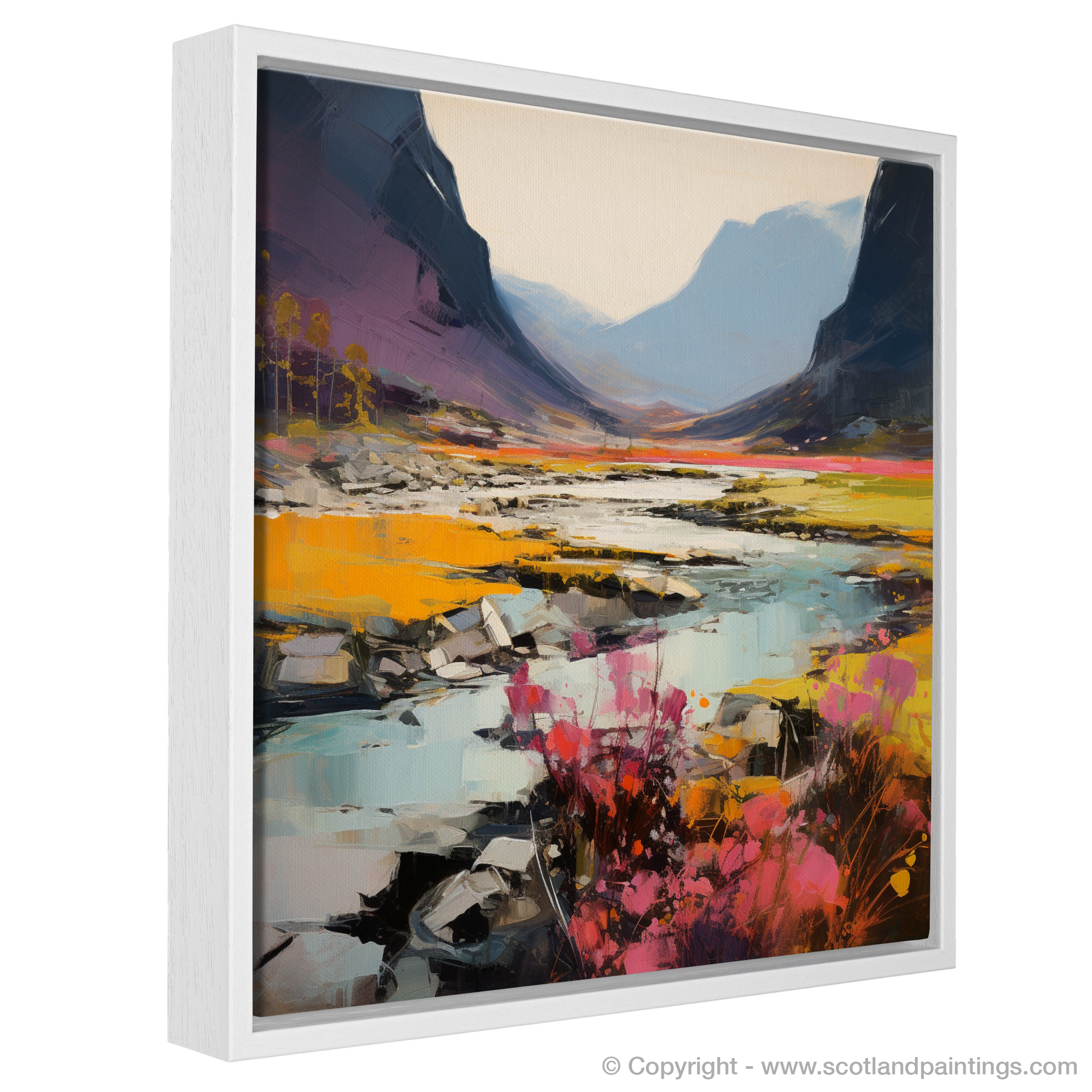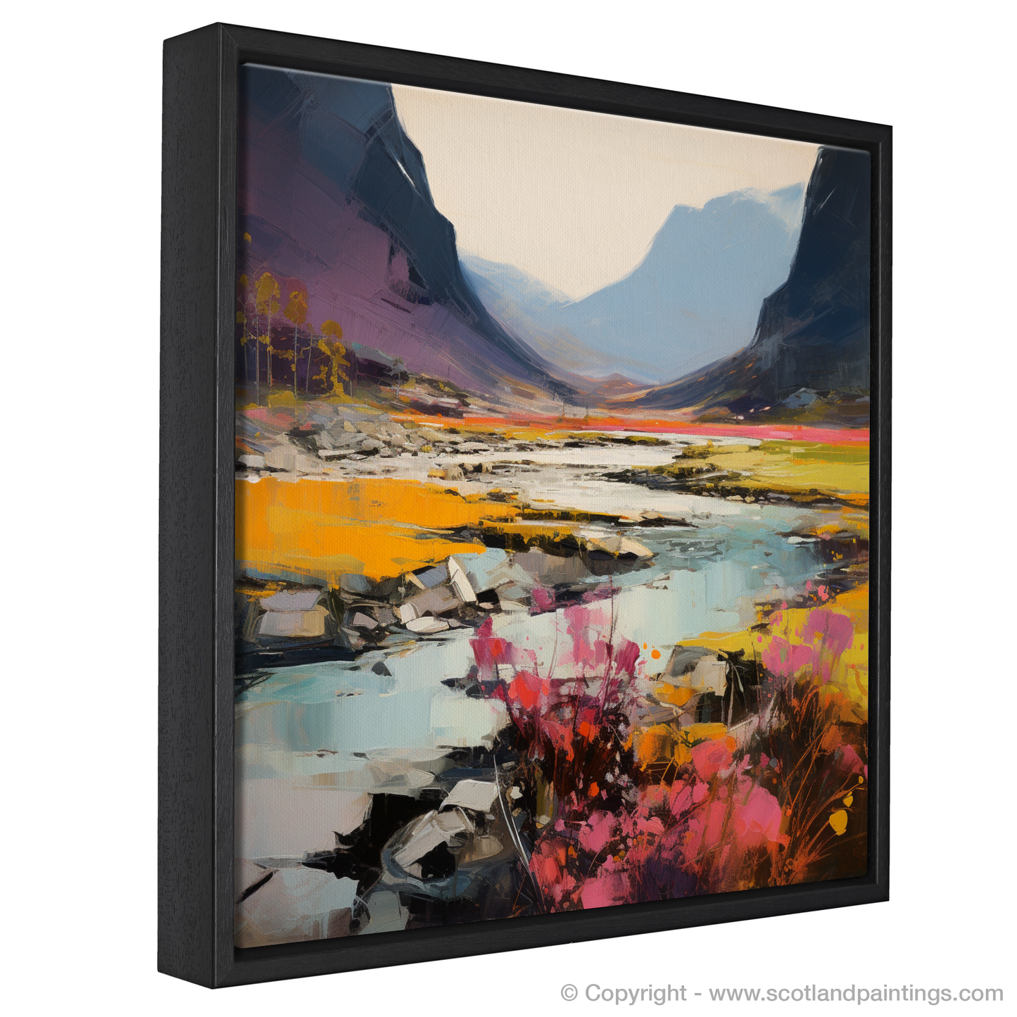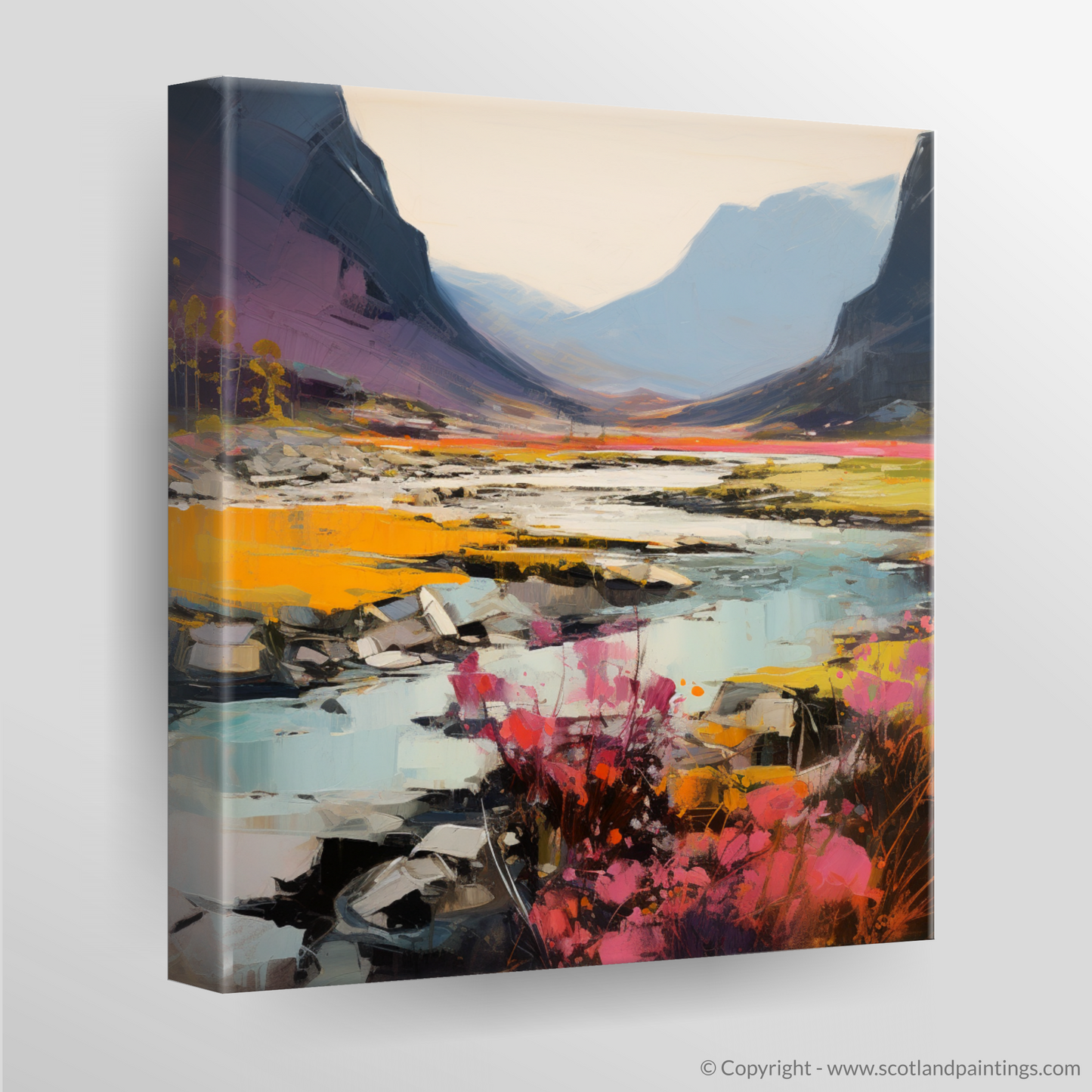 Immerse your senses in the rugged splendour of Glencoe with our vivid abstract print, echoing the untamed beauty of the heather blooms flanking the River Coe. This arresting piece captures the essence of a clear sky reflecting upon gentle waters, with strokes of pink and crimson heather juxtaposed against the tranquil blue of the river. Wisps of gold and tangerine hues whisper of the warmth of the setting sun as it caresses the land, while the soaring mountains in monochromatic shades of purple and charcoal stand sentinel over the peaceful valley.