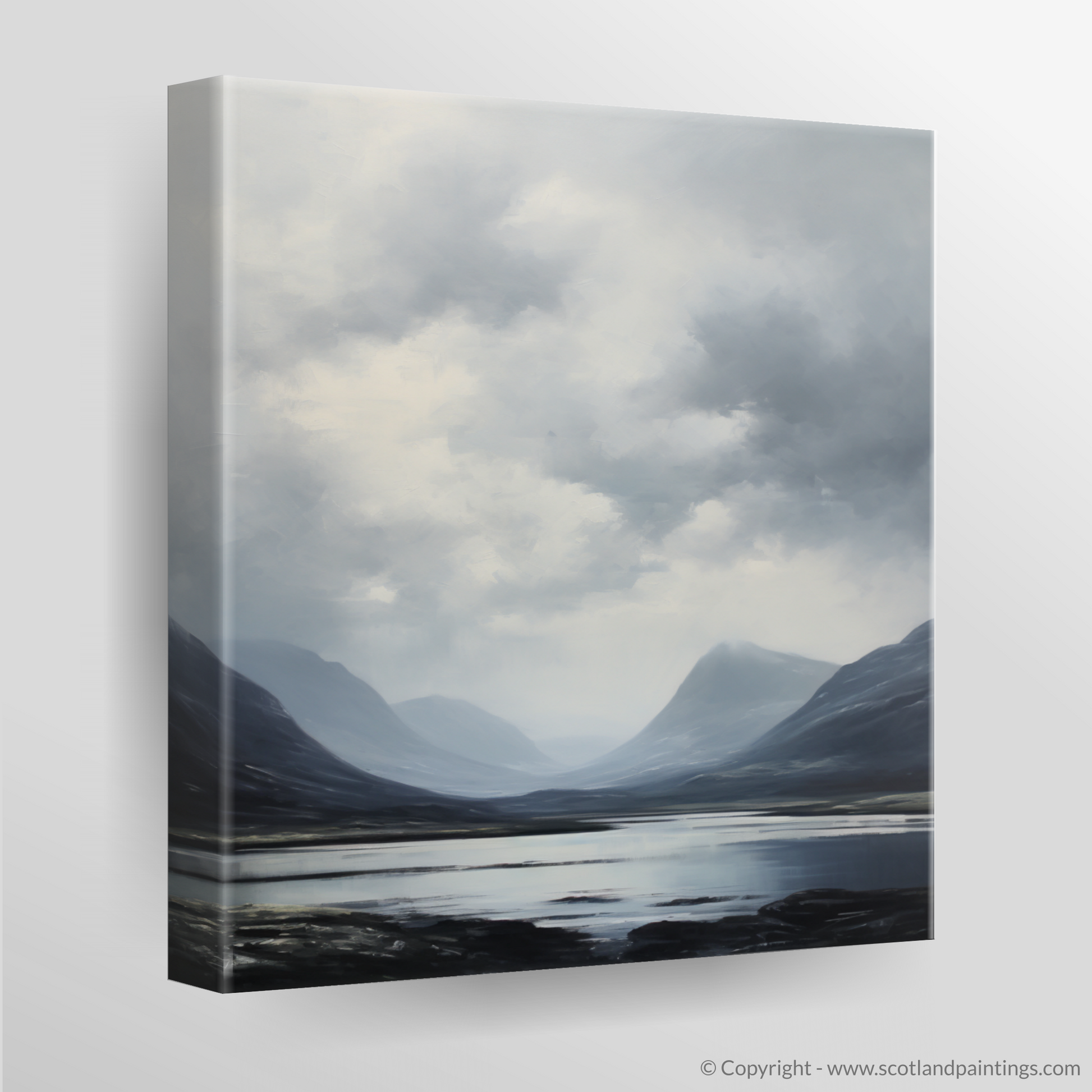 The clouds are masterfully rendered, swelling with a palpable intensity as they seem to churn and roil above the serene valley below. The light, reflected off the clouds, paints a mesmerising tapestry of silver and white, casting a soft glow over the tranquil loch that mirrors the sky's mood. Shrouded silhouettes of the majestic mountain peaks form a stark contrast, their outlines suggesting the enduring permanence and rugged beauty that is the Highlands.