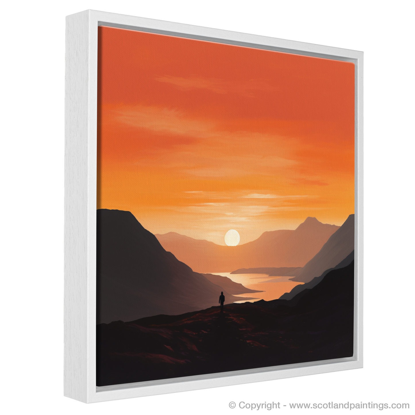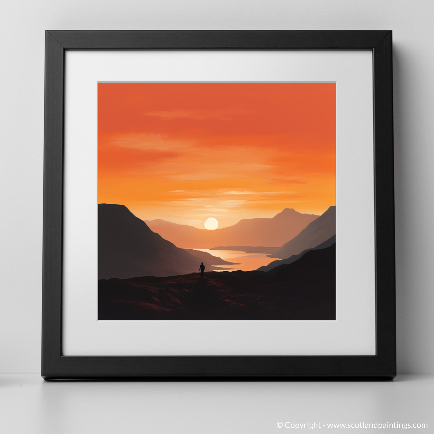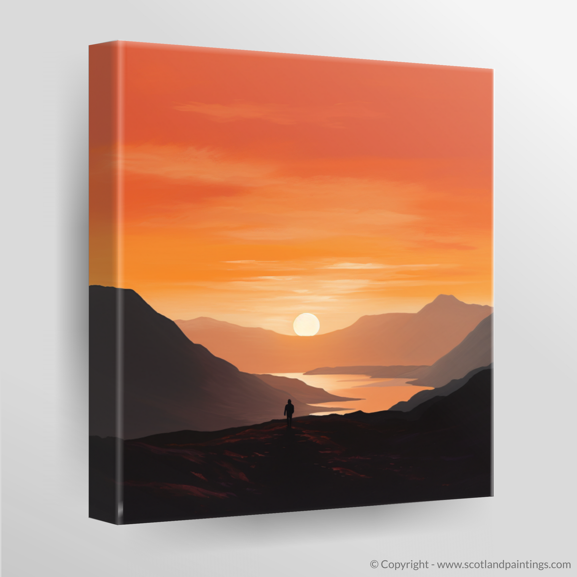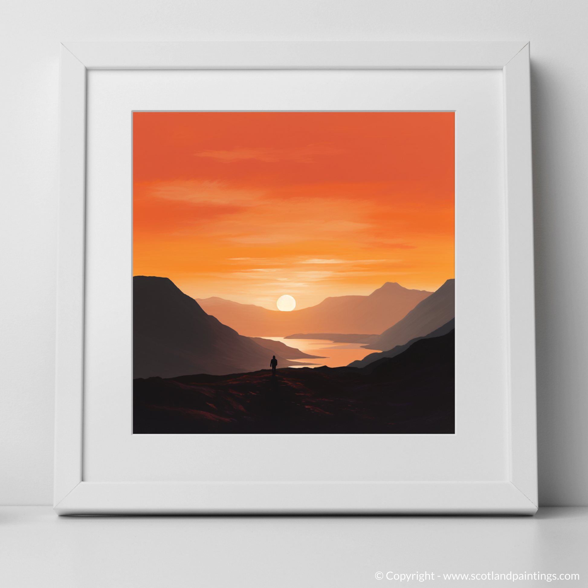 Immerse yourself in the tranquil beauty of twilight with this exquisite minimalist print from our 'Glencoe' collection. Bathed in the warm, radiant hues of sunset, this piece captures the serene grandeur of Glencoe's landscapes at the day's gentle close. The artwork masterfully employs a blend of fiery oranges, deep purples, and calming blues to depict the expansive sky transitioning from daylight to dusk.