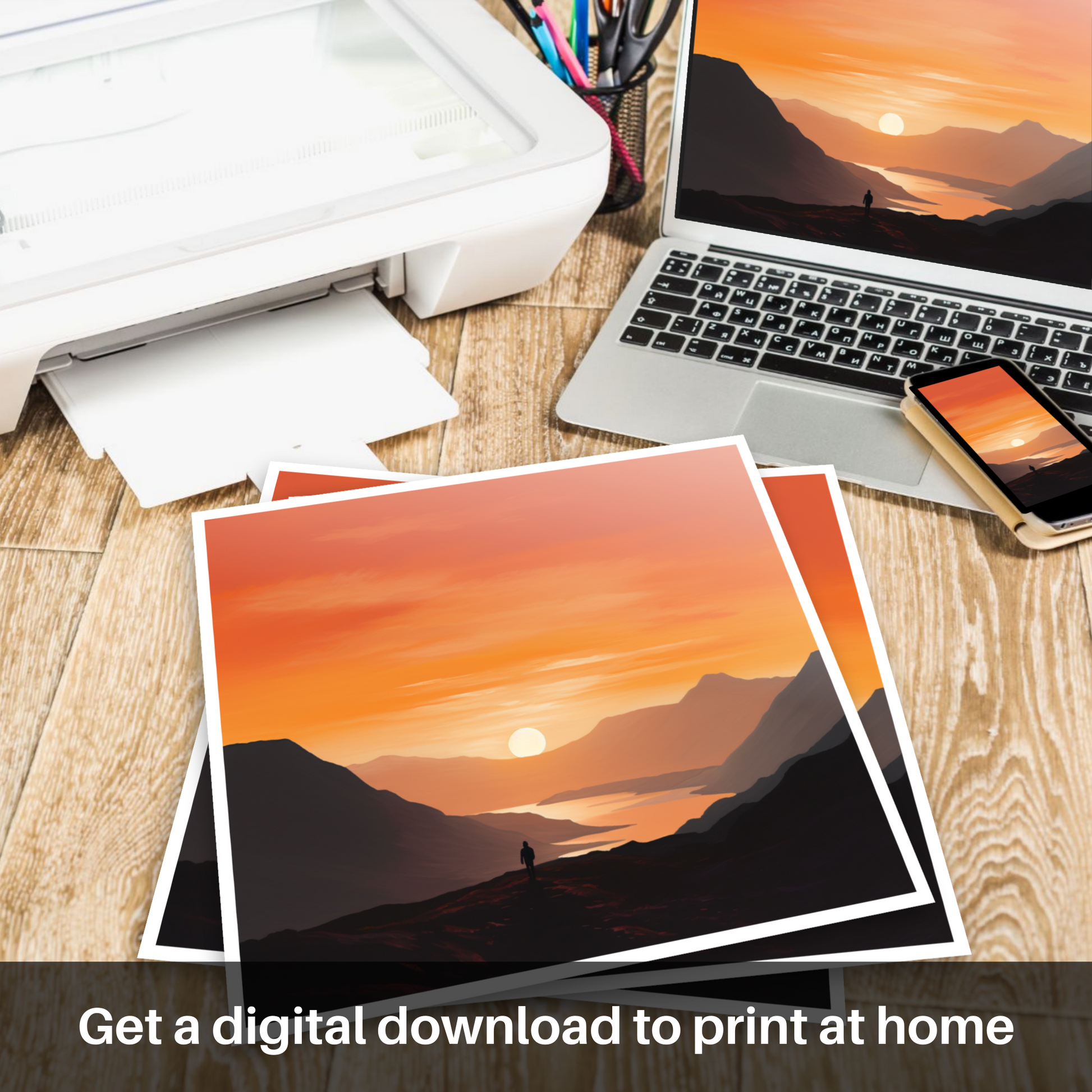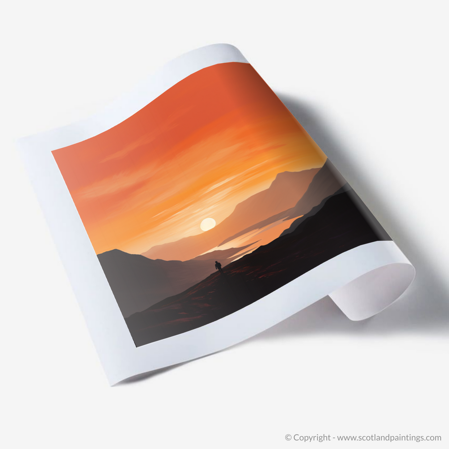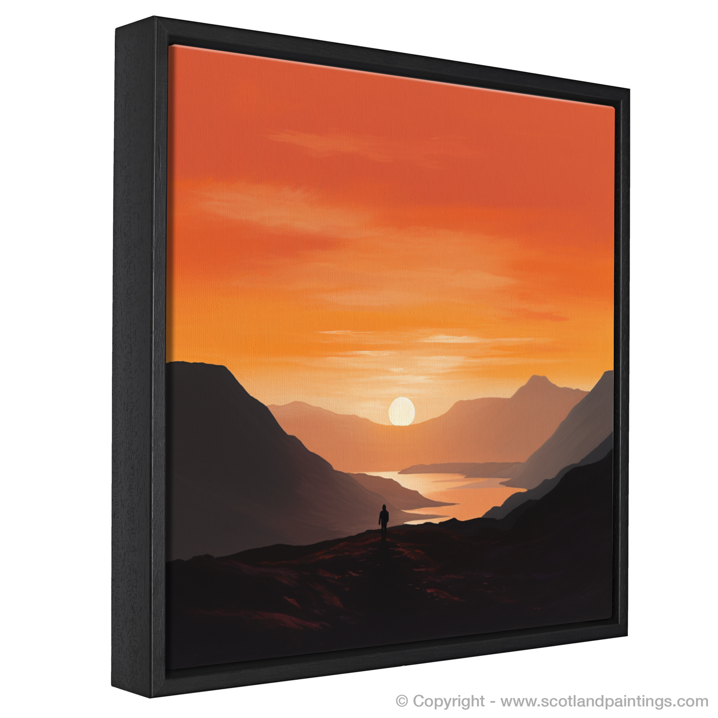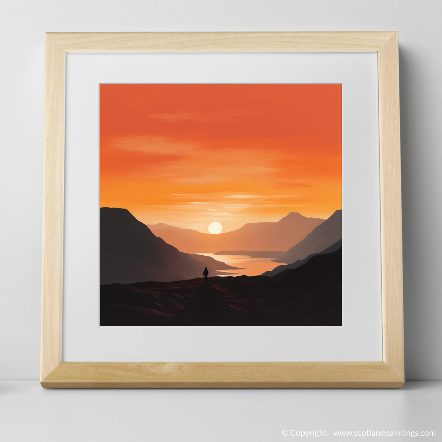 Immerse yourself in the tranquil beauty of twilight with this exquisite minimalist print from our 'Glencoe' collection. Bathed in the warm, radiant hues of sunset, this piece captures the serene grandeur of Glencoe's landscapes at the day's gentle close. The artwork masterfully employs a blend of fiery oranges, deep purples, and calming blues to depict the expansive sky transitioning from daylight to dusk.