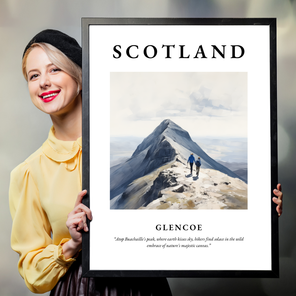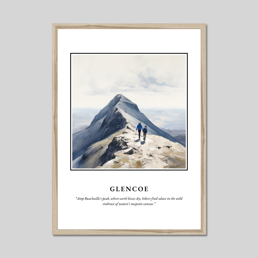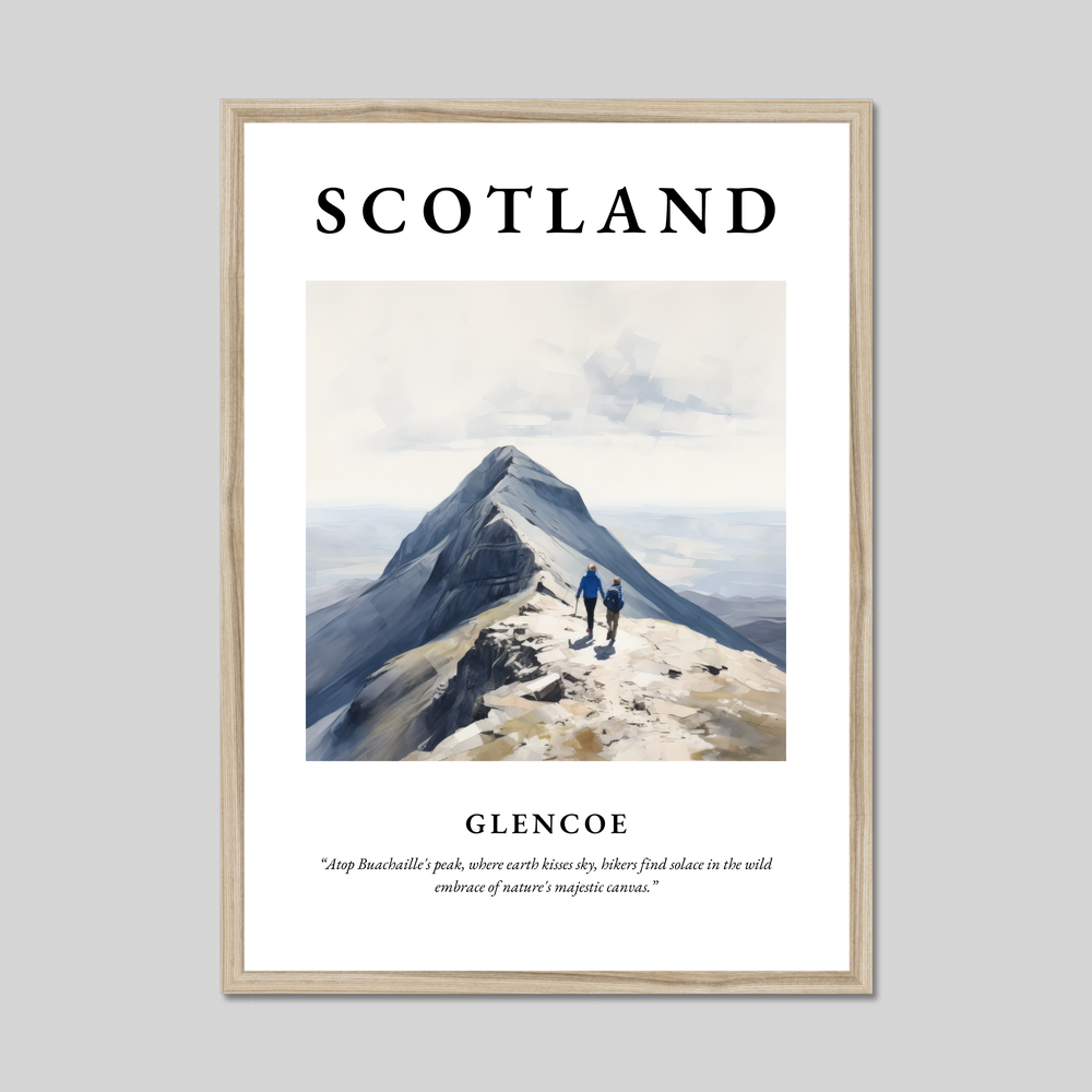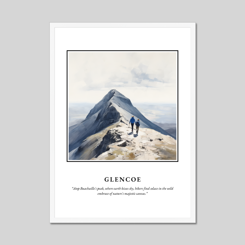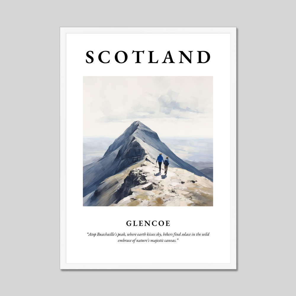 This stunning painting of Glencoe is a celebration of minimalism, capturing the raw essence of Buachaille's peak. The gentle brushstrokes and careful composition convey the grand scale and tranquil solitude found in the Scottish Highlands. The artwork is complemented by the quote, “Atop Buachaille's peak, where earth kisses sky, hikers find solace in the wild embrace of nature's majestic canvas,” inviting the viewer to experience the solace and grandeur of this unforgettable location.