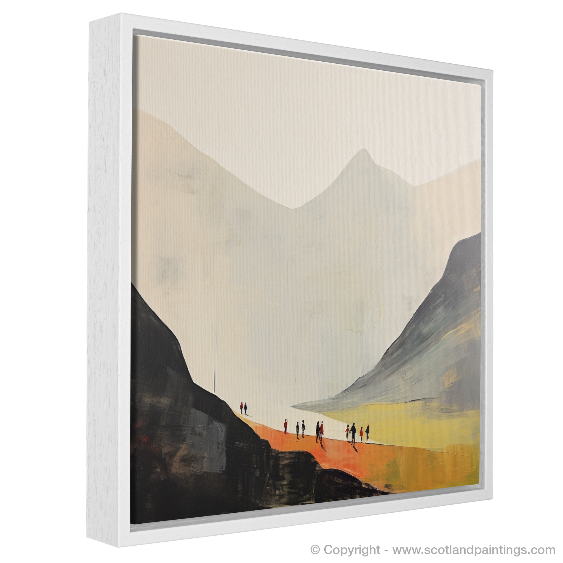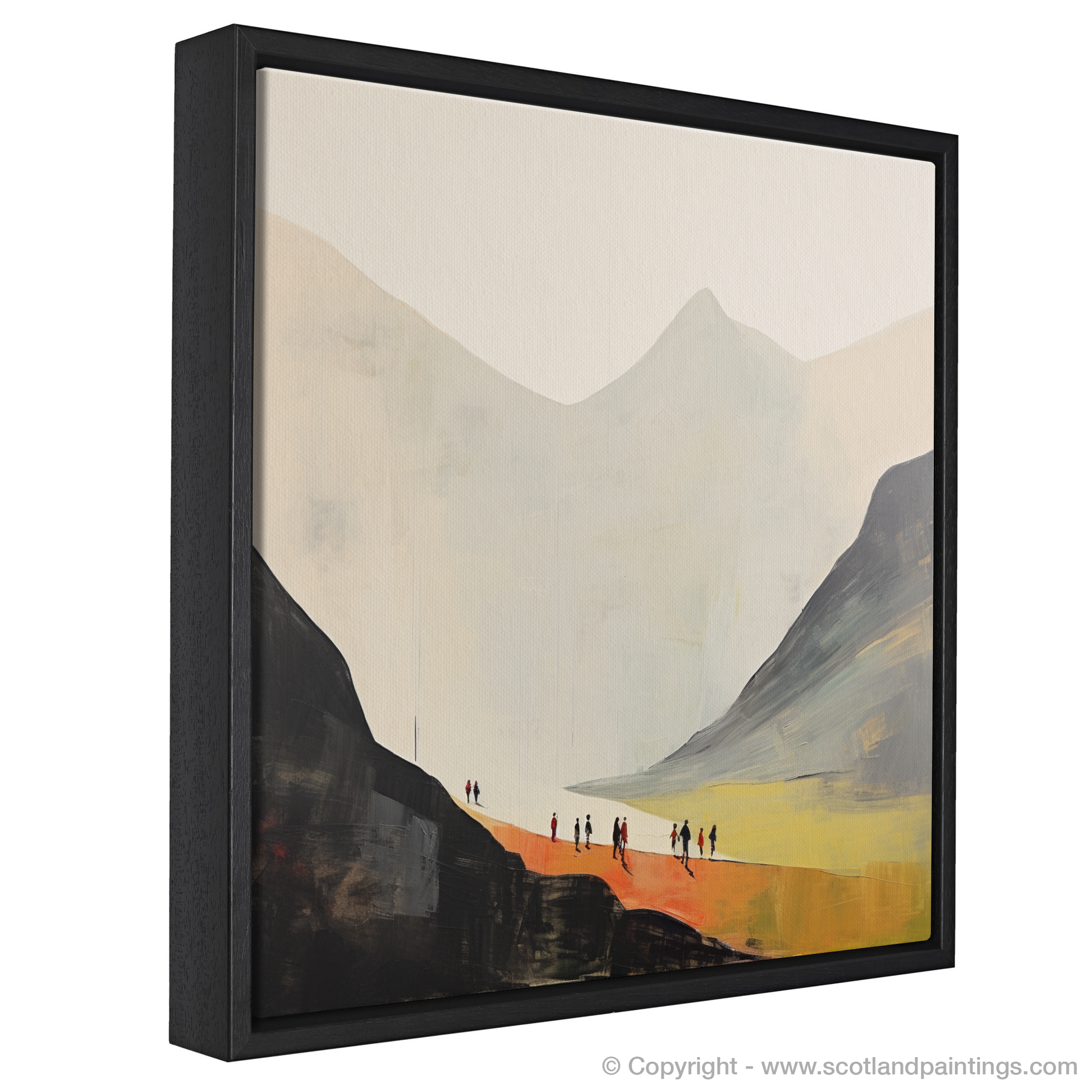Each figure in the group is rendered with just enough detail to convey their motion and purpose, yet their anonymity allows viewers to project their own narratives and dreams of exploration onto the canvas. The vast open spaces around them emphasise their journey's solitude and the silent dialogue between humankind and the great outdoors. This print, a part of the exclusive 'Glencoe' collection, offers a window into the sublime, an invitation to lose oneself in the vast beauty of the Scottish landscape through the lens of minimalism. It is an ode to the explorer within all of us, to the quiet awe we find in moments of outdoor solitude, and to the enduring call of the wild that echoes through the Glencoe valleys.