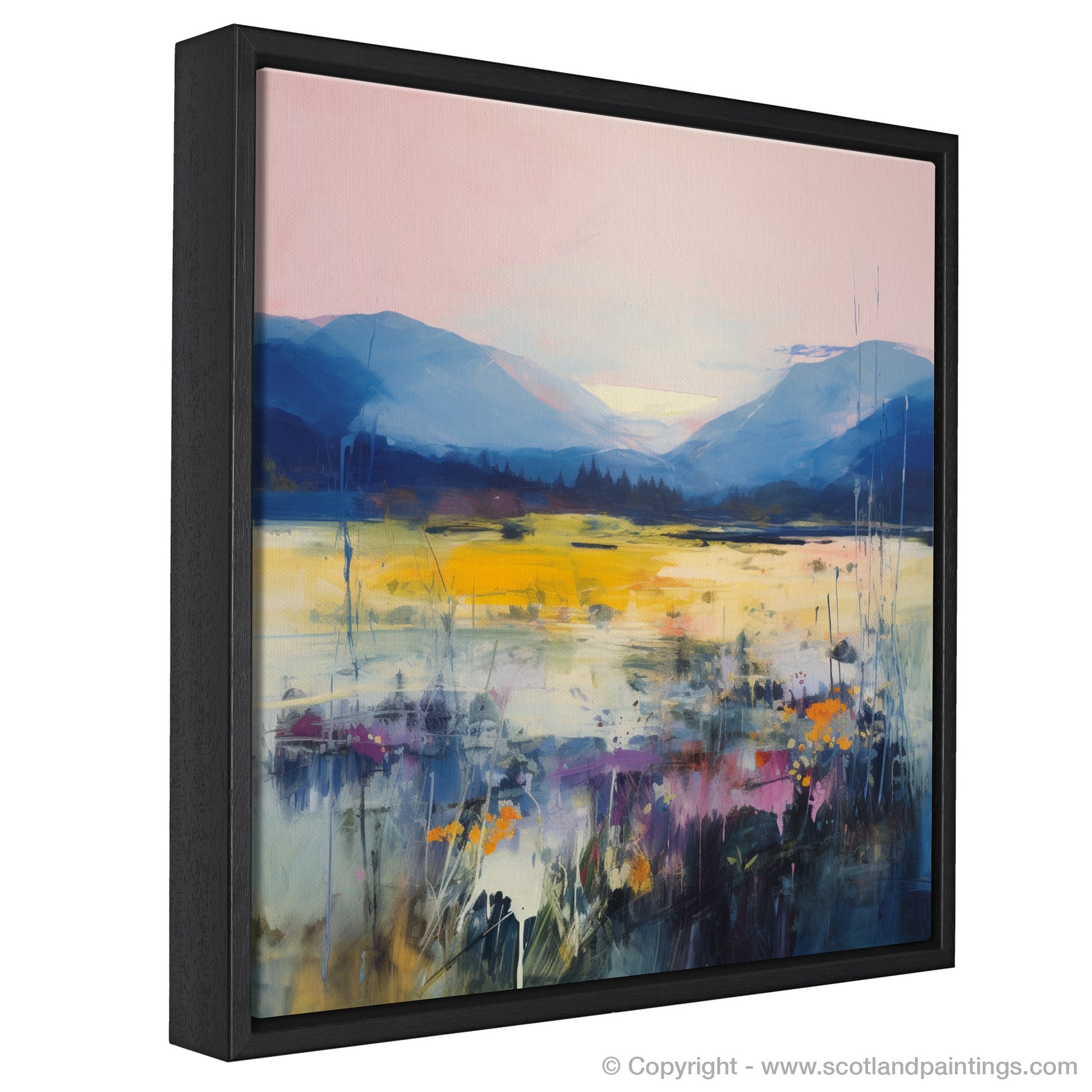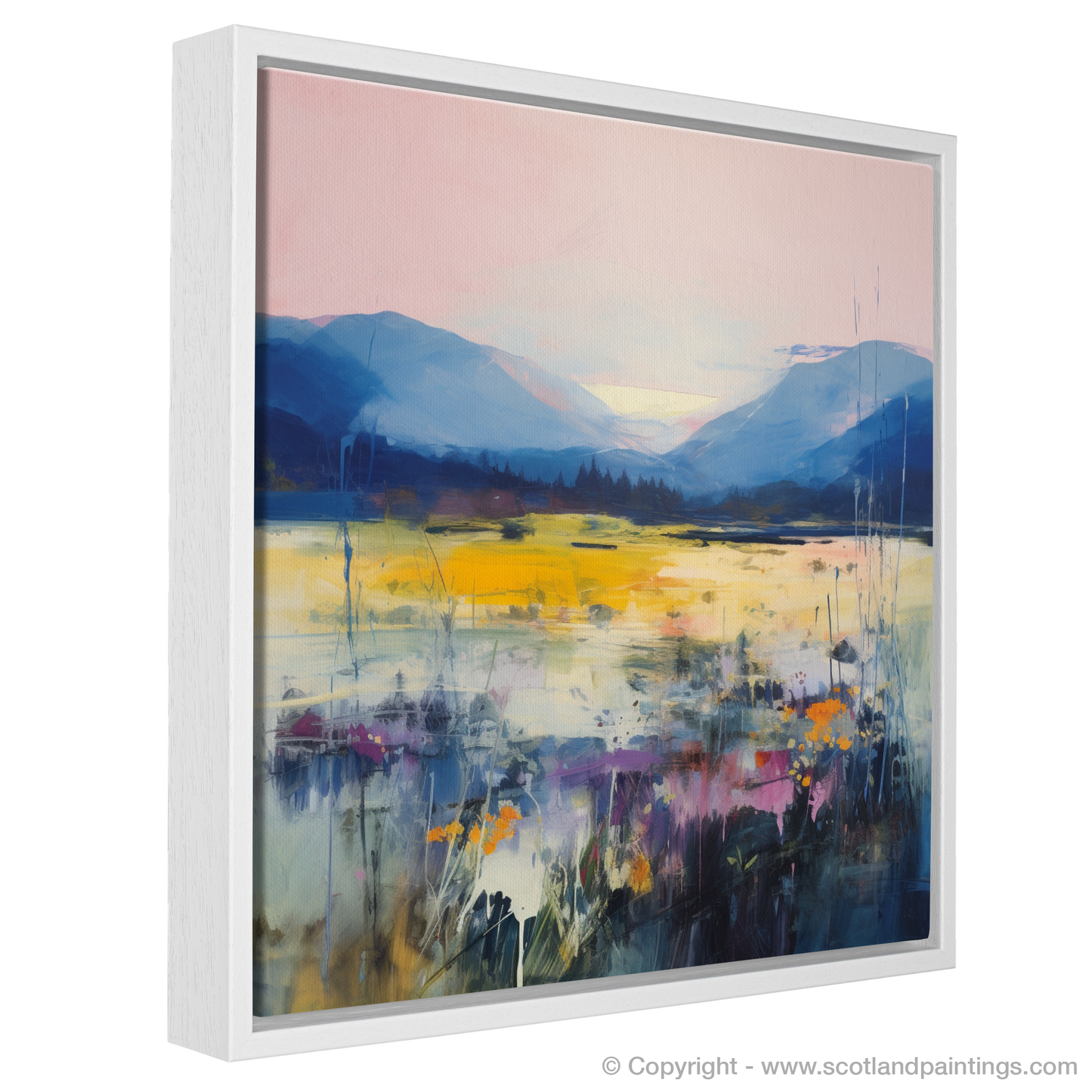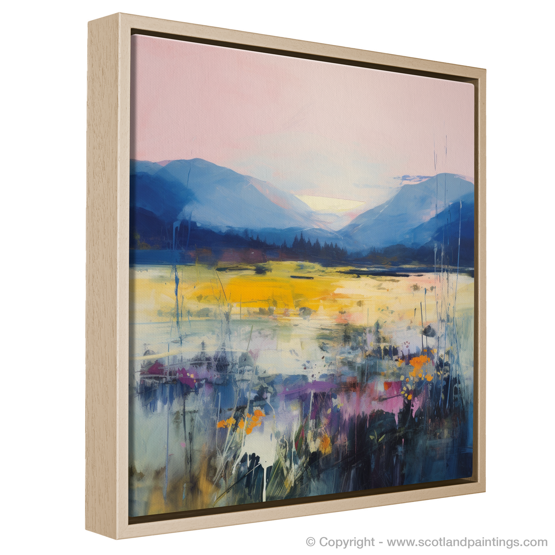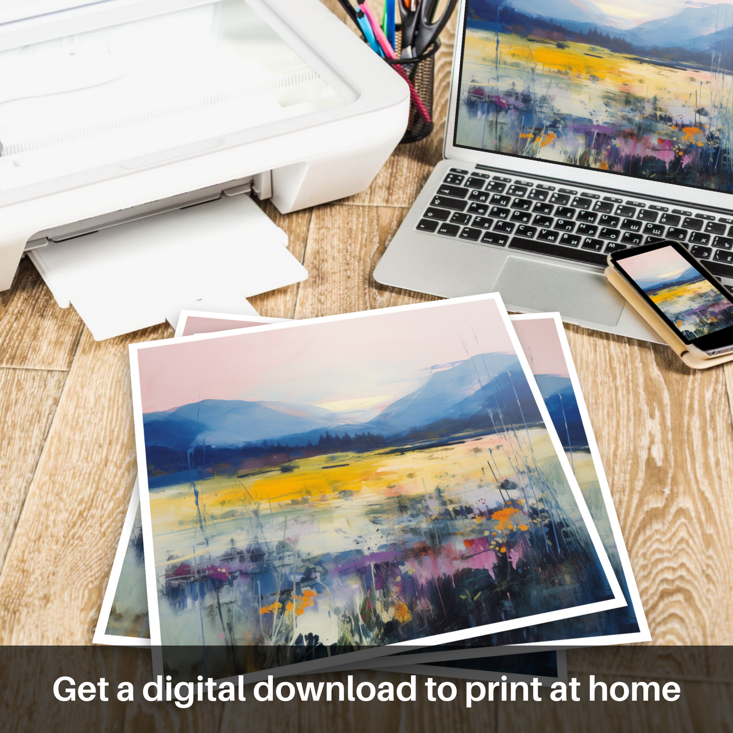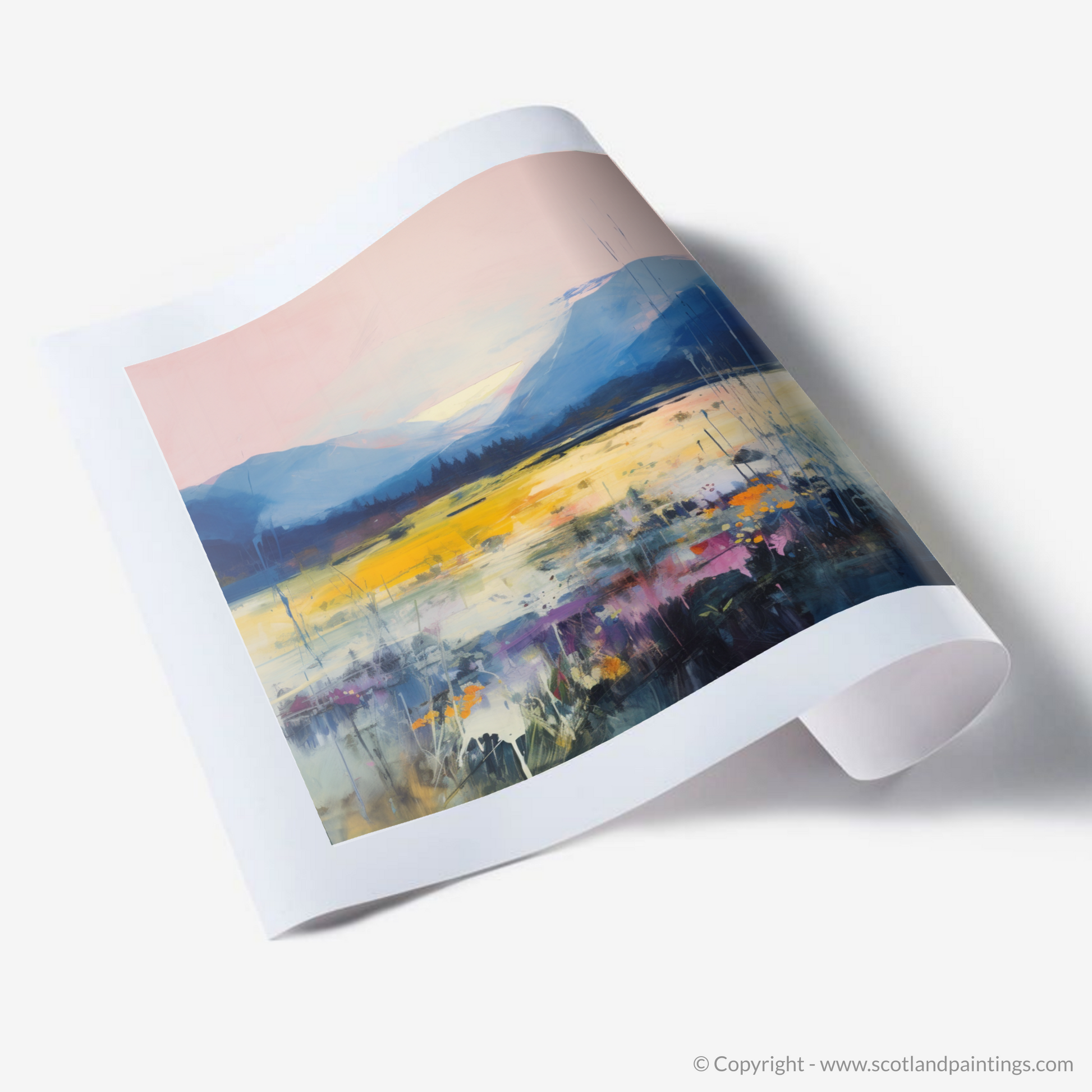 Immerse yourself in the abstract allure of this captivating print, a piece that distils the ethereal beauty of a Glencoe meadow at dawn. Swathes of vibrant yellows and soft pastels stretch across the canvas, evoking the first flush of morning light as it spills over the serene Scottish landscape. A gentle mist seems to rise off the scene, where distant mountains are silhouetted against a warming sky tinged with hints of delicate pink and soothing blue.