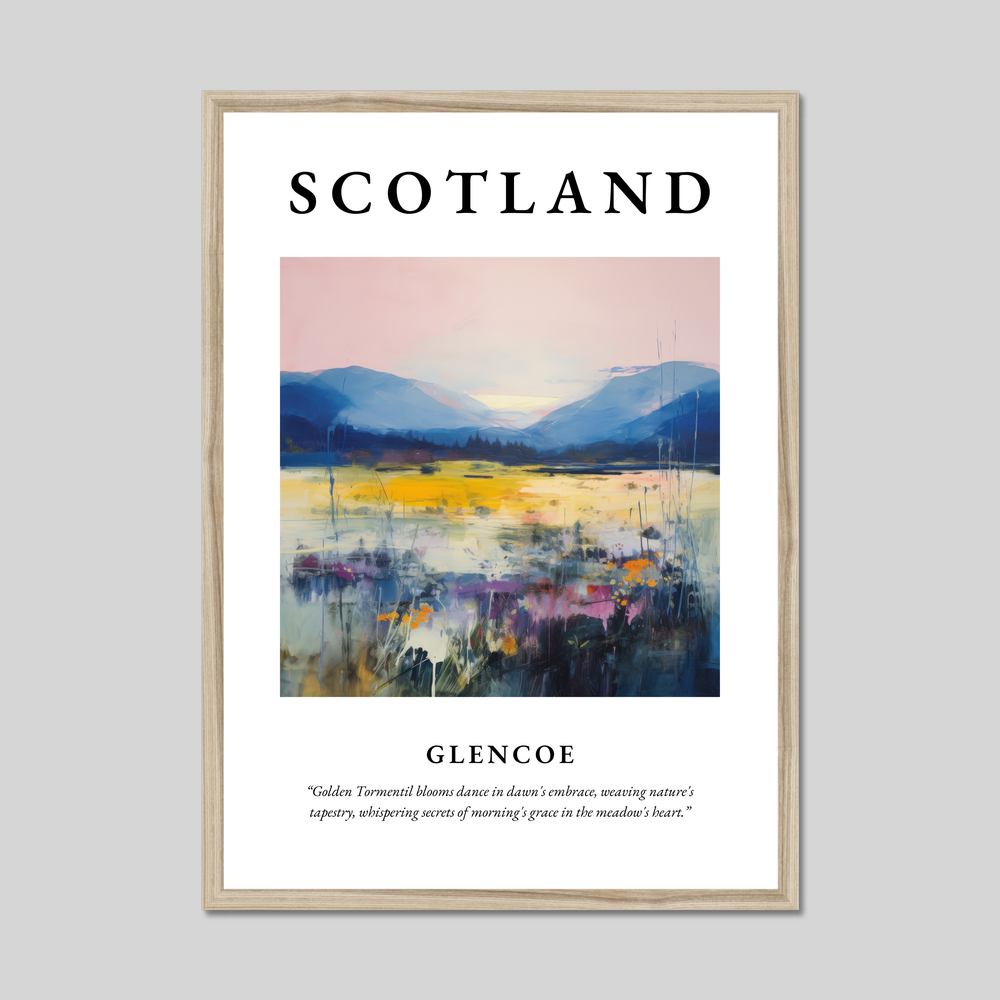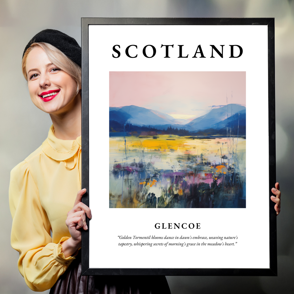 Nestled in the heart of the Scottish Highlands, Glencoe is a valley of breathtaking landscapes and poignant history. Its sweeping vistas and rugged peaks have inspired countless artists and adventurers. Steeped in legend, the area whispers tales of ancient clans and historic tales. The painting in this poster captures Glencoe's essence with a modern twist, reflecting its timeless beauty while evoking an atmosphere of mystery and grandeur.