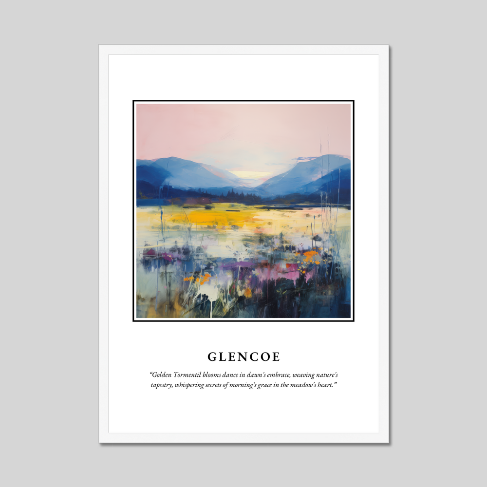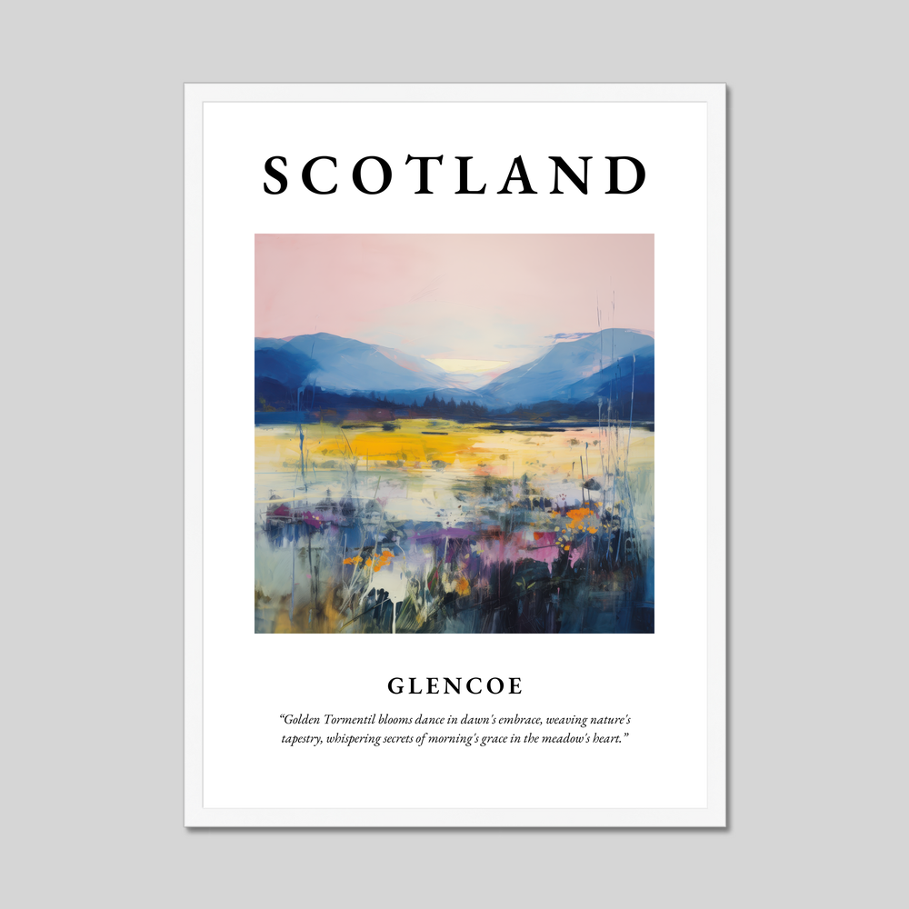 The centrepiece of this poster is an abstract painting of Glencoe, a tapestry of interwoven colours and forms. Imagine a brilliant dawn breaking over the iconic landscape, with blue-hued mountains standing in quiet majesty. In the foreground, golden hues of tormentil blooms dance across the canvas, whispering secrets of the morning into the heart of the meadow. The abstract style invites the viewer to immerse themselves in the emotion and energy of the scene, capturing both the imagination and the spirit.