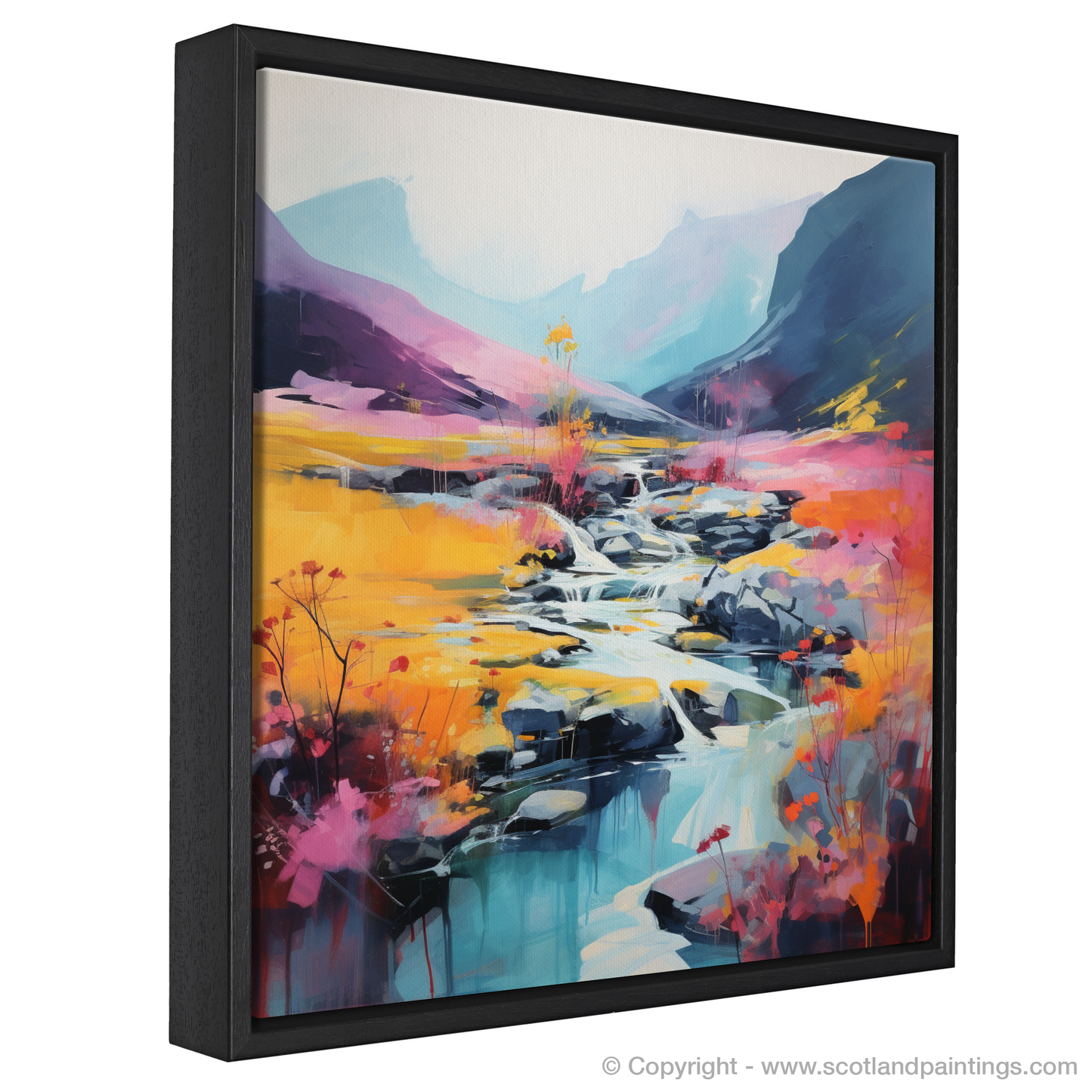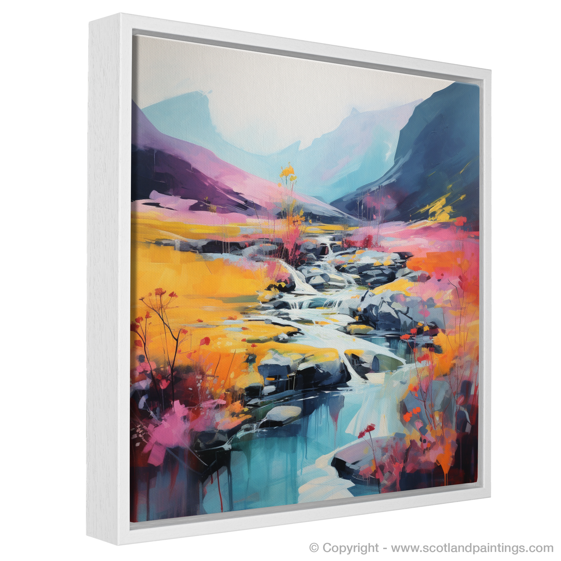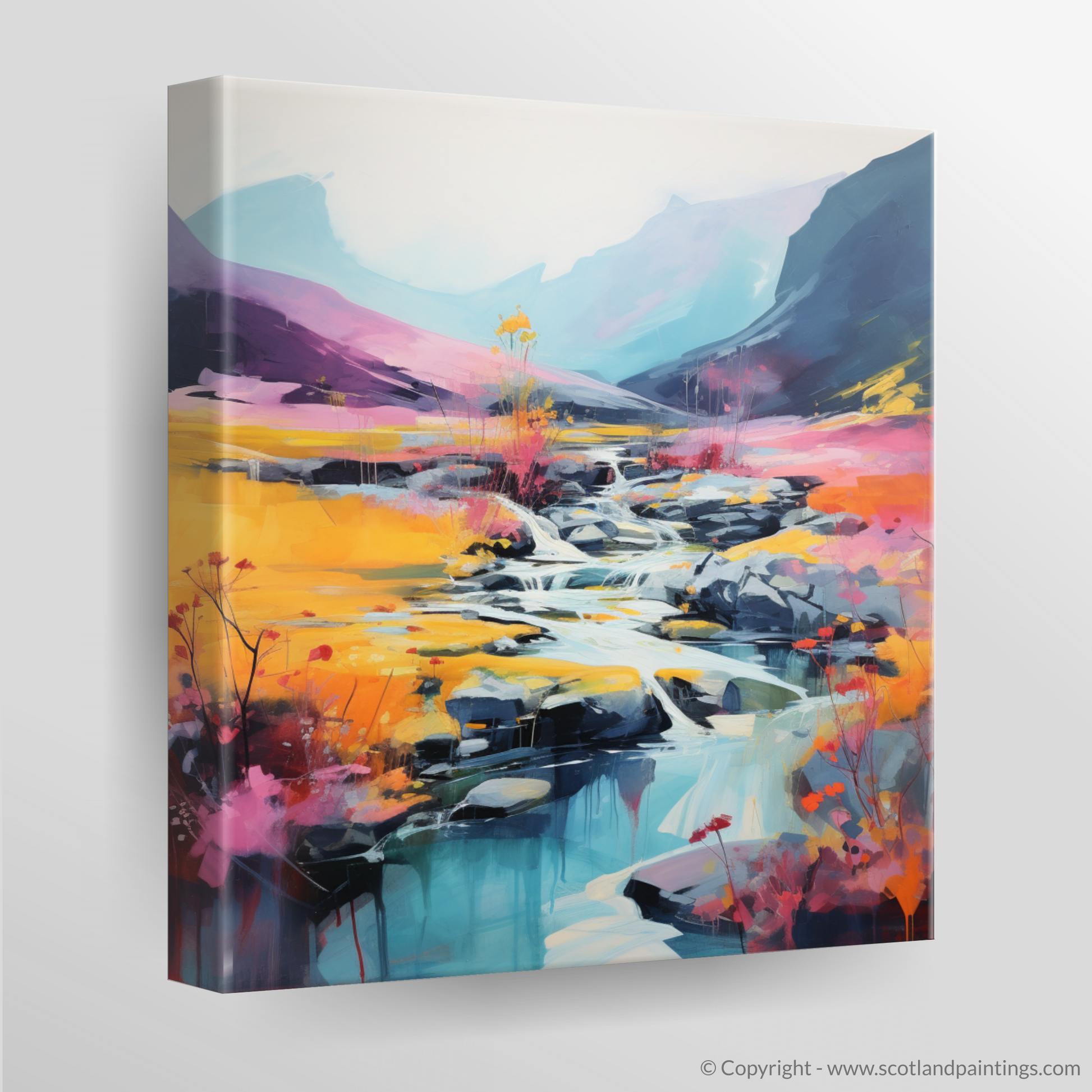 Immerse yourself in the vibrant hues and dynamic textures of the Scottish Highlands with this captivating abstract print. Inspired by the natural beauty of heather blooms by the River Coe in Glencoe, this piece invites the viewer into a dreamlike landscape where colour and form collide.