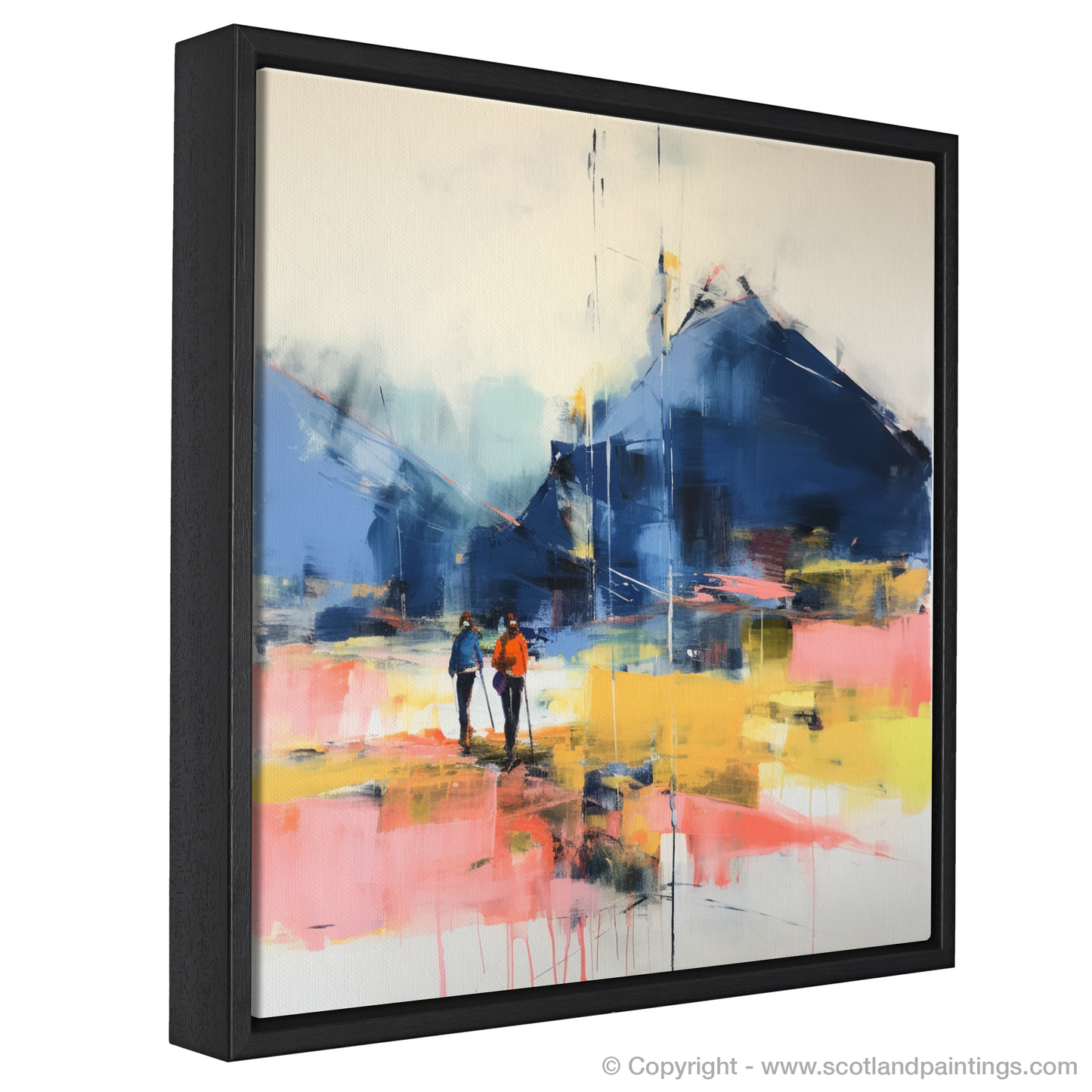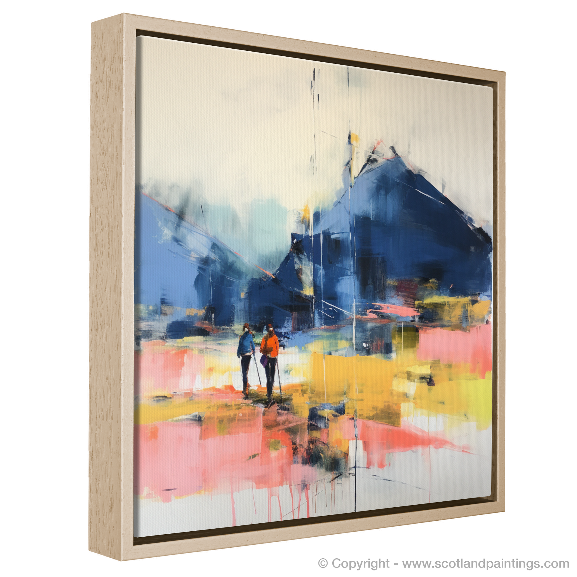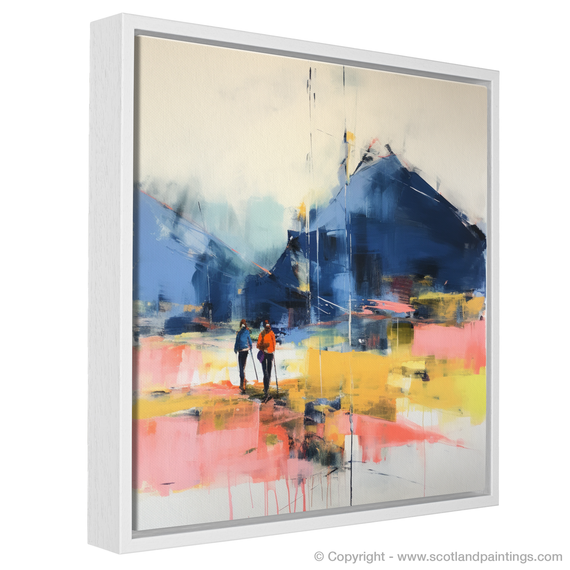Step into a world where the raw beauty of Glencoe is reimagined through an abstract lens. This evocative print captures the essence of adventure, depicting a duo of hikers poised on the cusp of discovery, against the backdrop of the magical Scottish highlands. The composition breathes life into the intangible quality of anticipation that fills the air at the start of an exhilarating trail.