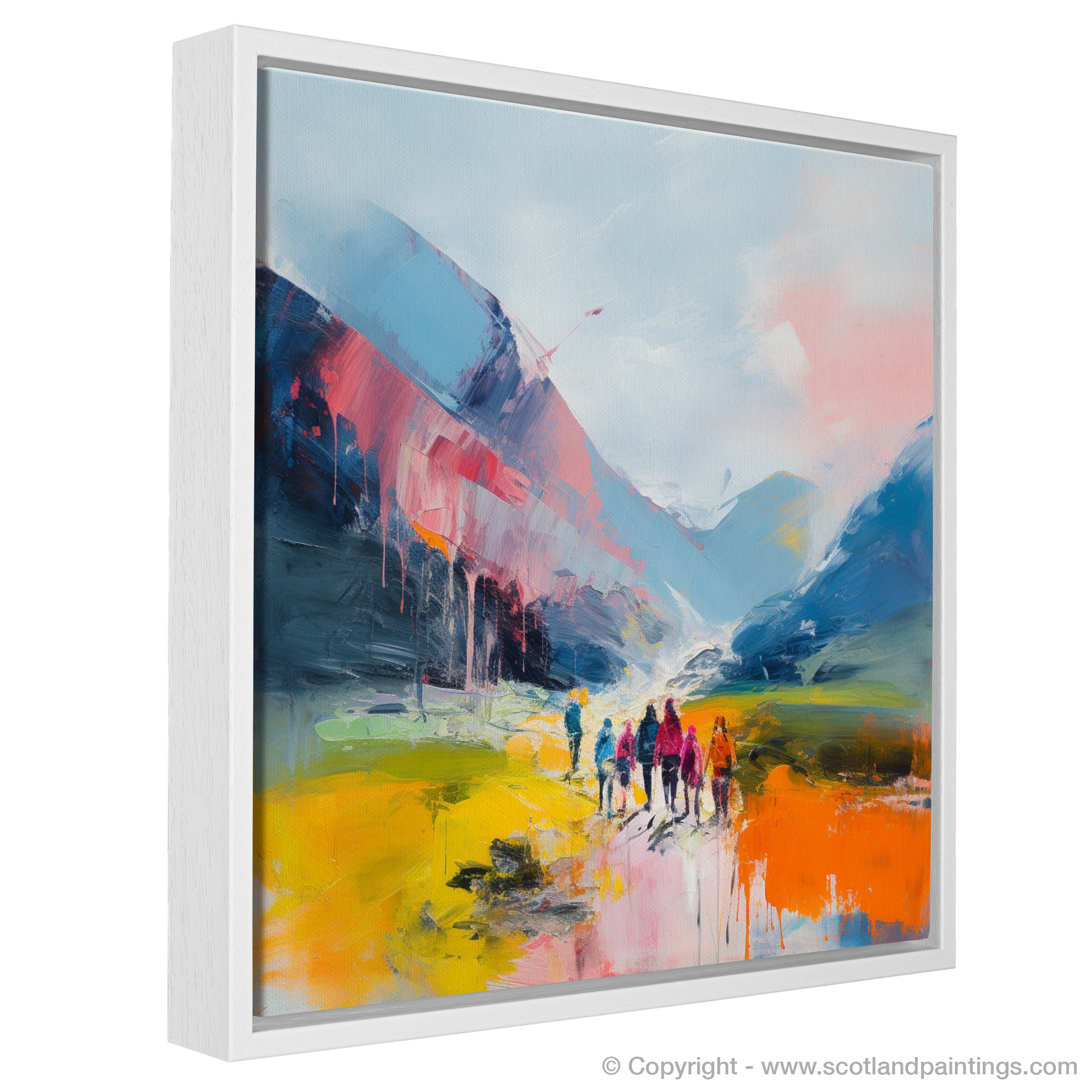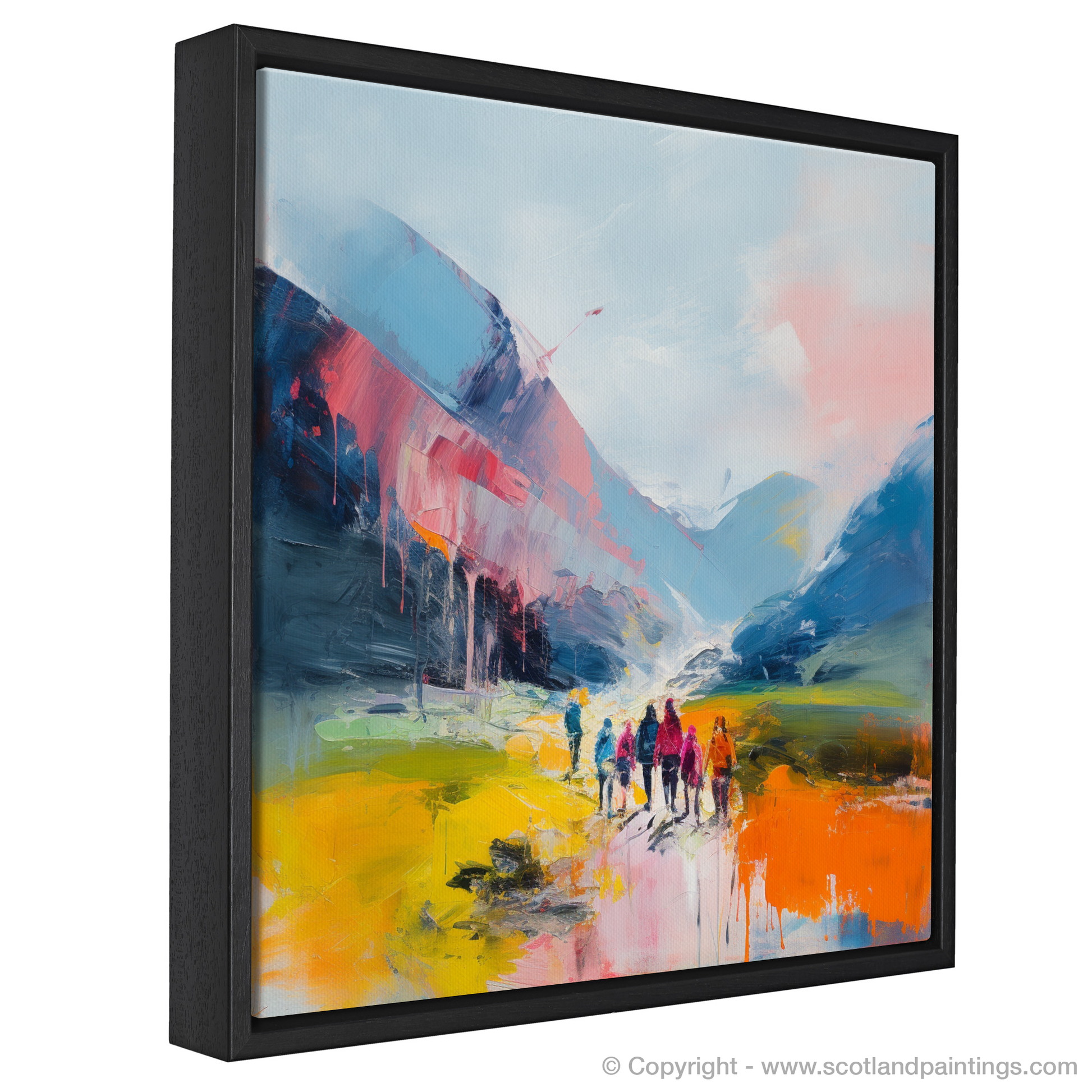 Immerse yourself in the vibrant essence of adventure with this abstract portrayal of hikers at the outset of their journey amidst the sweeping panorama of Glencoe. This composition drenches the senses with bold, impetuous strokes, invoking the wild spirit of the highlands. The canvas teems with a kaleidoscope of colours; fiery oranges and vivid yellows blaze against cooler tones of blues and purples, capturing the contrast between the earth's raw beauty and the human spirit's warmth.