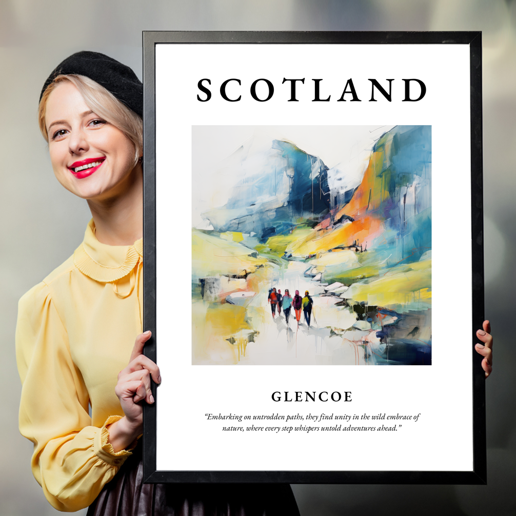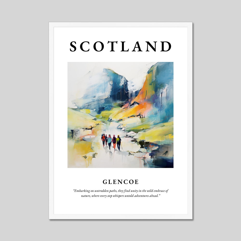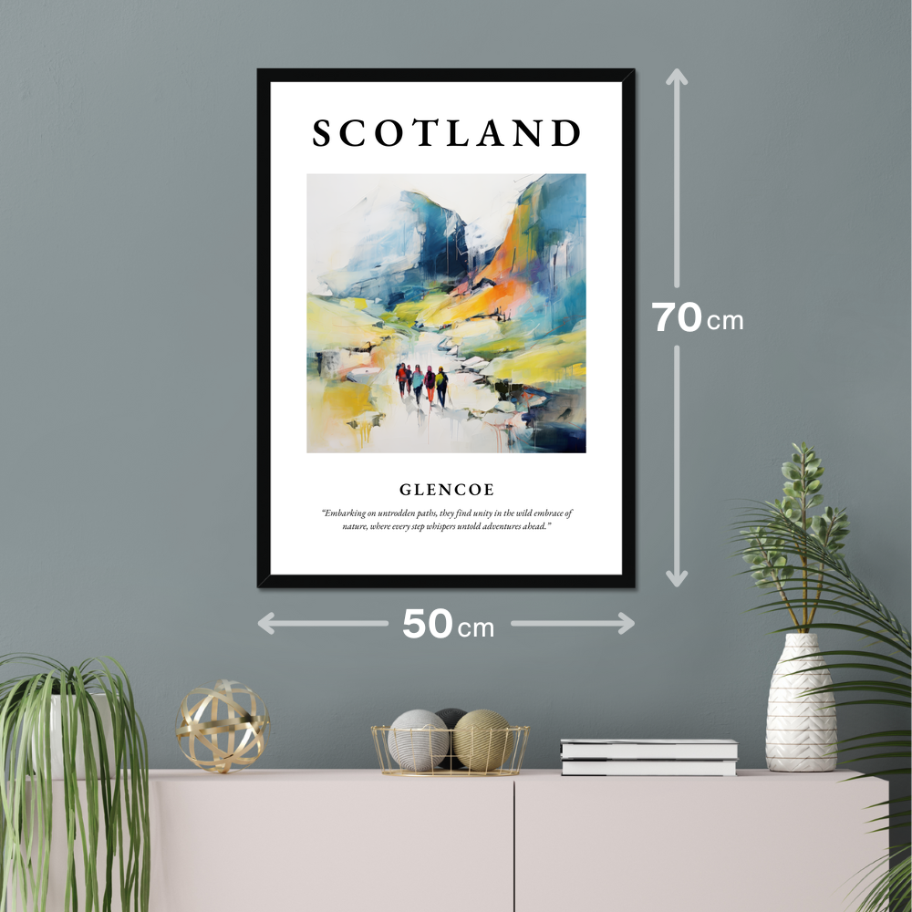 Introduce a touch of the Scottish Highlands into your home with our stunning framed poster print from the “Glencoe” collection. Measuring a generous 50cm x 70cm, this striking piece features the captivating landscape of Glencoe, brought to life in a vibrant abstract style. The word “SCOTLAND” in bold lettering anchors the top of the poster, perfectly framing the swirling colours of the artwork below. Beneath the painting, a thought-provoking quote reads: “Embarking on untrodden paths, they find unity in the wild embrace of nature, where every step whispers untold adventures ahead.”