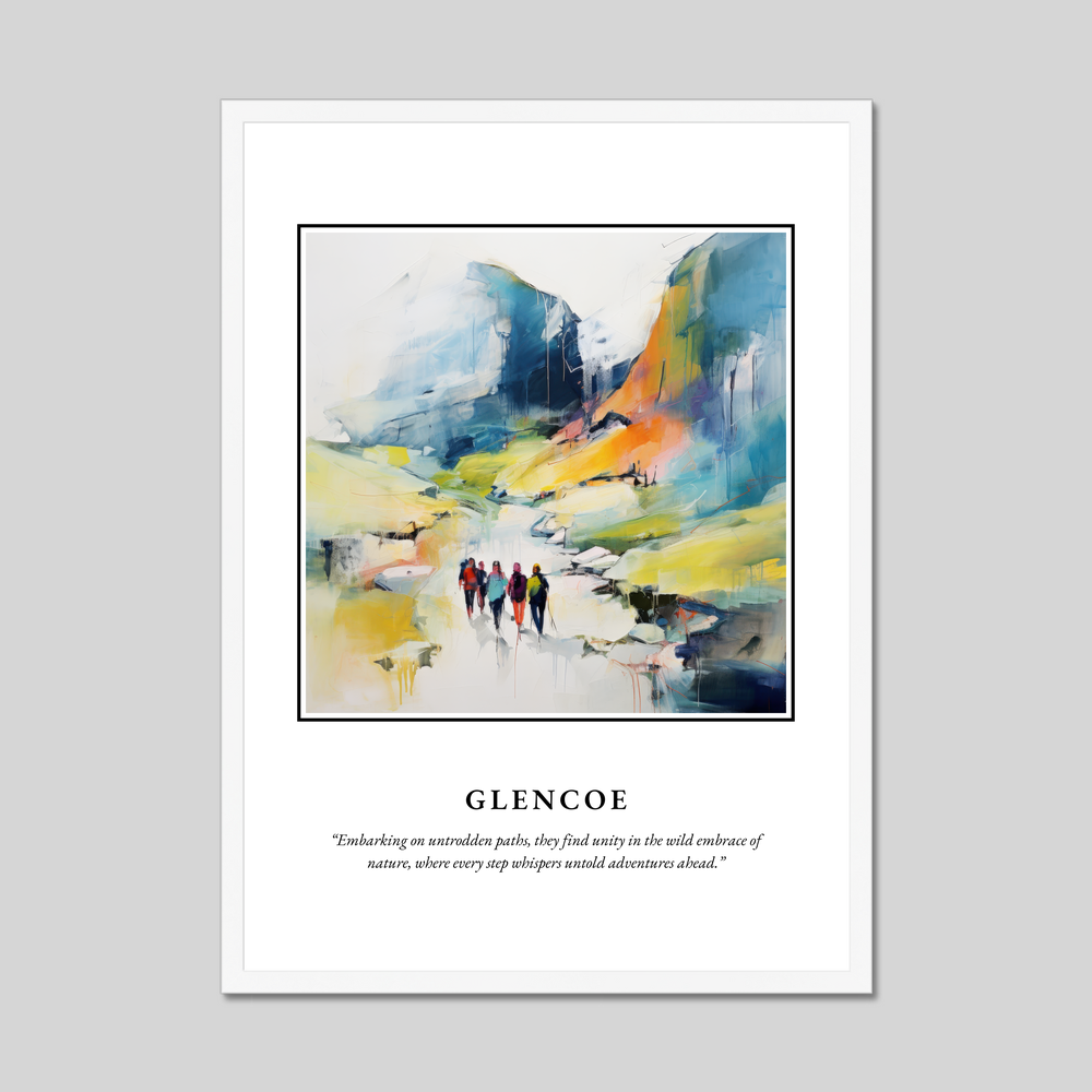 Glencoe, a majestic valley in the heart of Scotland, is renowned for its dramatic scenery and historical significance. Its sweeping landscapes and towering peaks have long enchanted visitors, offering a sense of awe and adventure that this artwork seeks to capture. The vibrant depiction of hikers set against a backdrop of mountains and sky invites you to lose yourself in memories of those adventurous paths and share in the unity that such journeys inspire.