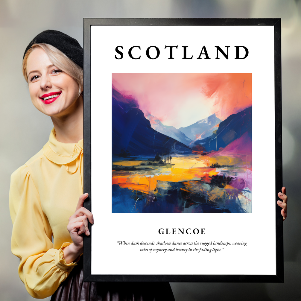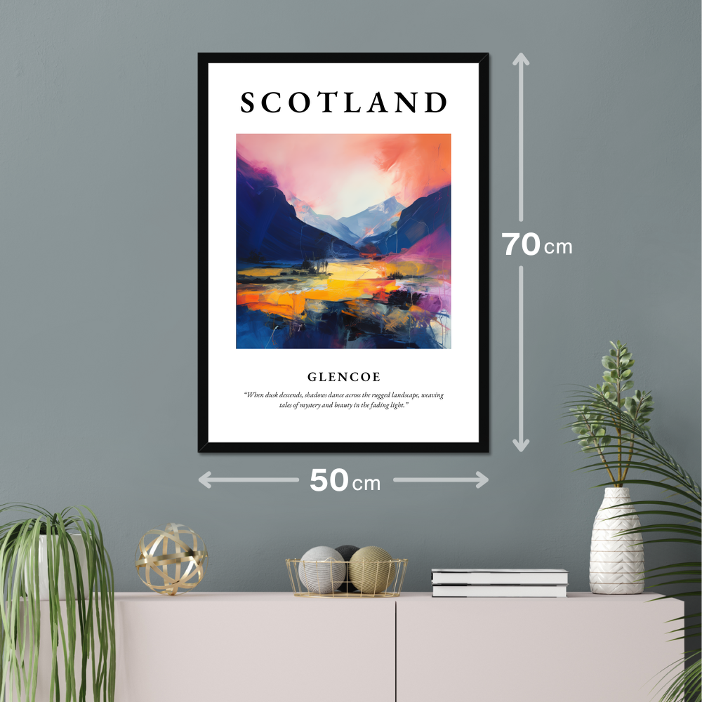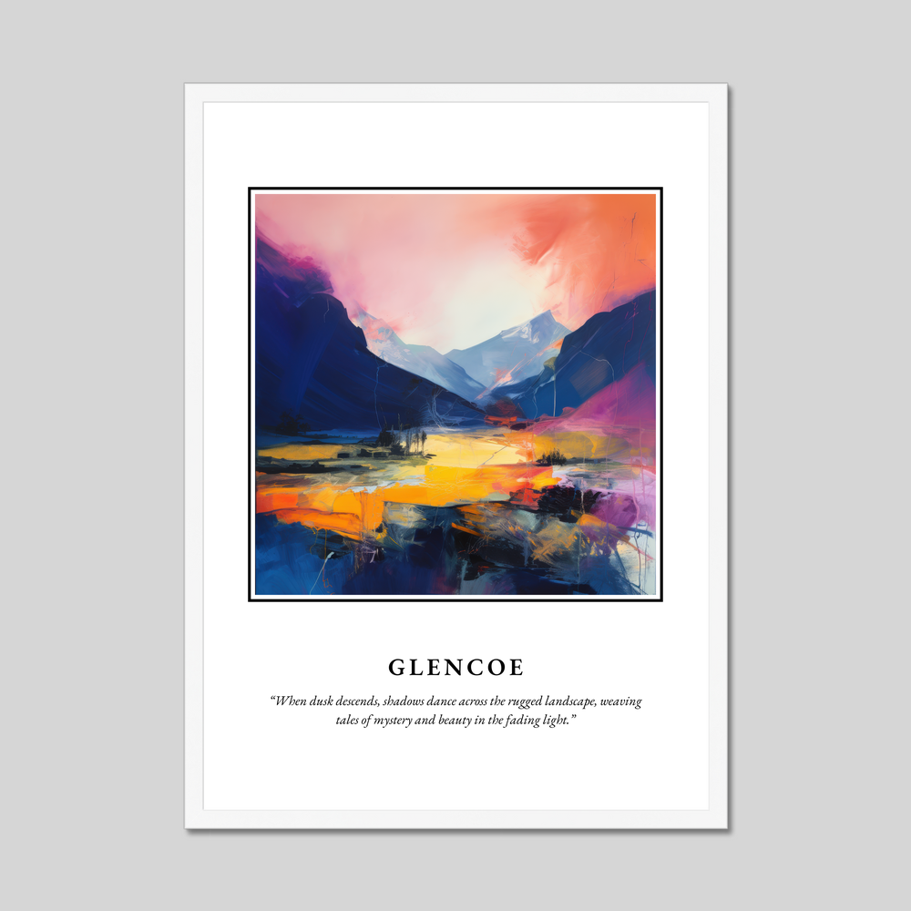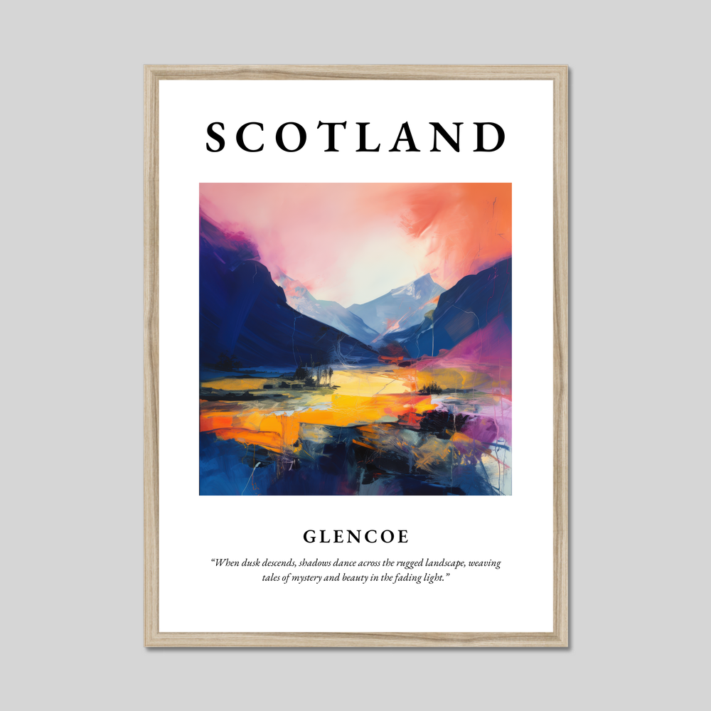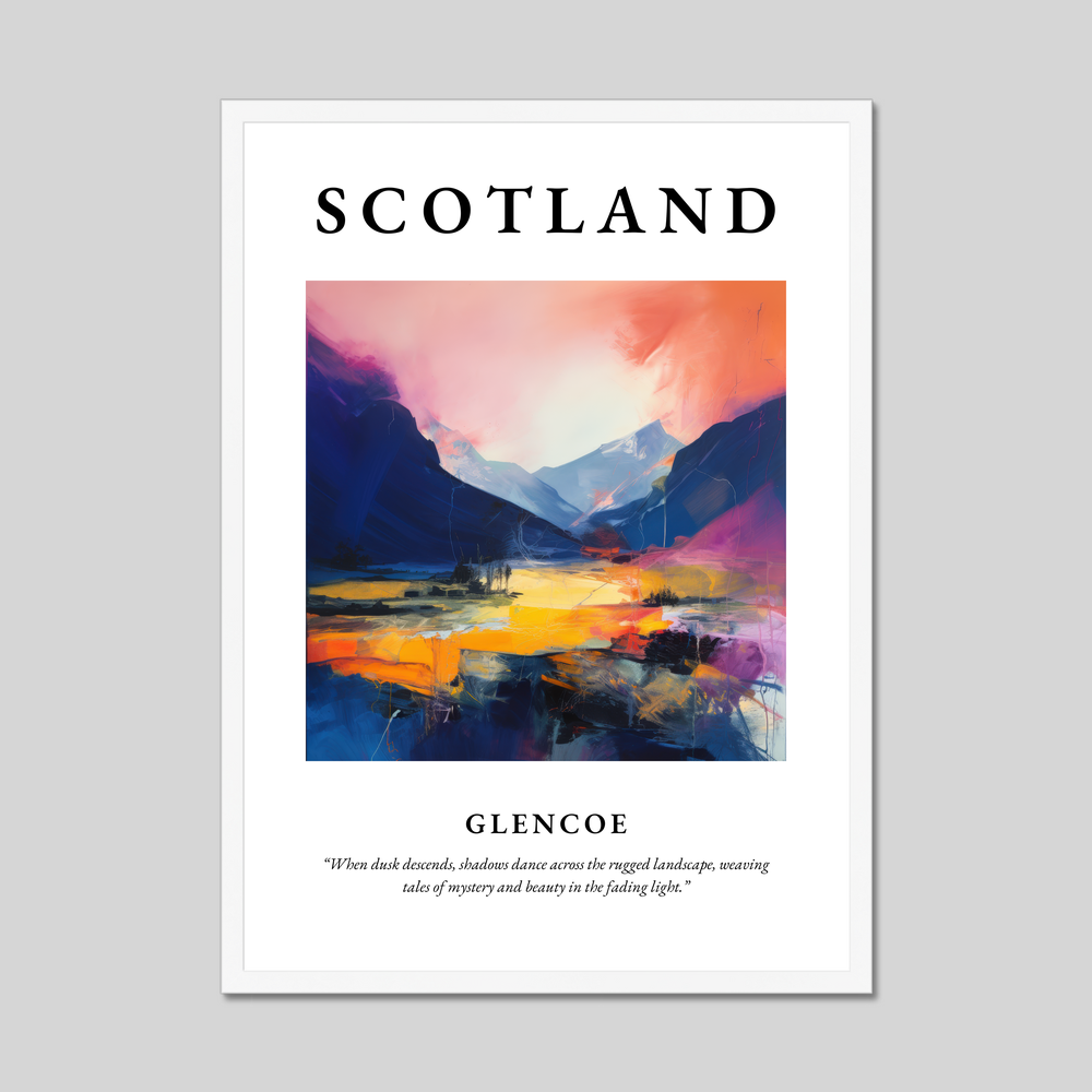 Available in elegant black, sleek white, or natural wood-effect frames, this poster is a versatile addition to both contemporary and traditional interiors. At the top, the bold word "SCOTLAND" sets the stage, leading your eye to a mesmerizing abstract painting of Glencoe. Below, the evocative quote, “When dusk descends, shadows dance across the rugged landscape, weaving tales of mystery and beauty in the fading light,” captures the enchanting essence of the scene.