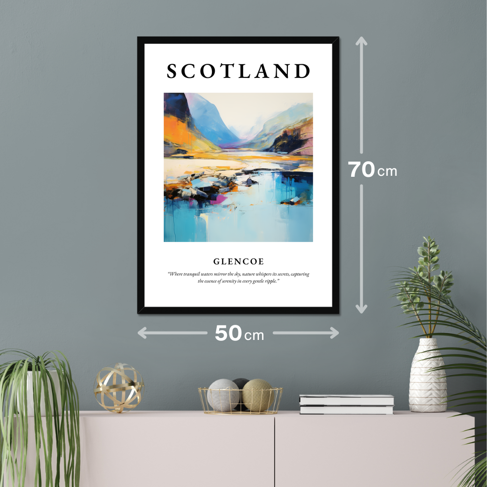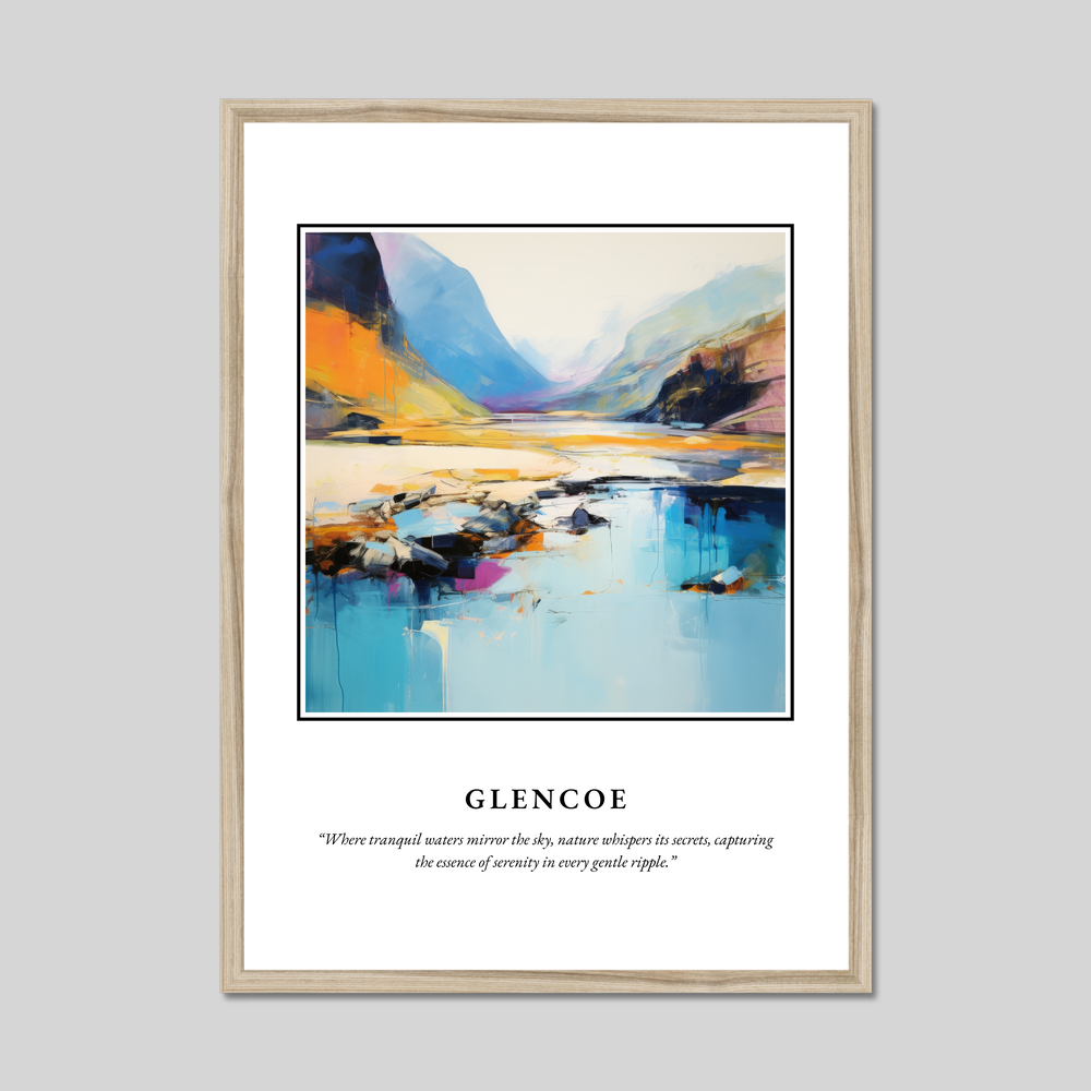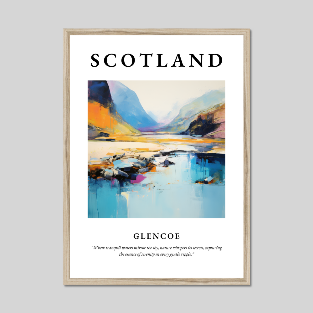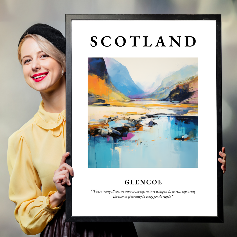 The bold presence of "SCOTLAND" crowns the poster, drawing attention to the stunning abstract portrayal of Glencoe beneath. The painting captures the essence of this iconic landscape in splashes of vivid colours and dynamic forms, creating a perfect balance between imagination and reality. Below the painting, the quote “Where tranquil waters mirror the sky, nature whispers its secrets, capturing the essence of serenity in every gentle ripple” encapsulates the harmonious mood of the scene.
