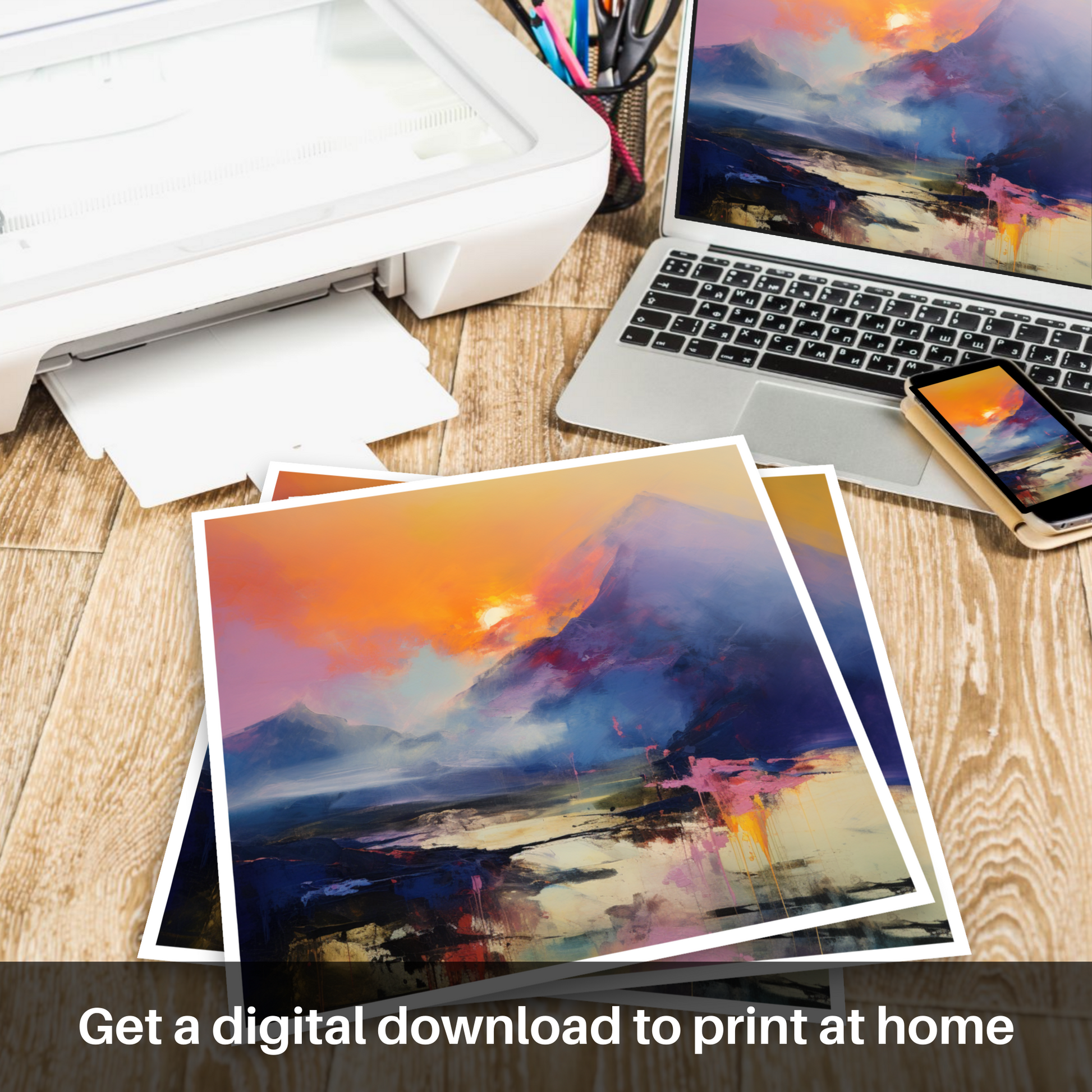 Capture the ephemeral beauty of nature through an abstract lens with this mesmerizing print inspired by the fiery sky over the peaks of Glencoe. Swirls of vivid orange, crimson, and yellow mingle with dusky purples and blues to create a dynamic portrayal of the heavens ablaze with colour as the sun dips beyond the rugged horizon.