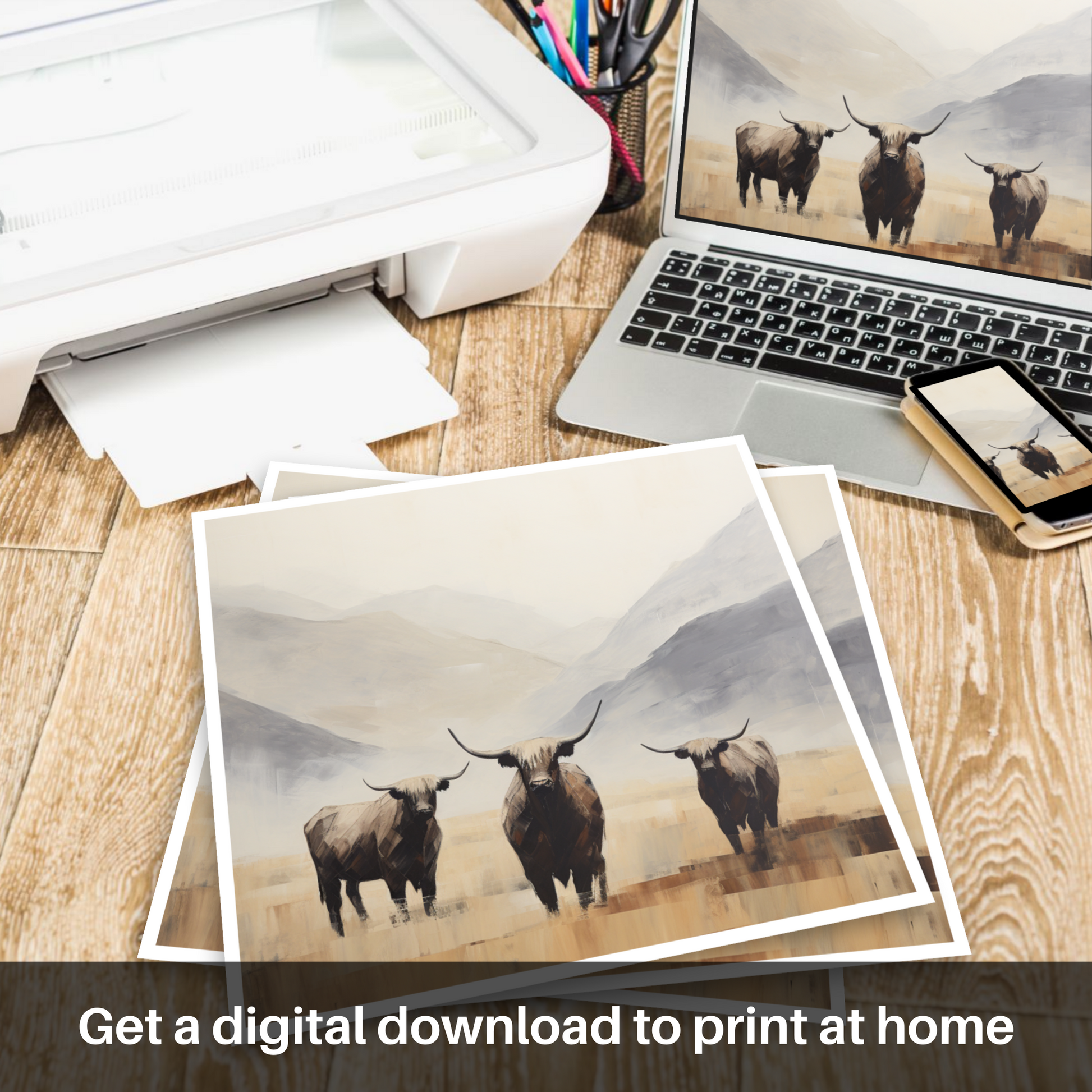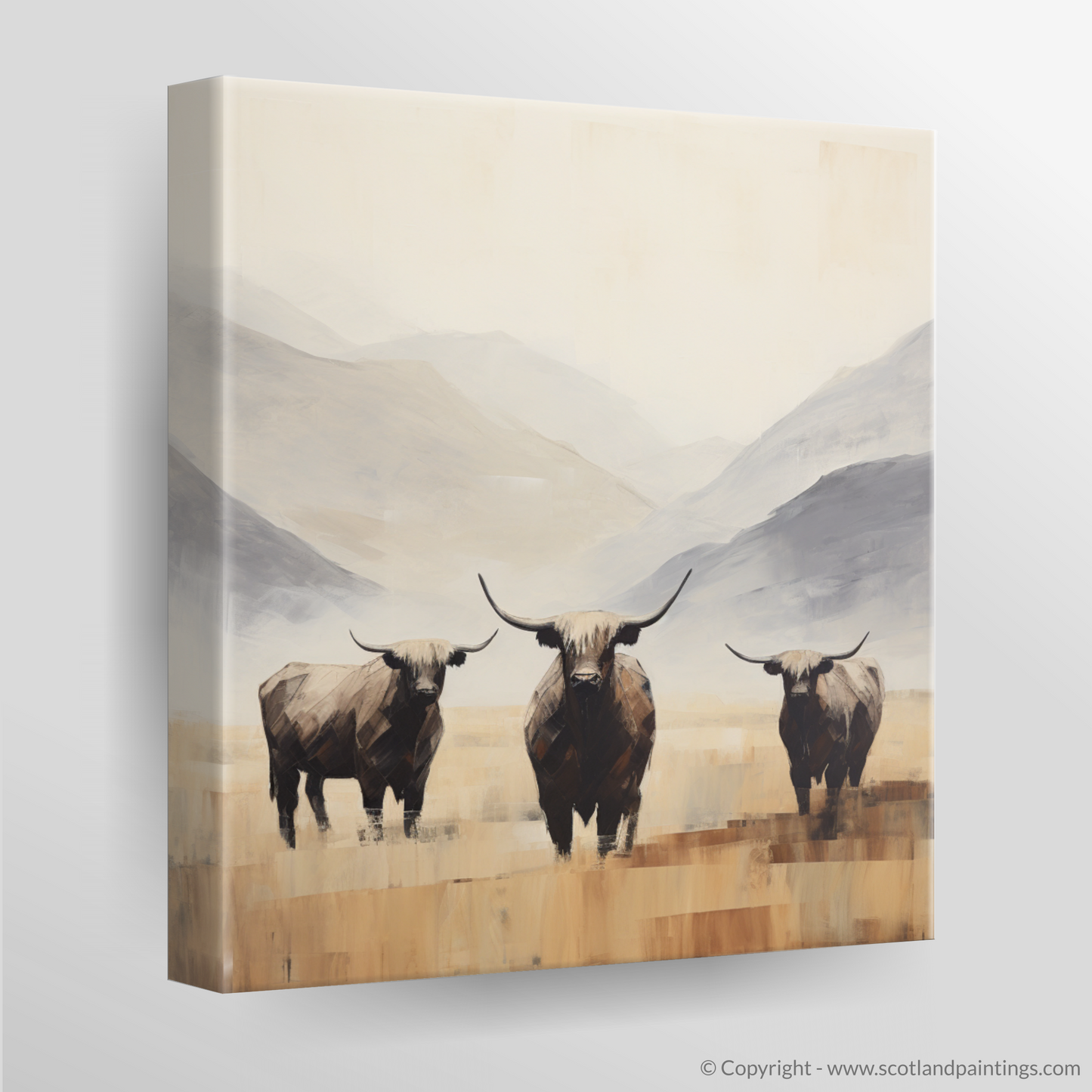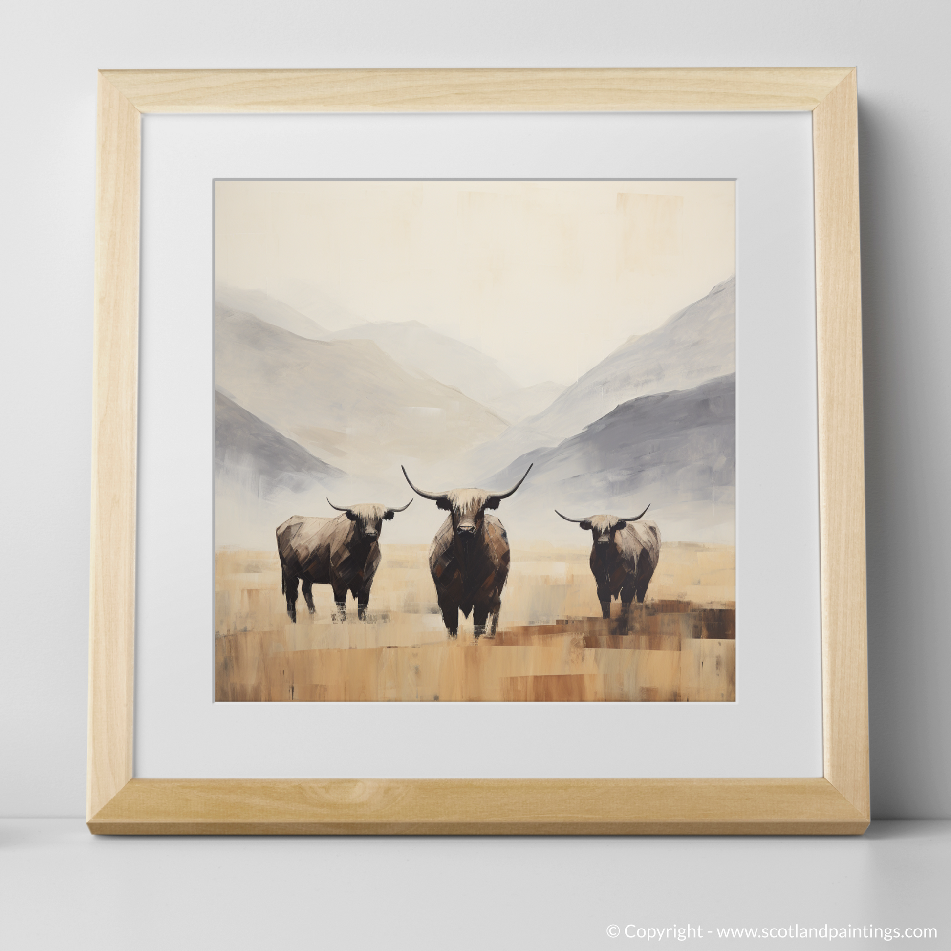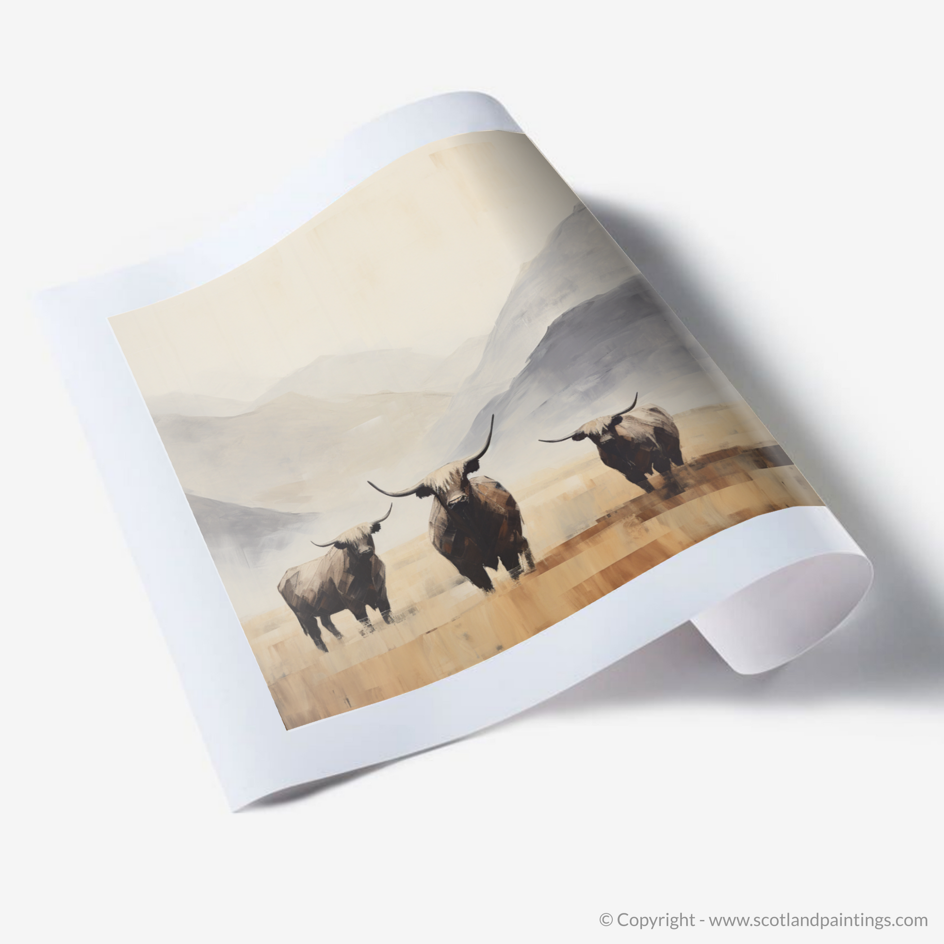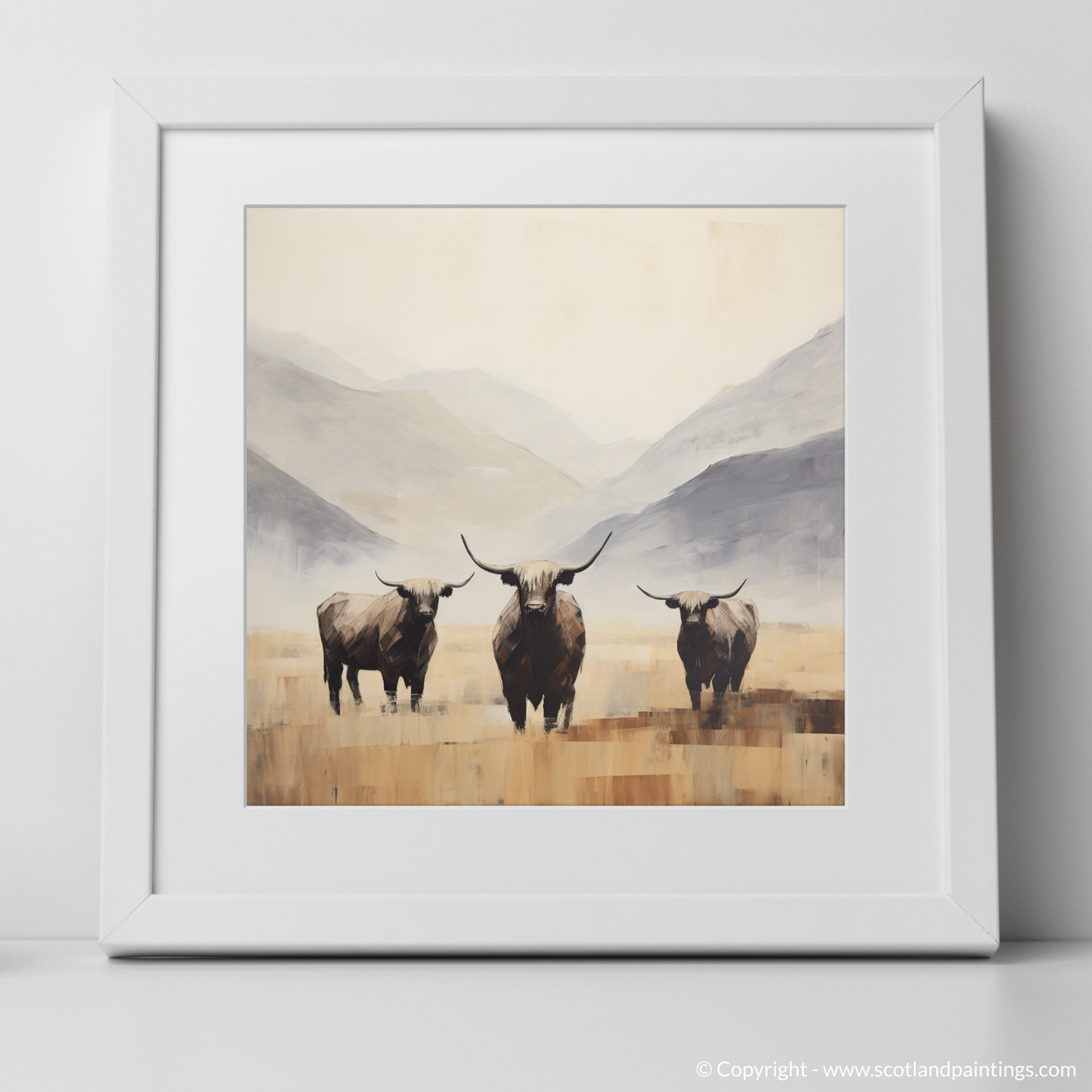 Capturing the serene majesty of Glencoe, this minimalist-inspired print portrays a trio of iconic Highland cows standing resolutely against a backdrop of rolling Scottish hills. The expert use of neutral and earthy tones, combined with a refined, pared-back aesthetic, channels the tranquil beauty and enduring spirit of these majestic creatures.