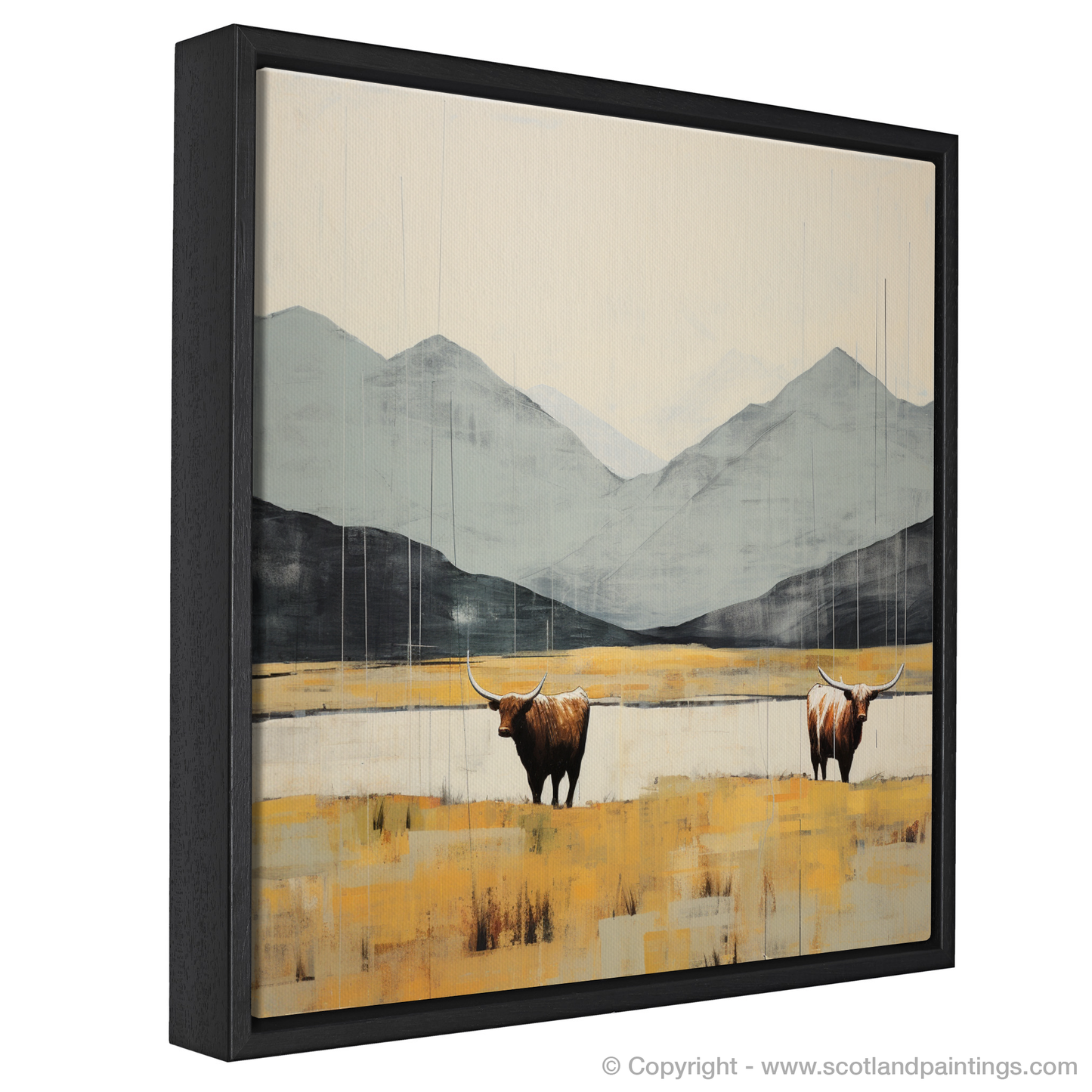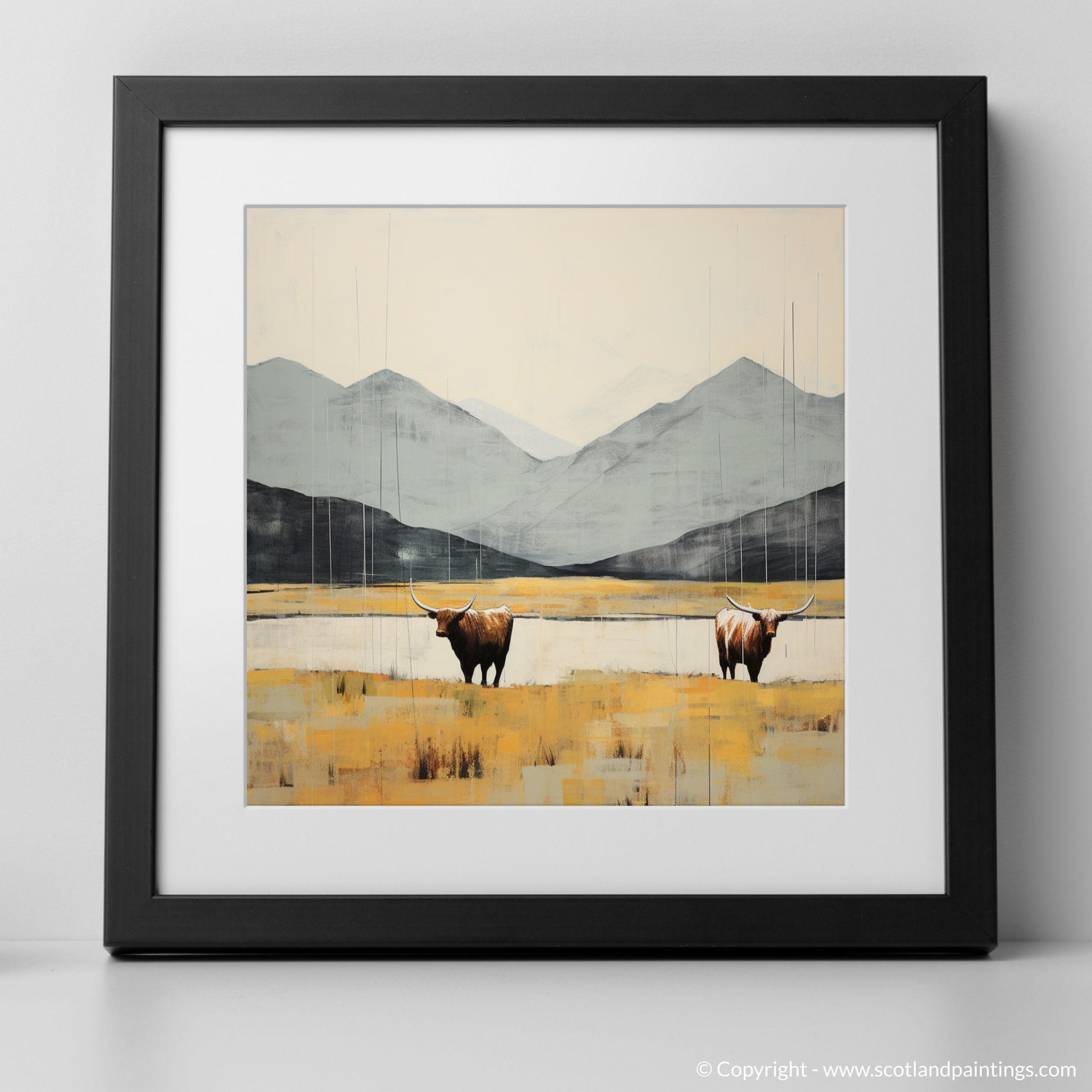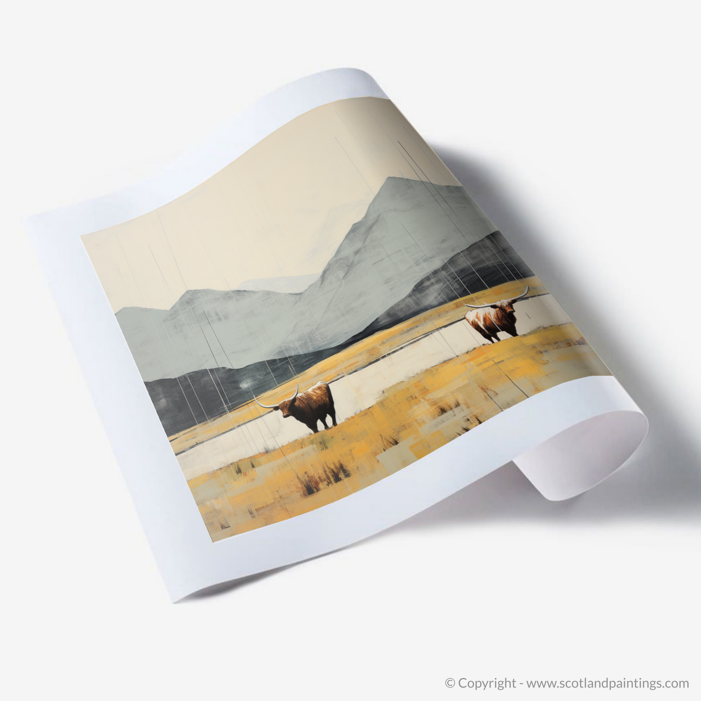 Immerse yourself in the serene beauty of the Scottish Highlands with this evocative print, portraying the iconic Highland cows against the breathtaking backdrop of Glencoe's rugged landscape. The artwork, steeped in minimalism, captures the essence of tranquillity and the timeless spirit of nature with a palette that is both earthy and subdued, creating a harmonious composition that speaks of simplicity and elegance.