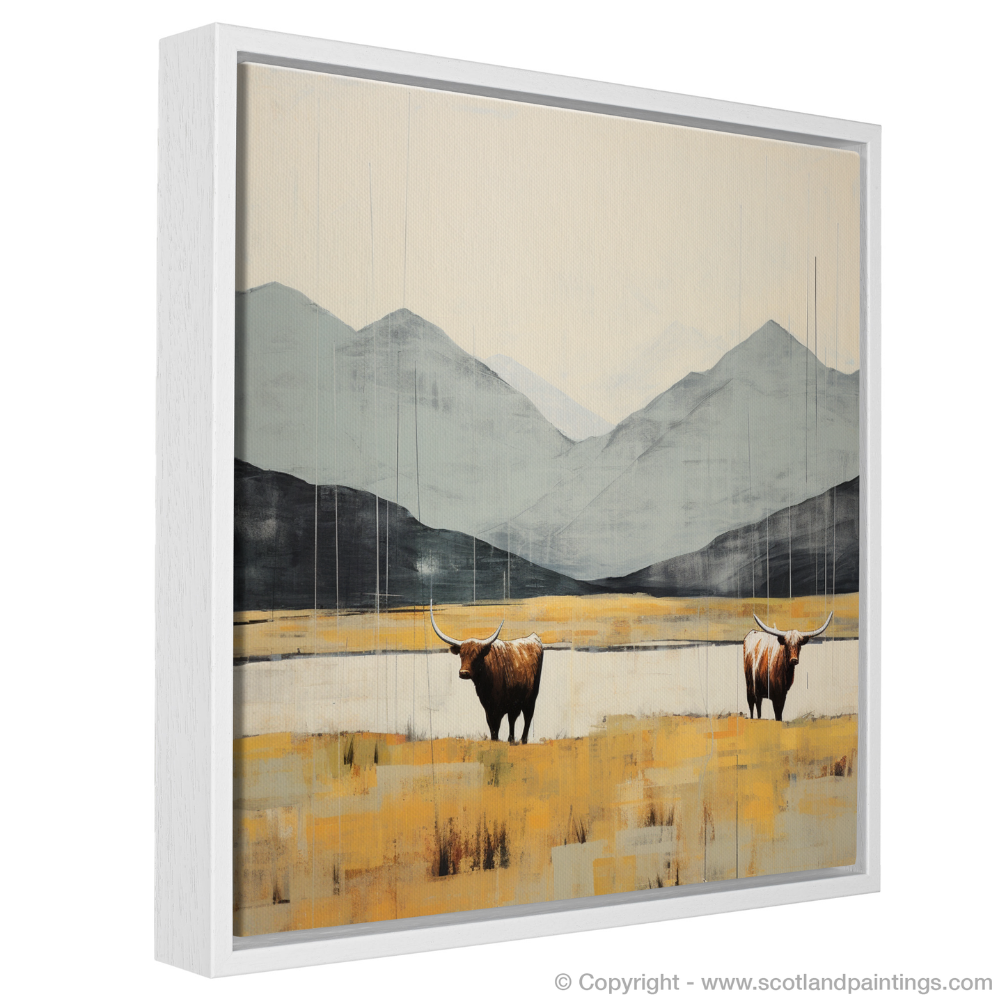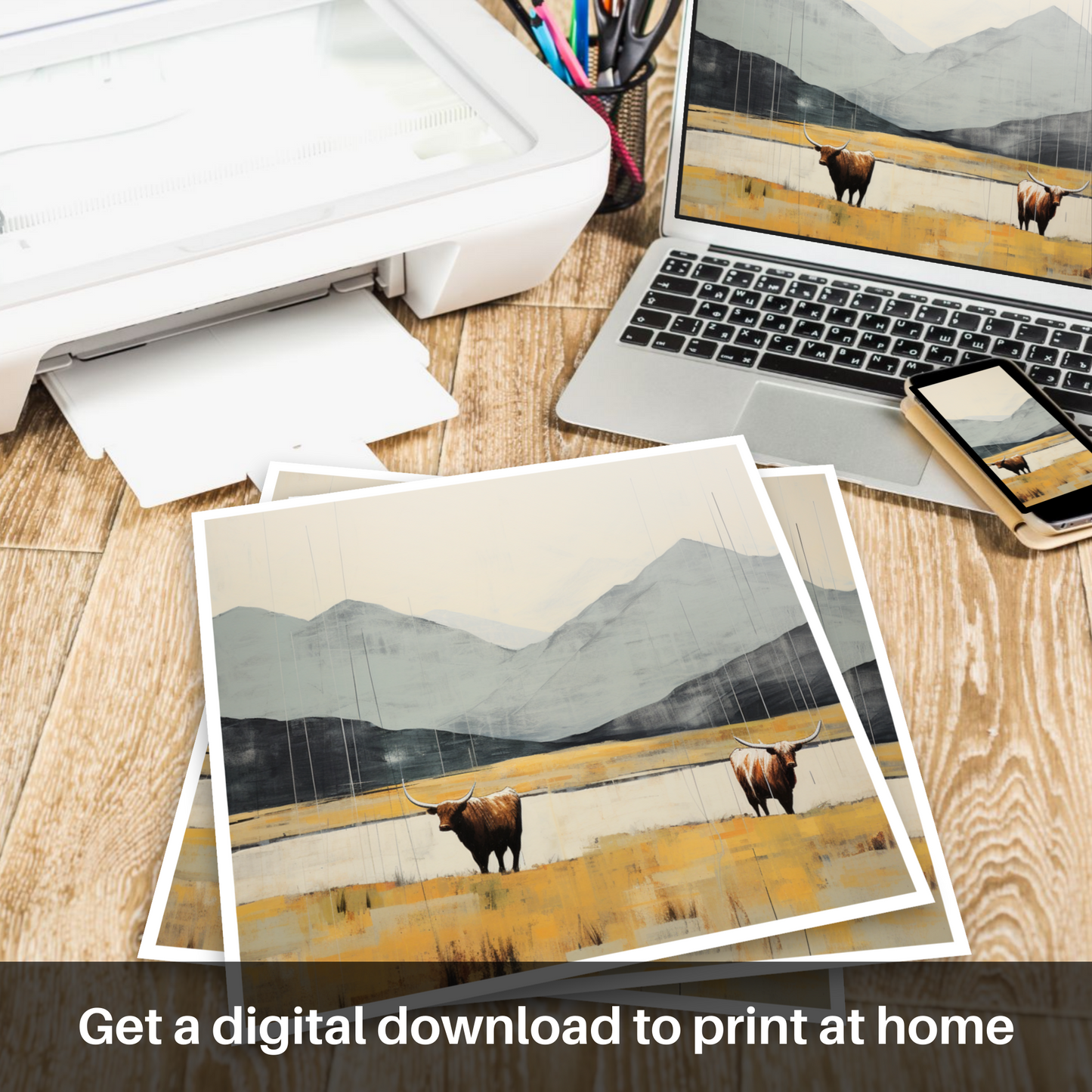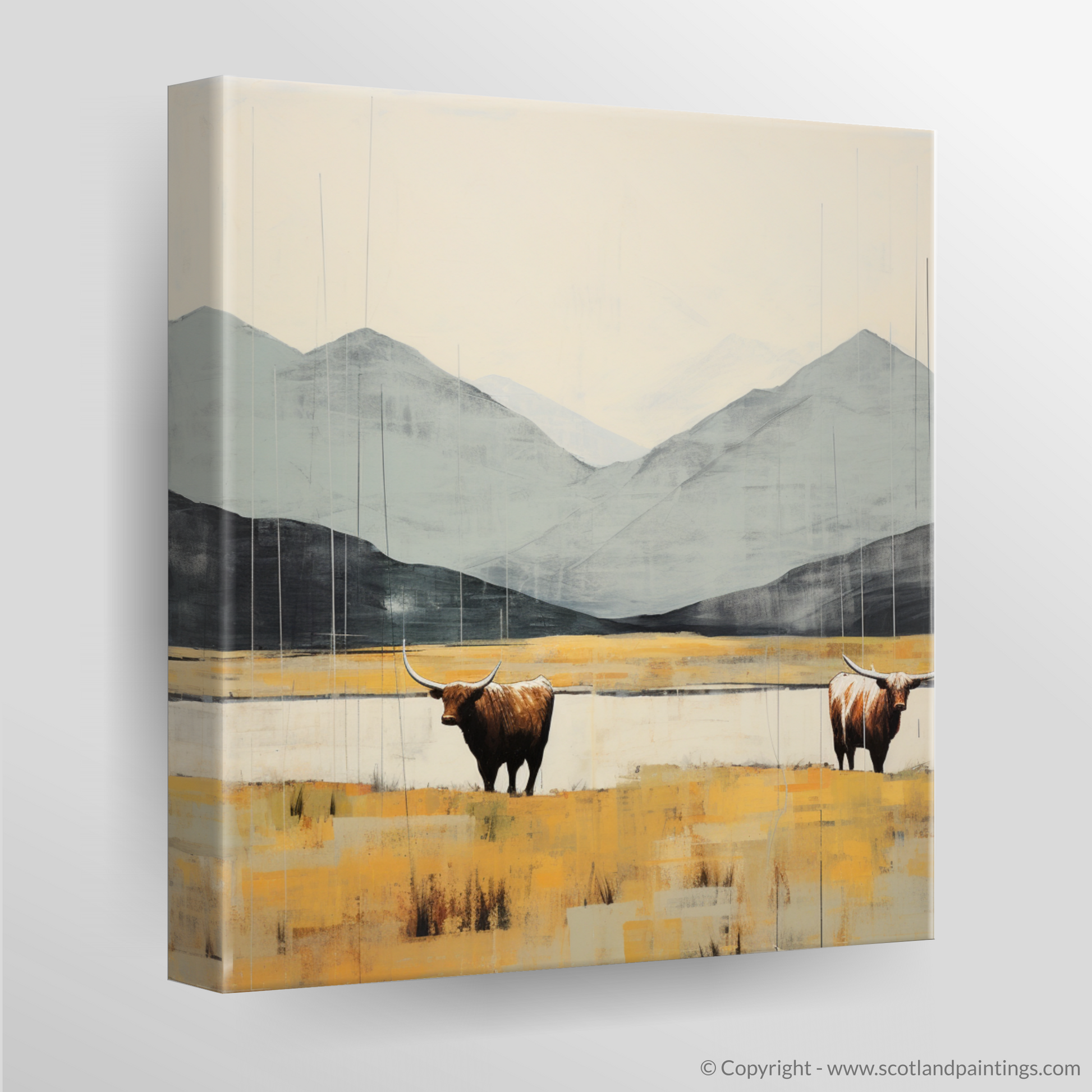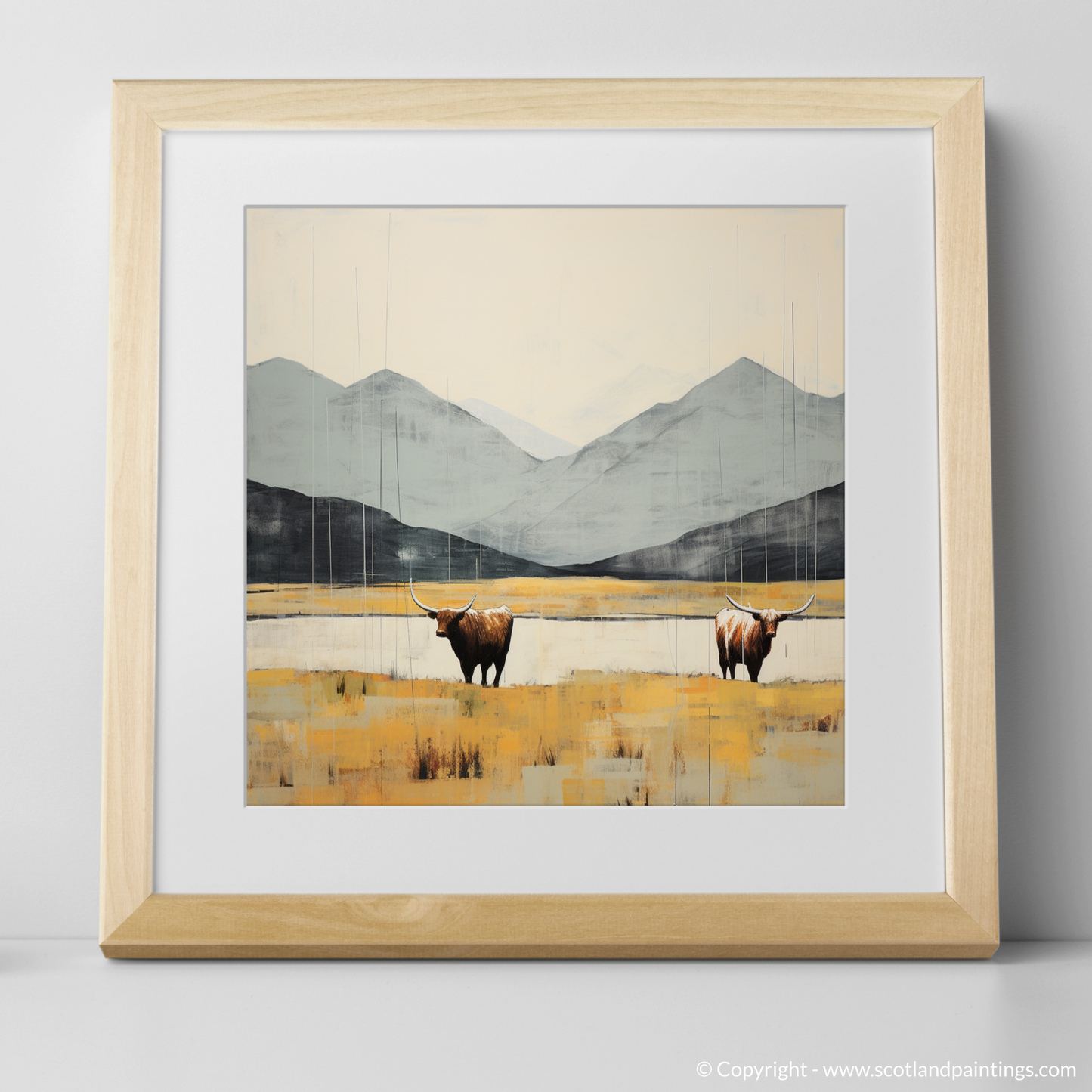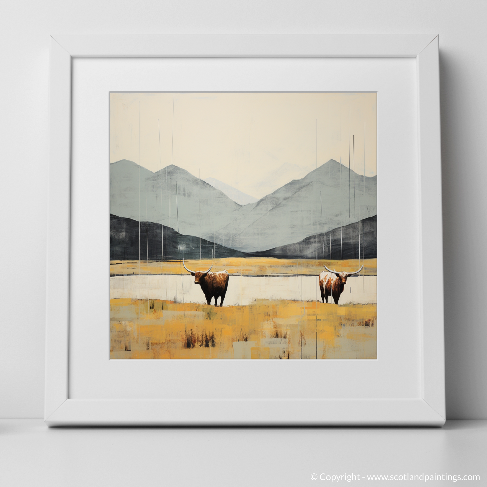 The print features two majestic Highland cows, rendered in rich, textured brushstrokes that convey their shaggy fur and iconic, sweeping horns. These gentle giants stand as sentinels in a sparse field of muted gold and amber tones, reminiscent of the bracken and heath that adorn the Highlands. The cows are positioned with ample breathing room around them, an artistic choice that amplifies their stoic presence and the expansive openness of the valley.